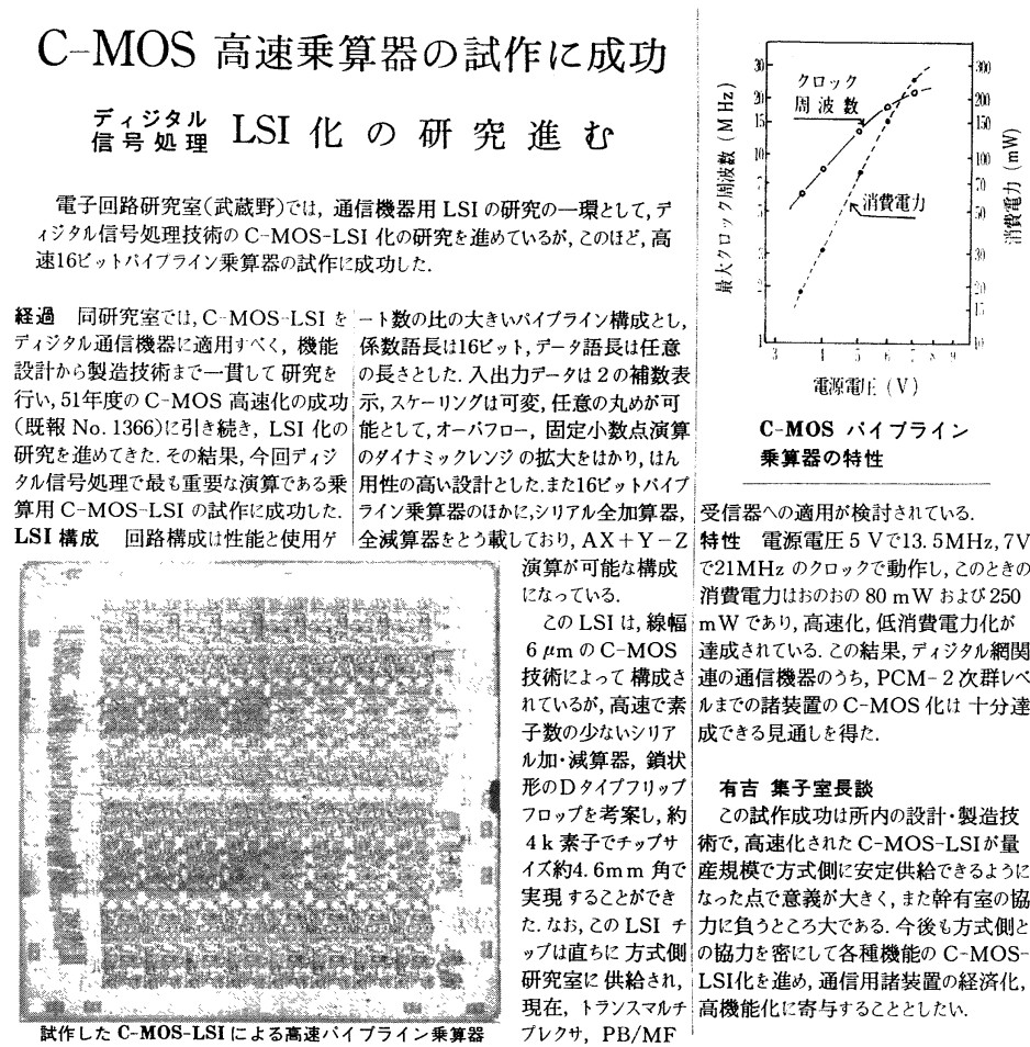 CMOS 16bit パイプライン乗算器LSI 1977.6.28 |