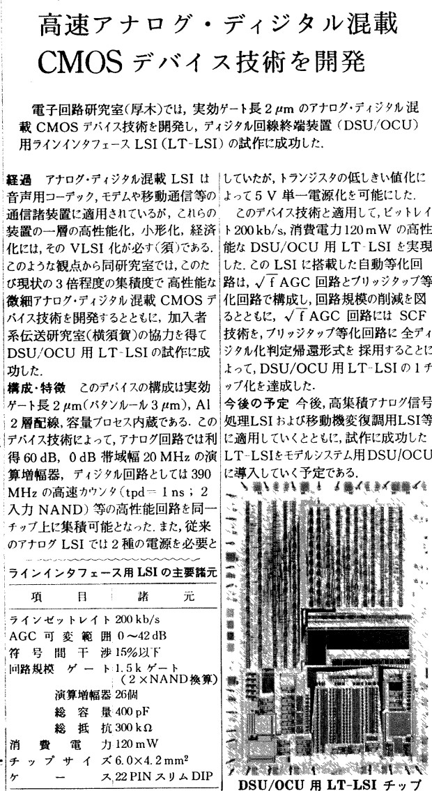 CMOS デジタル加入者回線終端(LT)LSI (回線終端装置DSU/OCU搭載) 1984.3.24 |