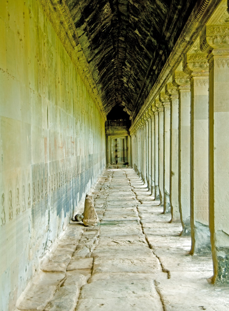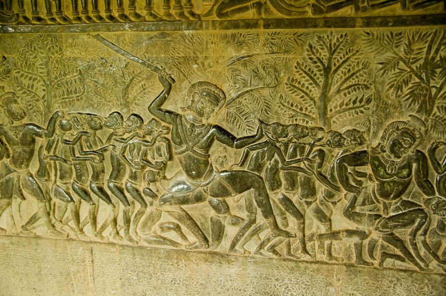 ・第一回廊は東西200m、南北180mで、多くの彫刻が施されている。西面南には、インド叙事詩『マハーバーラタ』の場面で、左から攻めるパーンダヴァ族と右から攻めるカウラヴァ族の軍が描かれている。西面北には、『ラーマーヤナ』の説話があり、ラーマ王子と猿が魔王ラーヴァナと戦う場面が大きい。南面西は「歴史回廊」と呼ばれ、スーリヤヴァルマン2世と大臣、将軍、兵士などが彫られている。南面東は「天国と地獄」と呼ばれ、上段に天国へ昇った人々、中段に閻魔大王らと裁きを待つ人々、下段に地獄へ落ちた人々が彫られている。東面南には乳海攪拌の様子が彫られている。