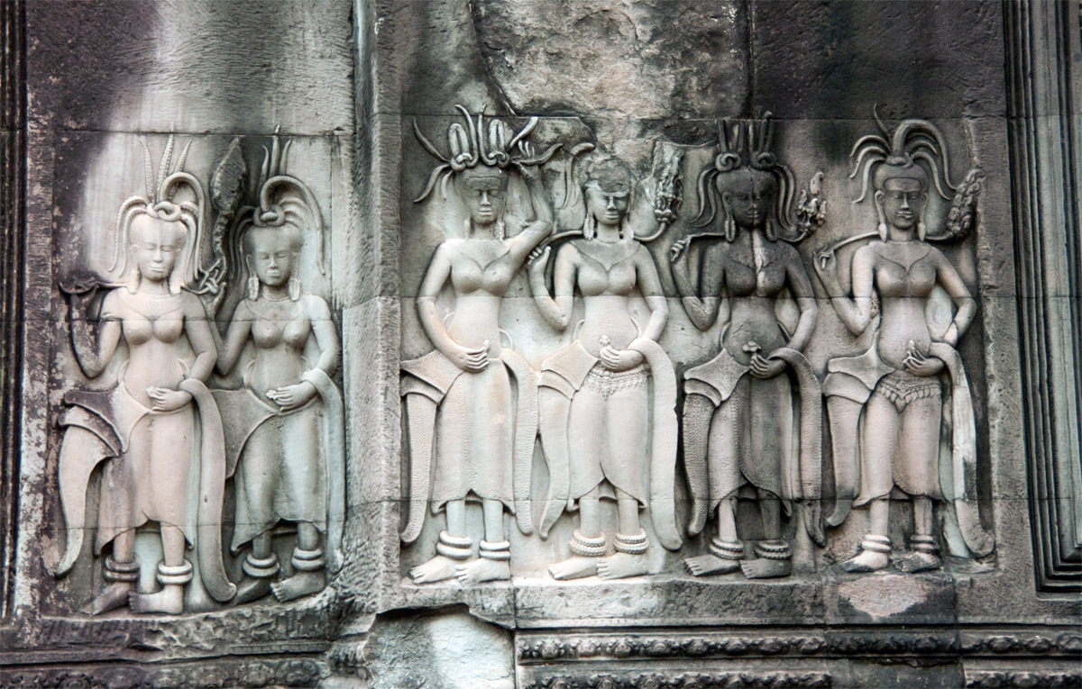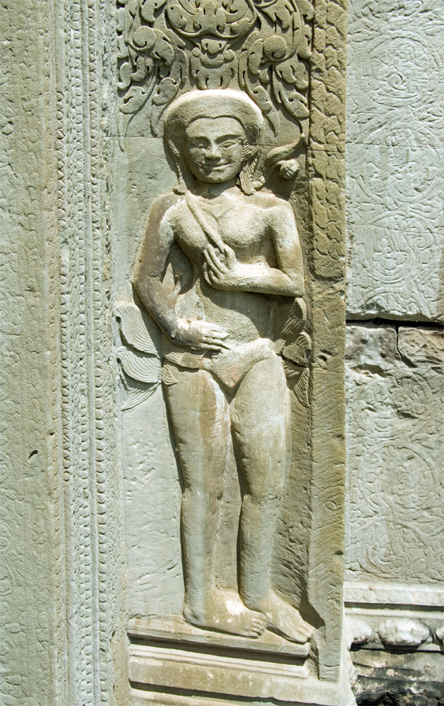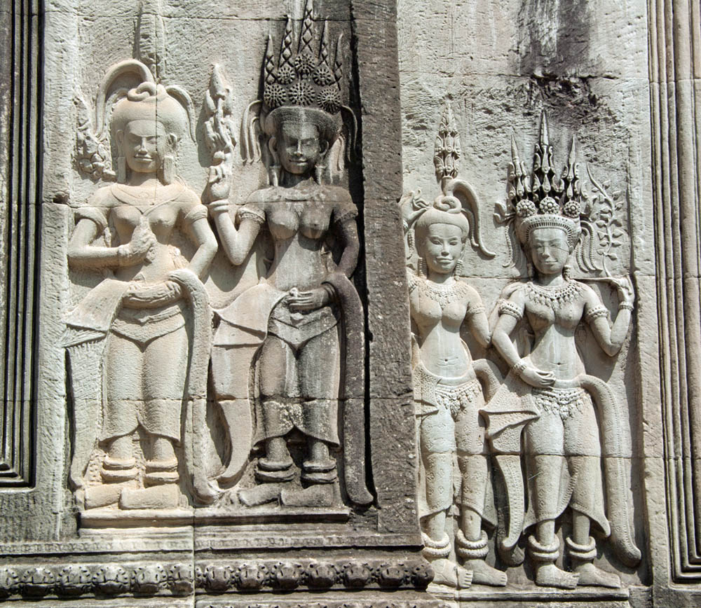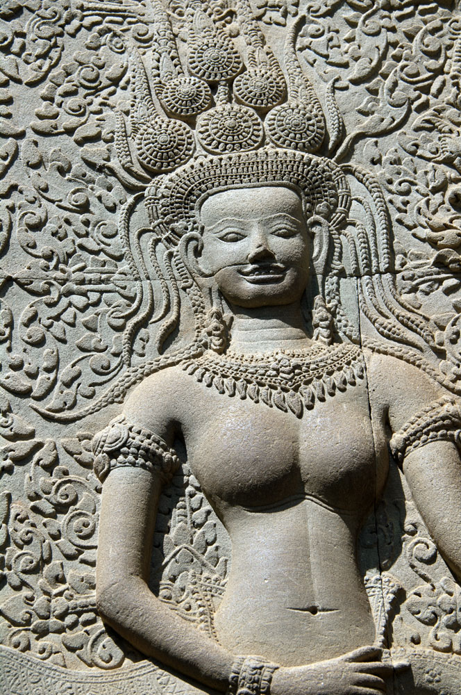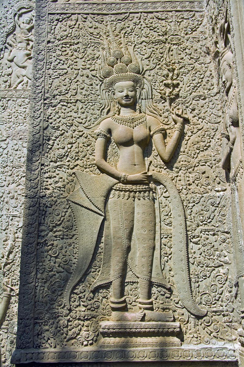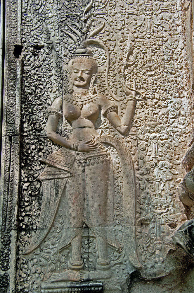 デバターは宮廷の女官をモデルにした女神のレリーフで,アンコールワット以外のほとんどの遺跡でも見られアンコール遺跡の魅力の一つです。数え切れないほど沢山あるが同じ容姿のものは一つもない。