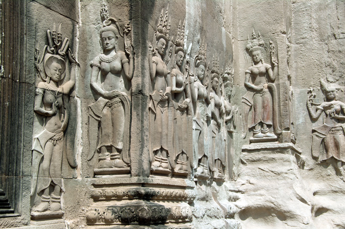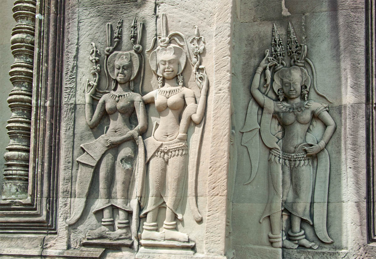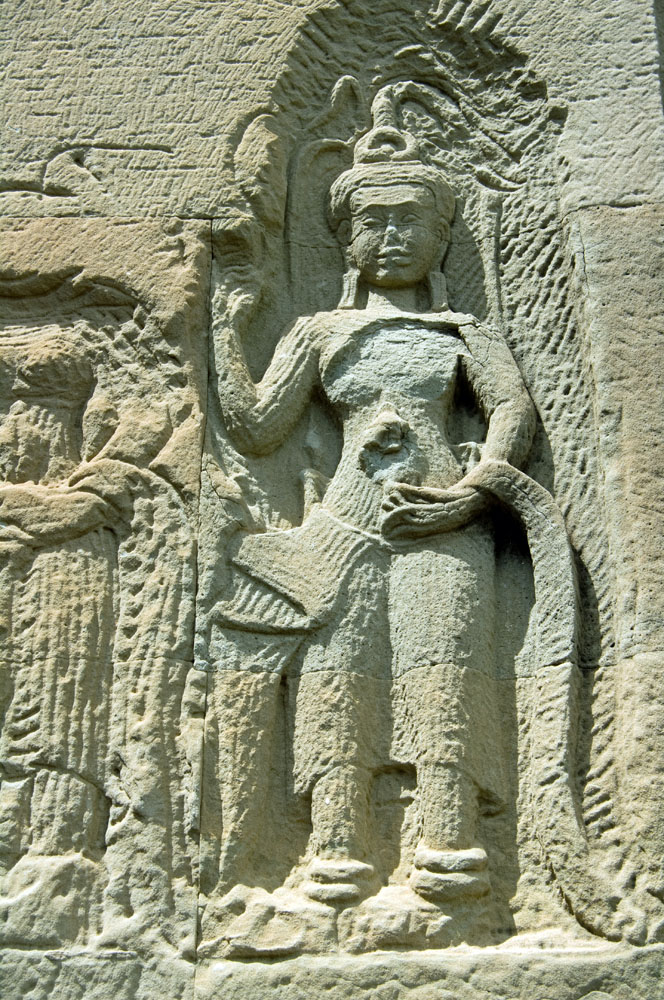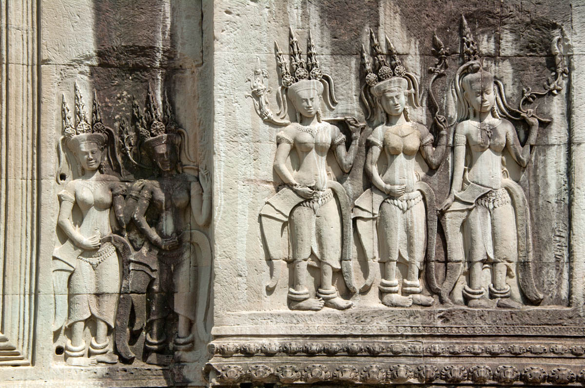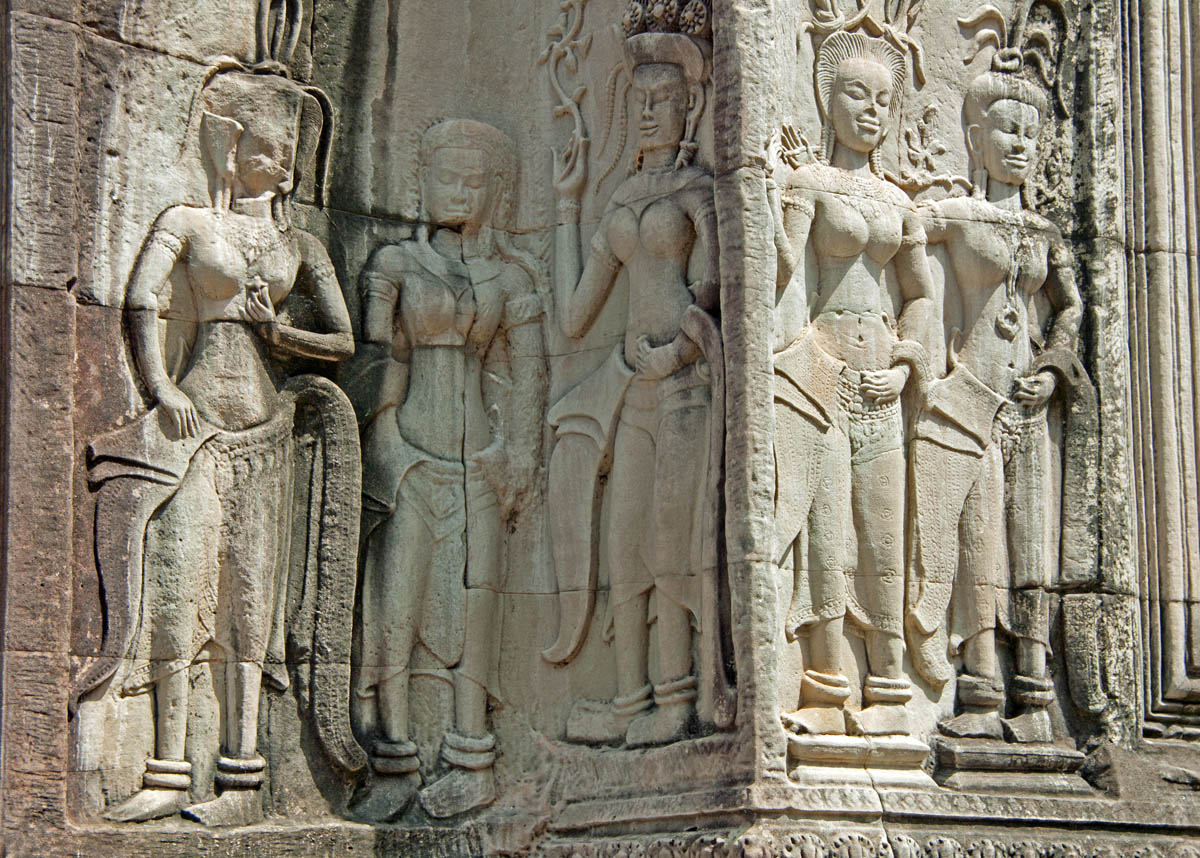 デバターは宮廷の女官をモデルにした女神のレリーフで,アンコールワット以外のほとんどの遺跡でも見られアンコール遺跡の魅力の一つです。数え切れないほど沢山あるが同じ容姿のものは一つもない。