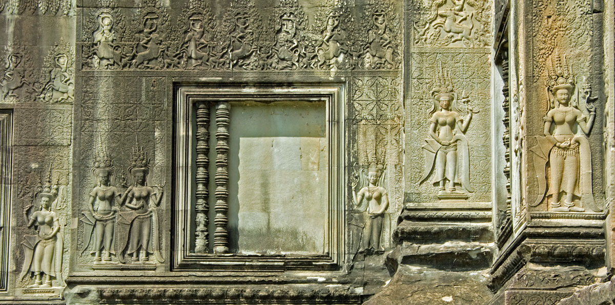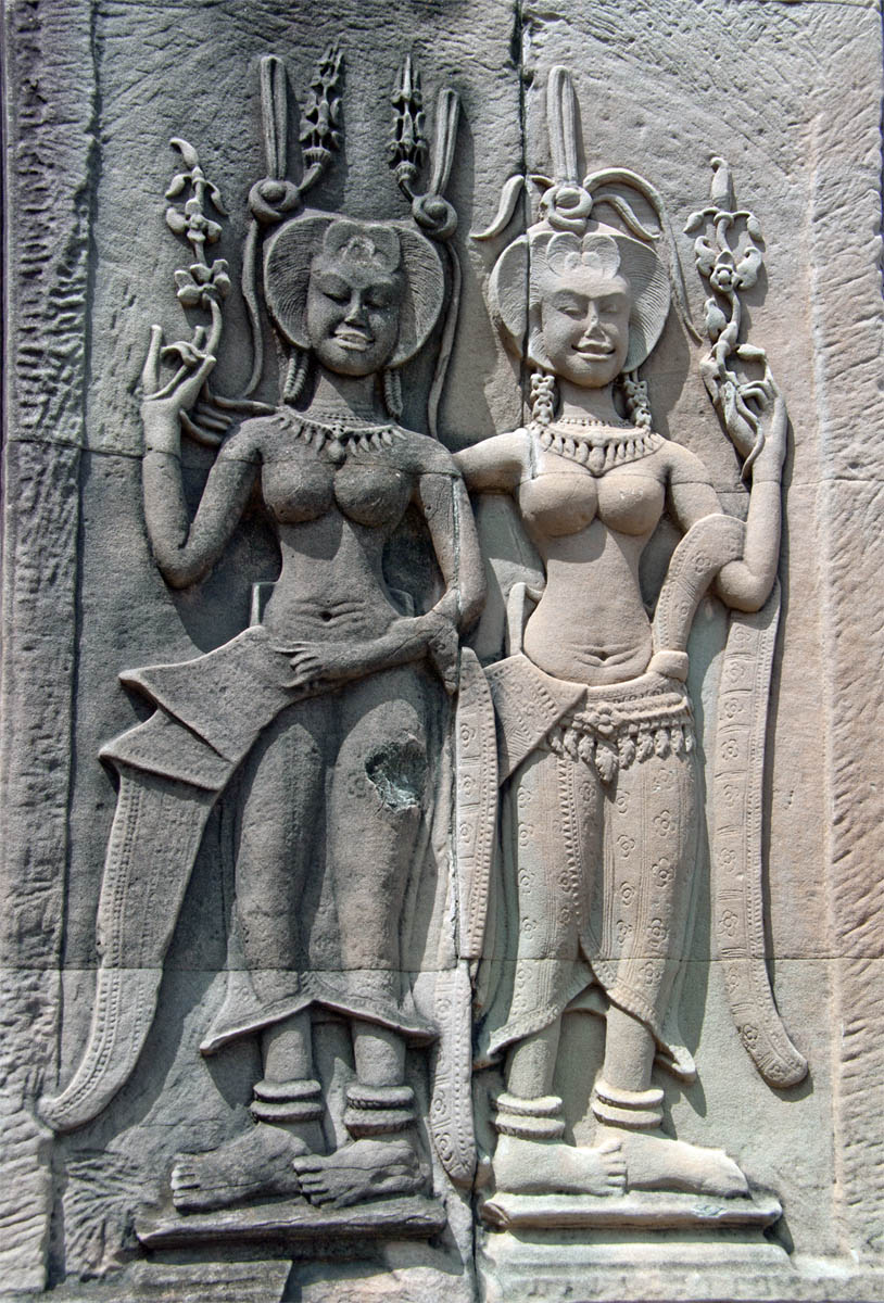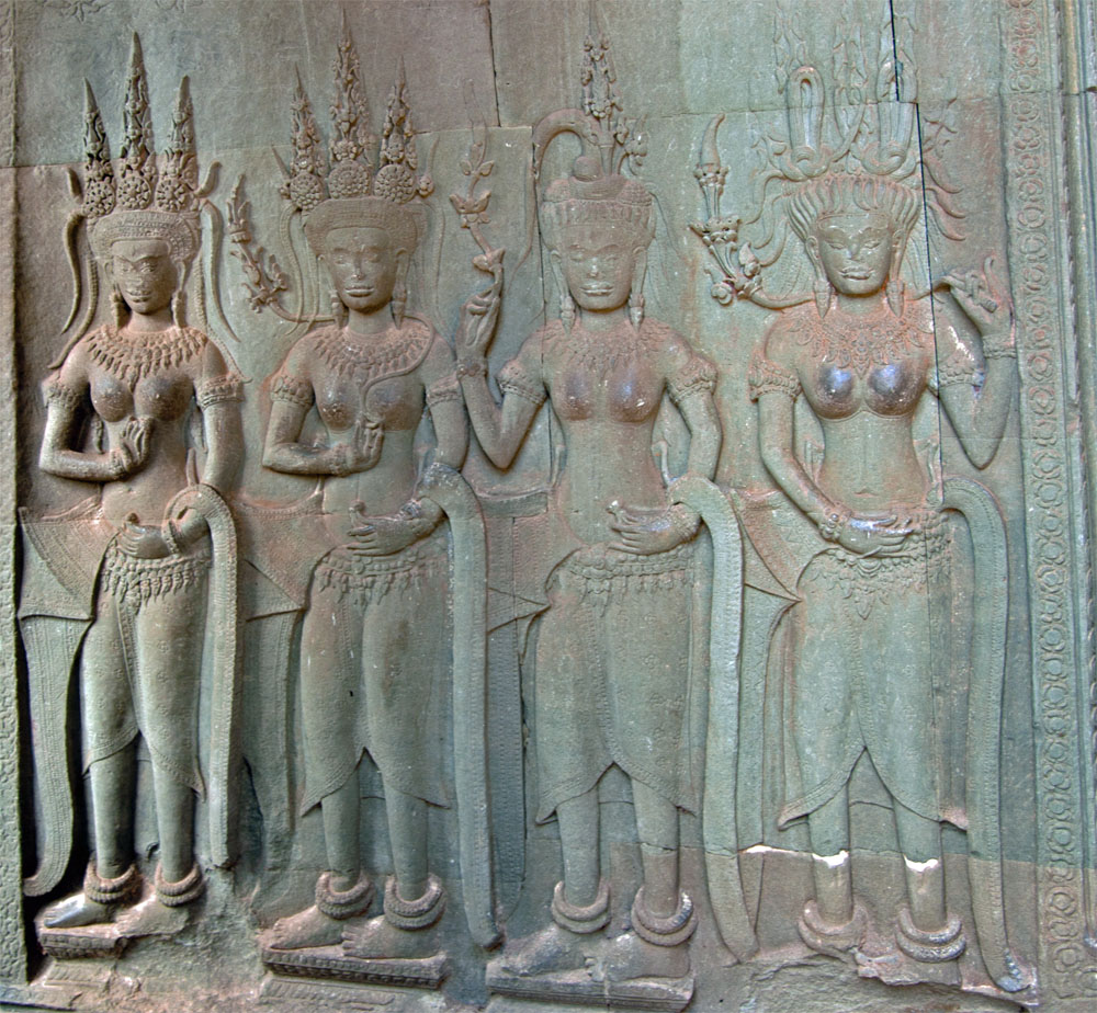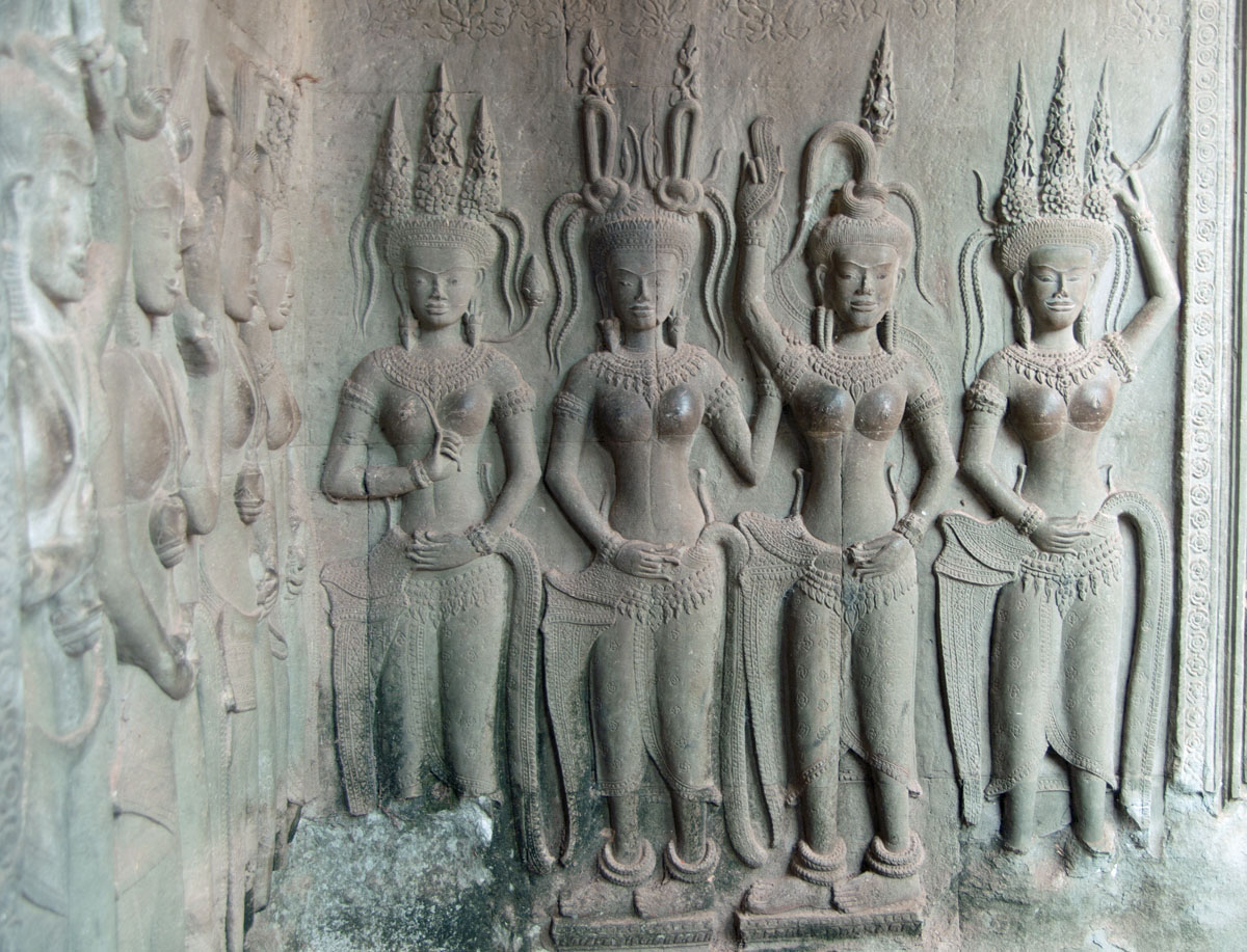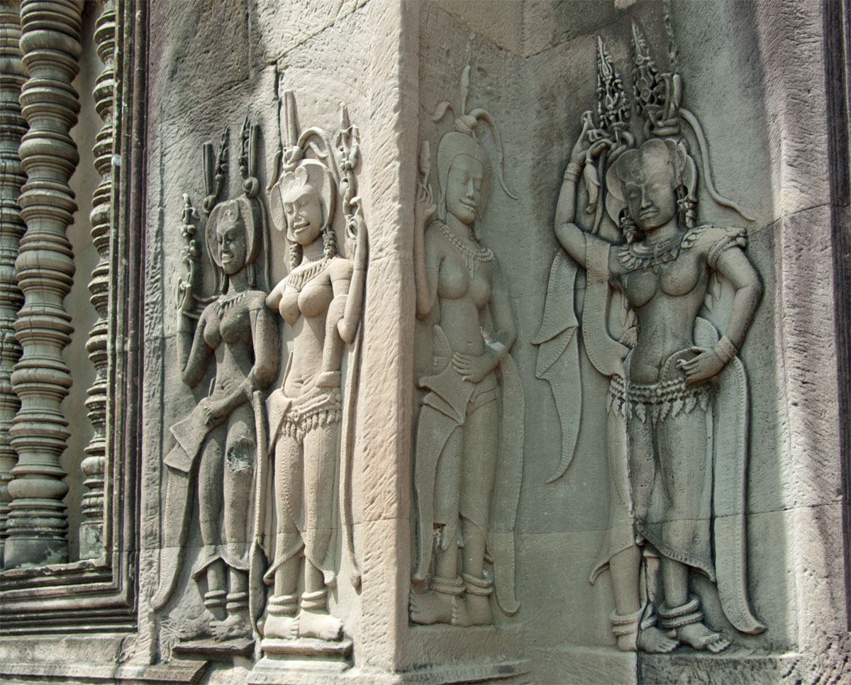 デバターは宮廷の女官をモデルにした女神のレリーフで,アンコールワット以外のほとんどの遺跡でも見られアンコール遺跡の魅力の一つです。数え切れないほど沢山あるが同じ容姿のものは一つもない。