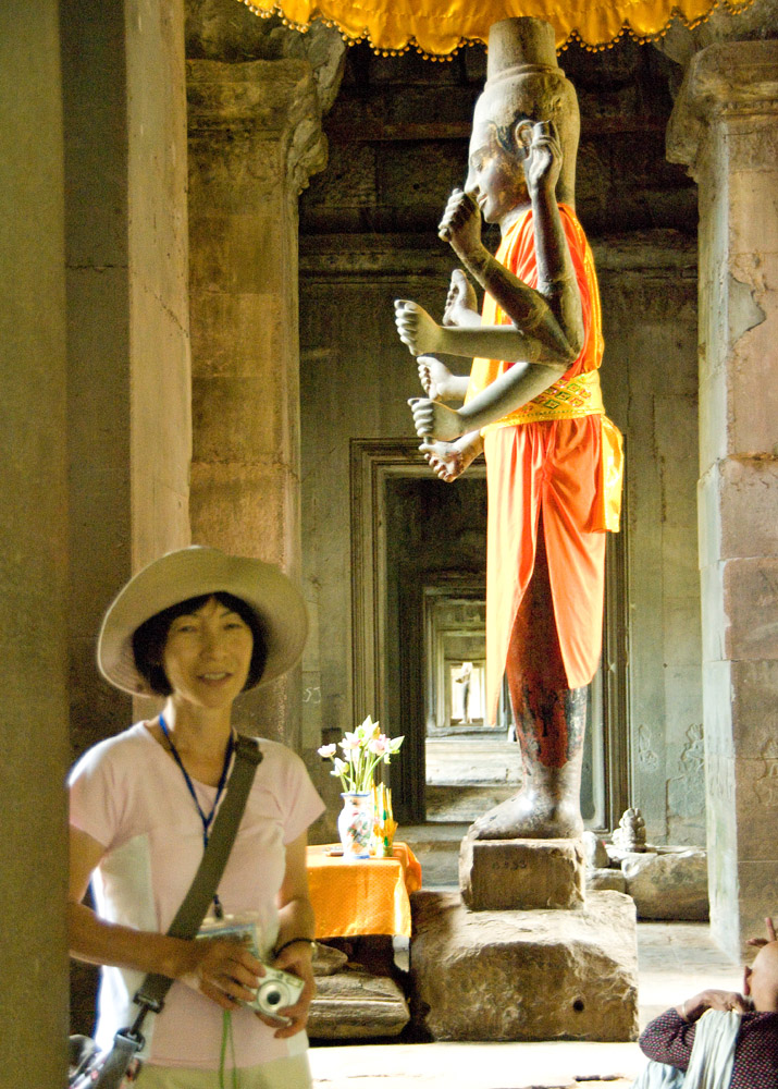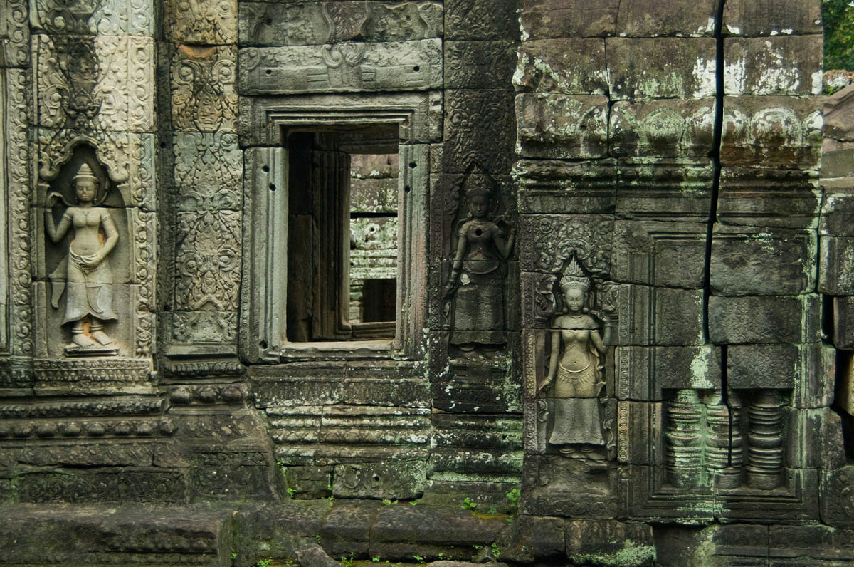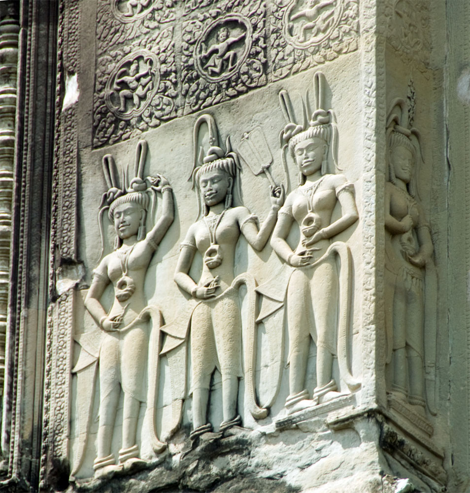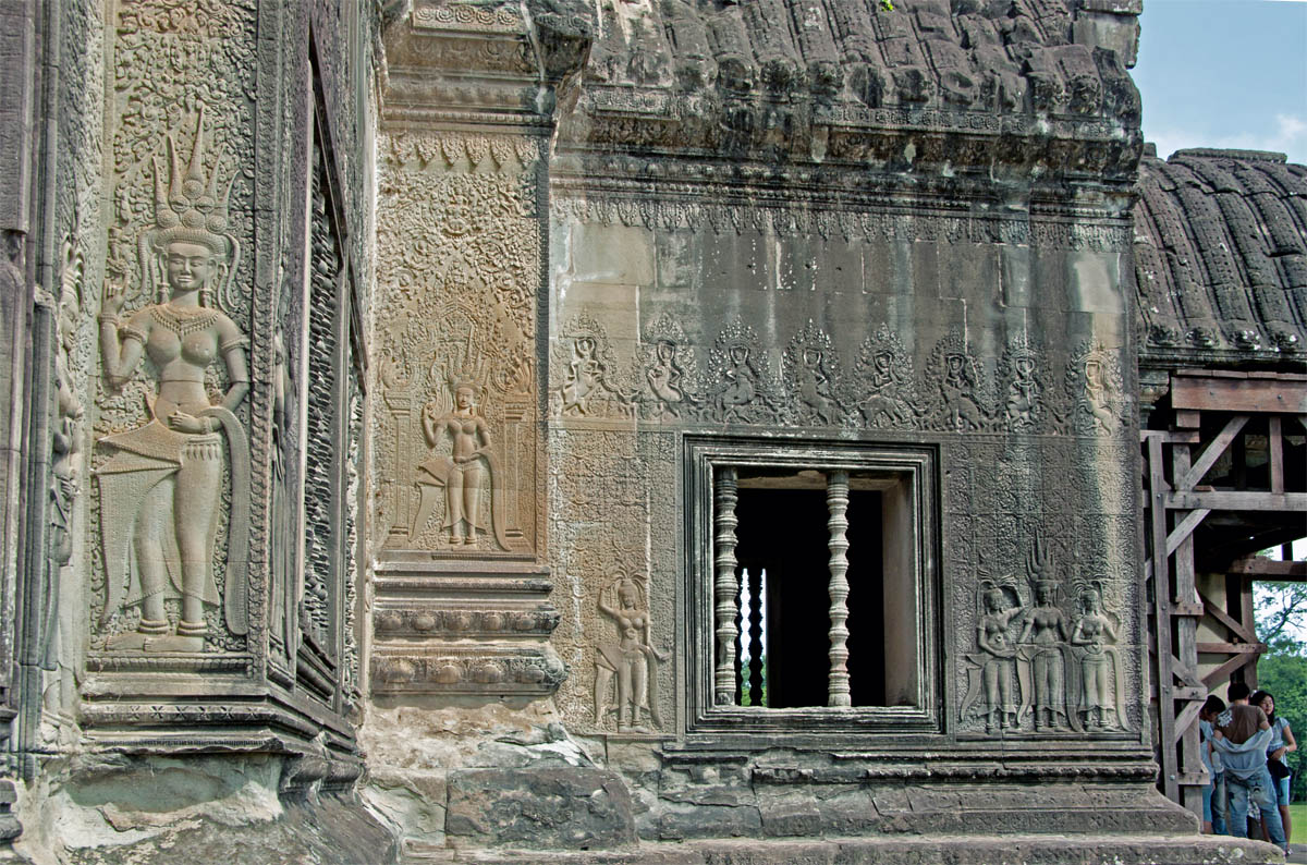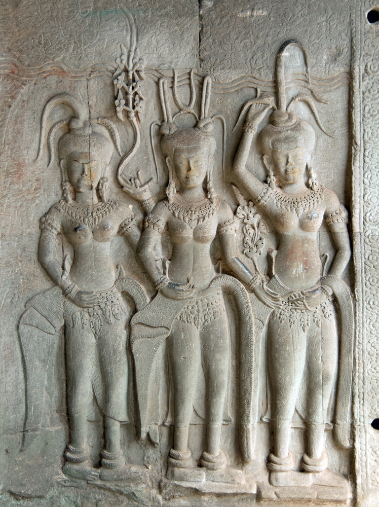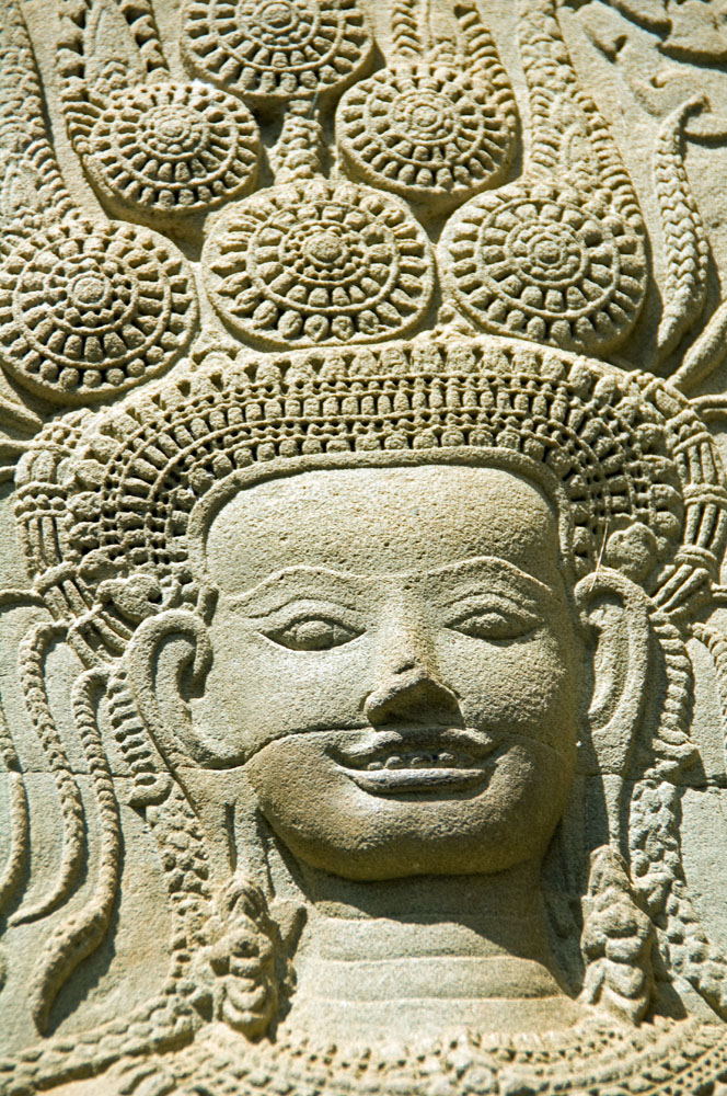 デバターは宮廷の女官をモデルにした女神のレリーフで,アンコールワット以外のほとんどの遺跡でも見られアンコール遺跡の魅力の一つです。数え切れないほど沢山あるが同じ容姿のものは一つもない。