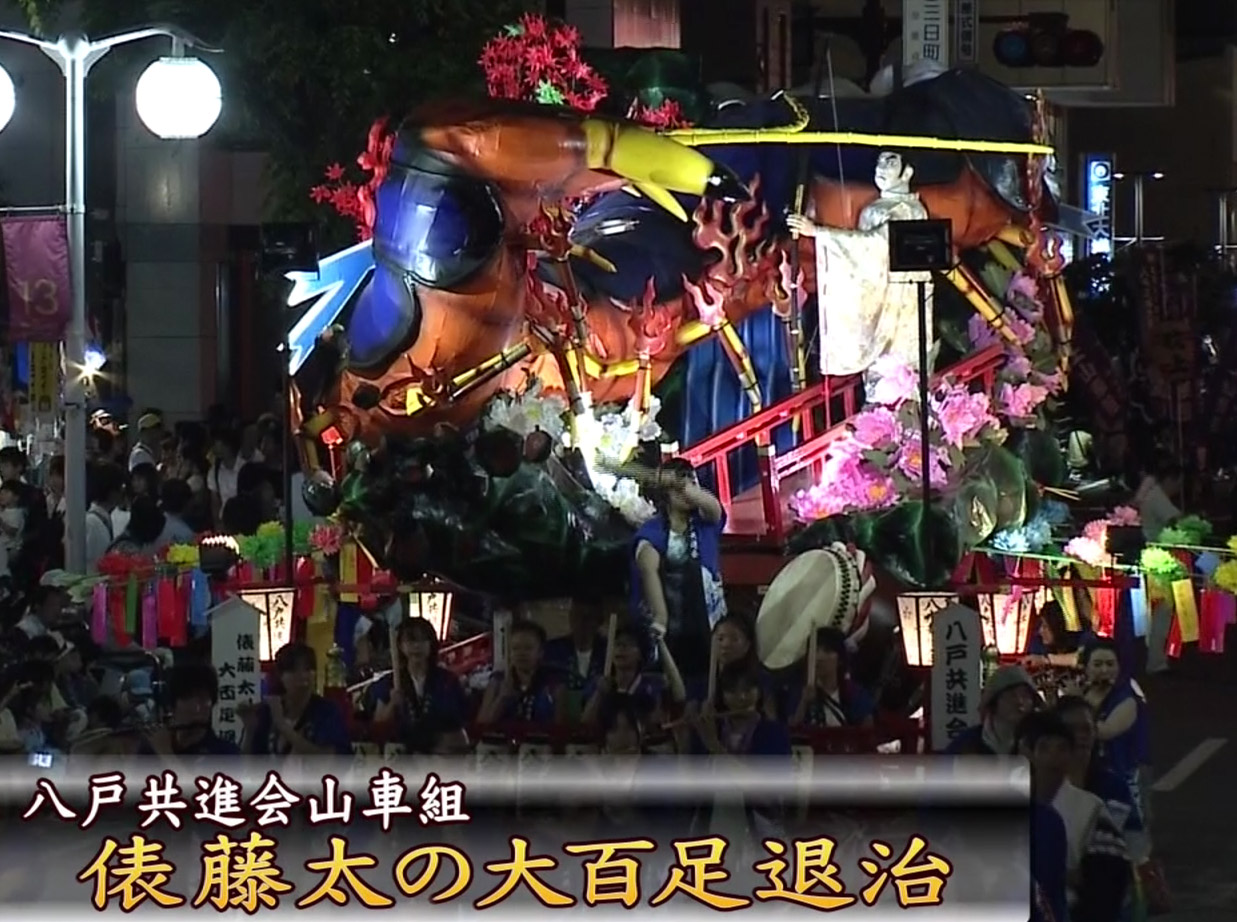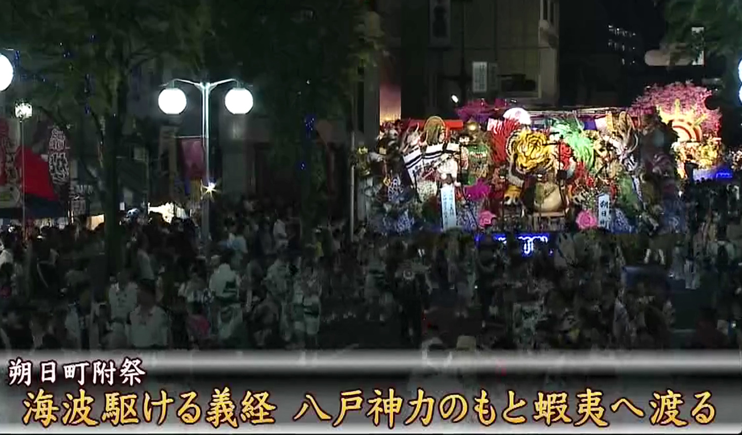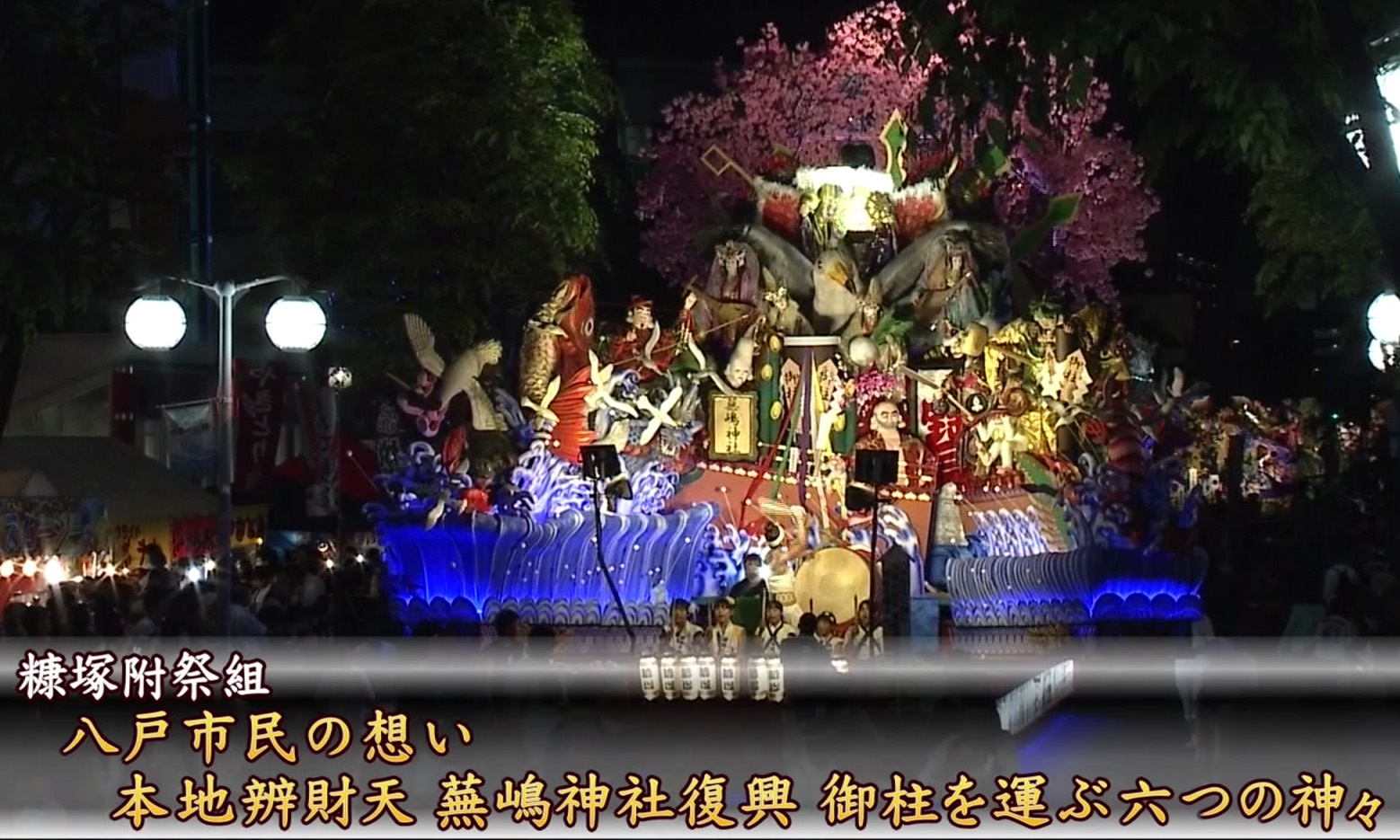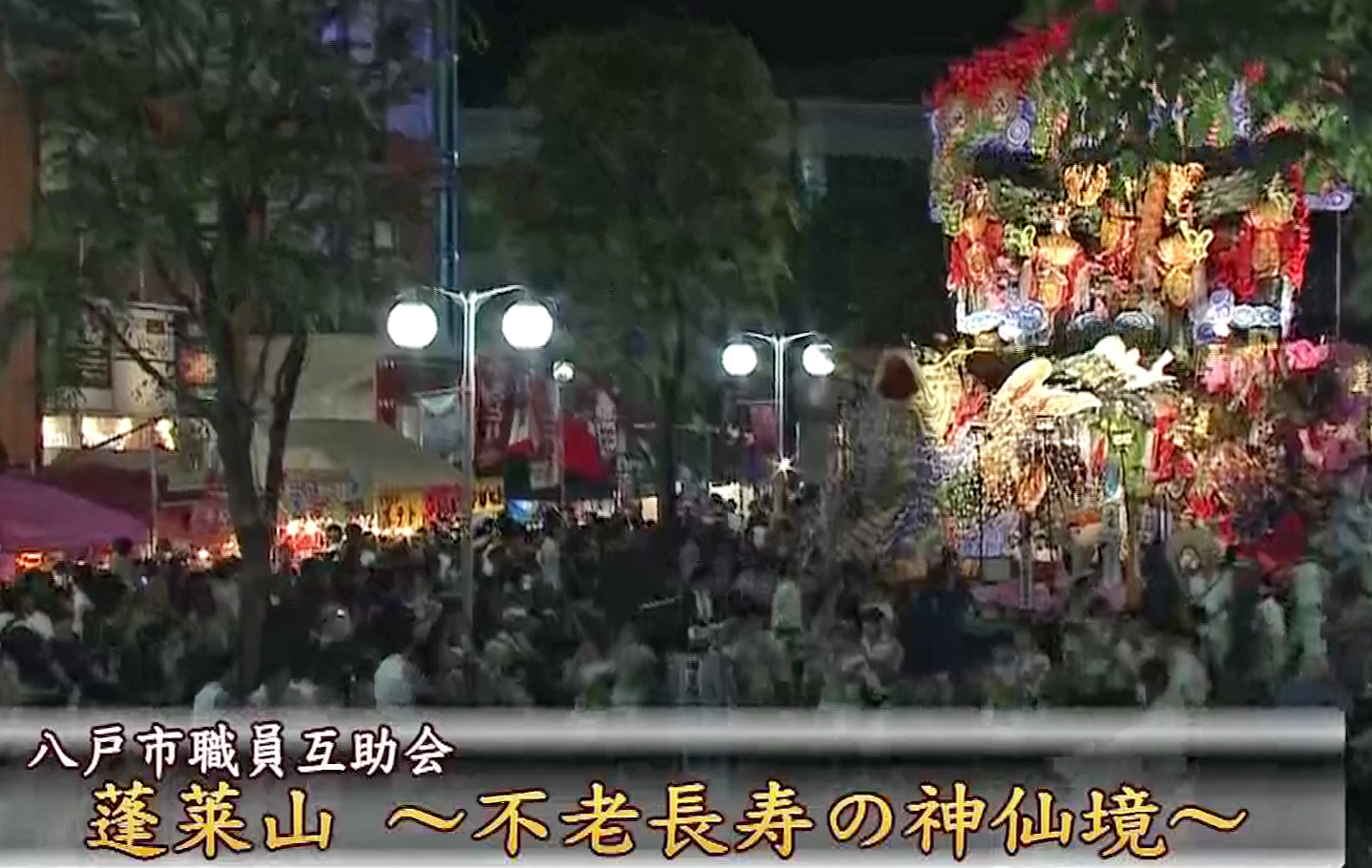 八戸三社大祭は約300年の歴史と伝統を誇る東北屈指の華やかな祭り. 「三社」とは、八戸市内の法霊山龗(おがみ)神社・長者山新羅神社・神明宮で、三社の神輿行列と市内各町の山車組の27台の華麗な人形山車が市街中心地を巡行する.