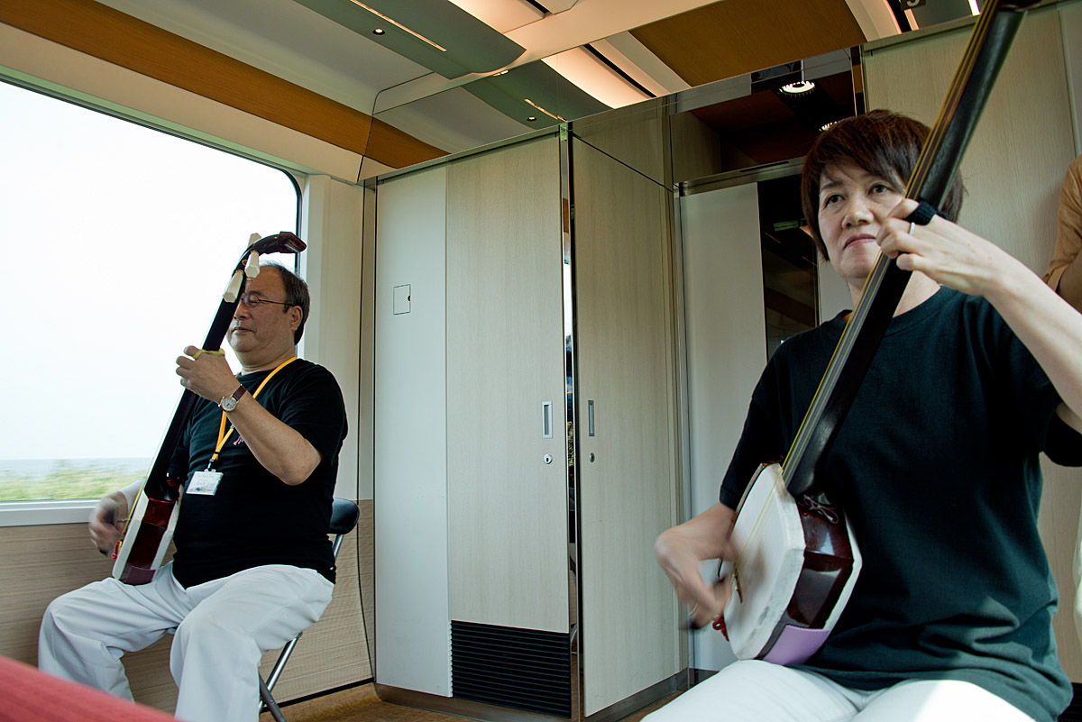 車内で三味線の演奏