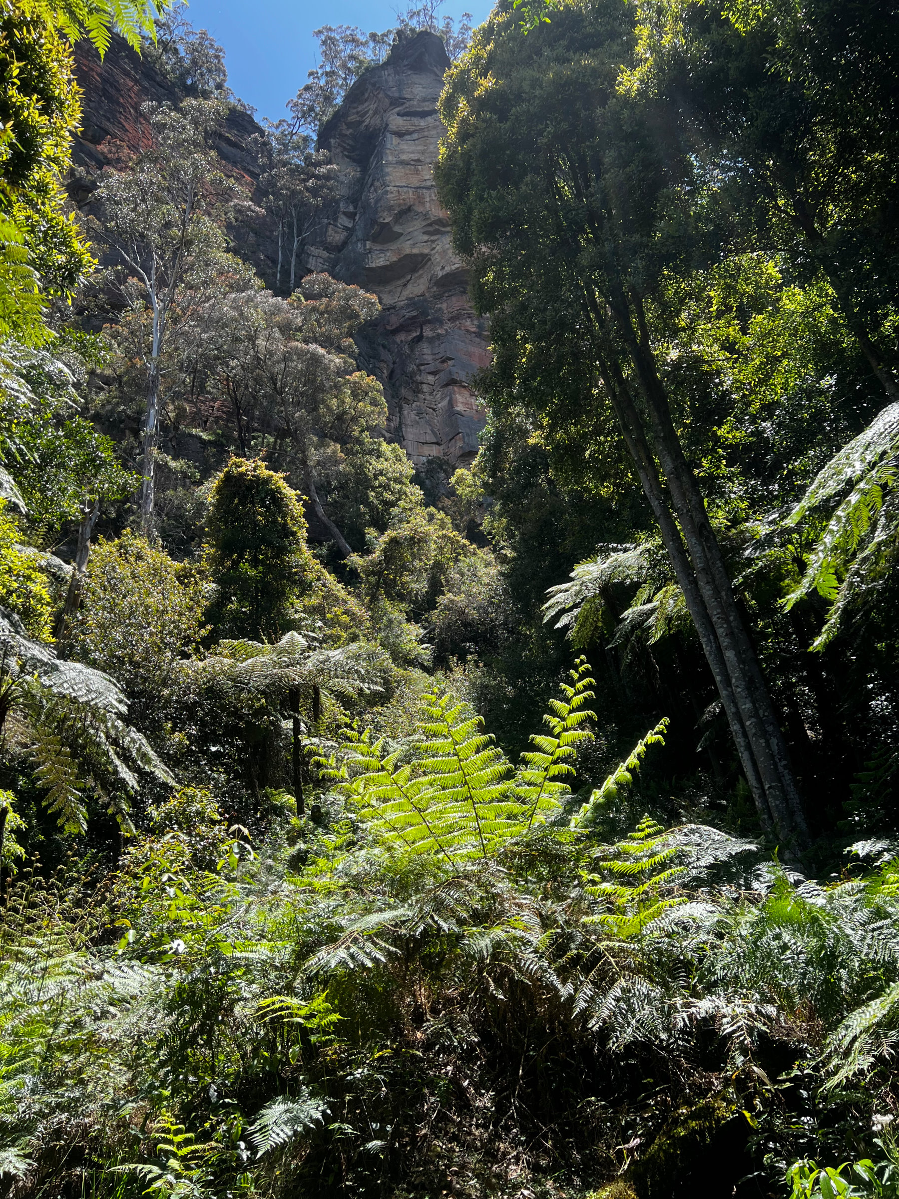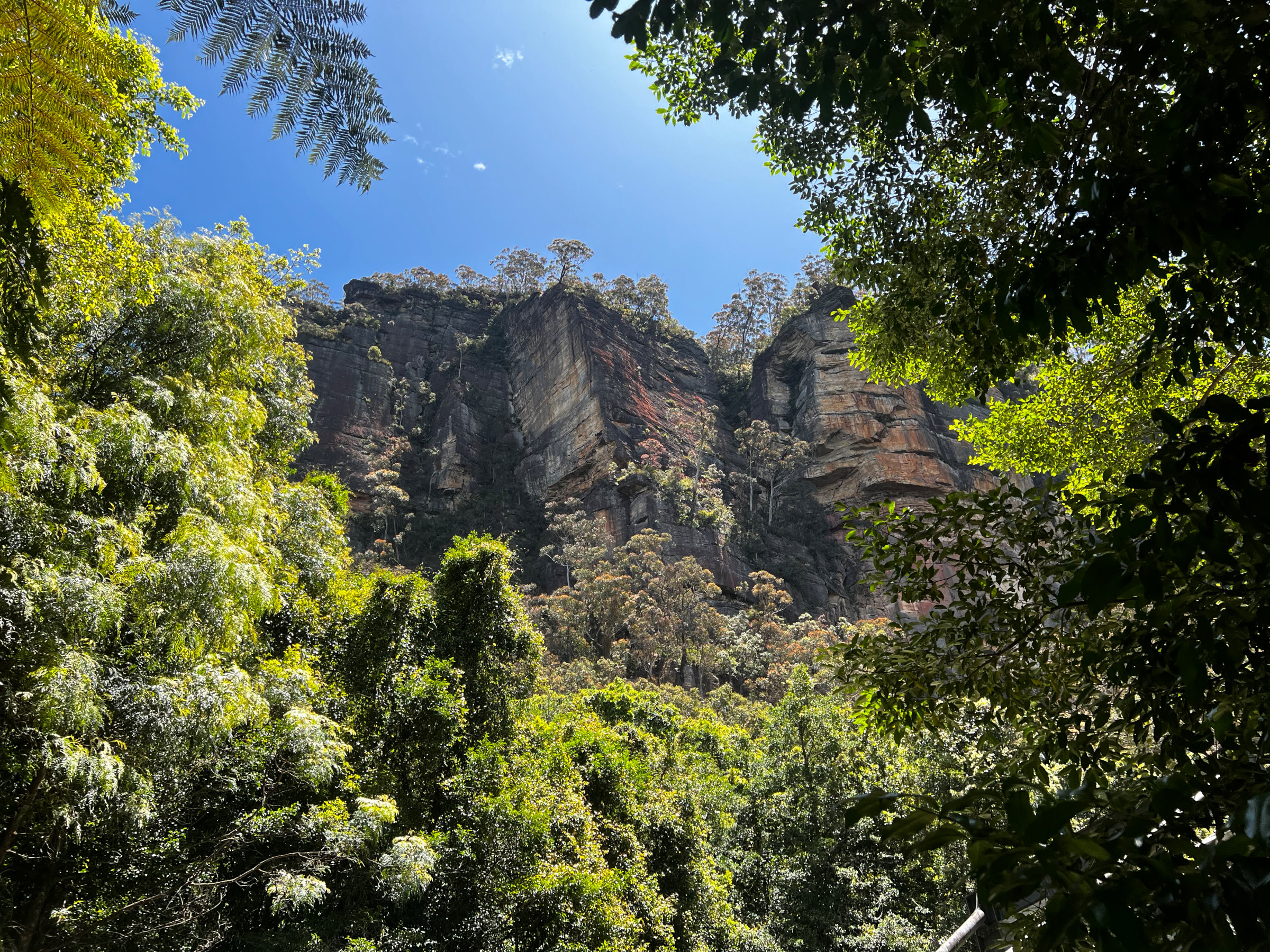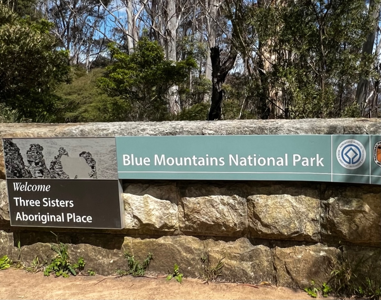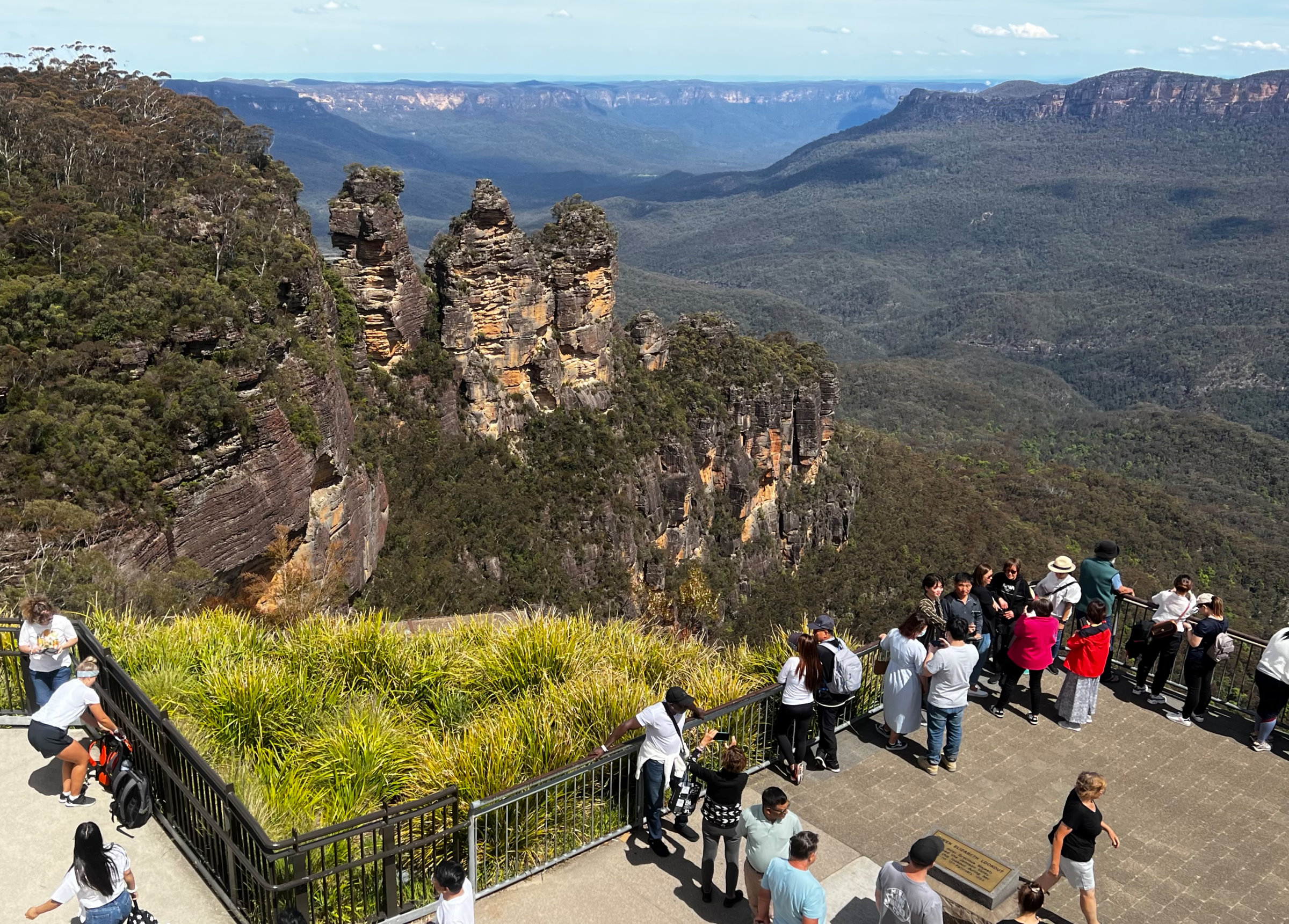 オーストラリアのグランドキャニオンと言われる。2000年に世界遺産に登録された。1億年以上前に海に堆積した厚さ1000mの砂の層が岩になり、大陸変動で隆起し、長年に渡る川の水で侵食されてジャミソン渓谷ができた。ここに生えるユーカリの葉が持つ油脂が気化して、日光に照らされて山と谷が青く光ることが名の由来。