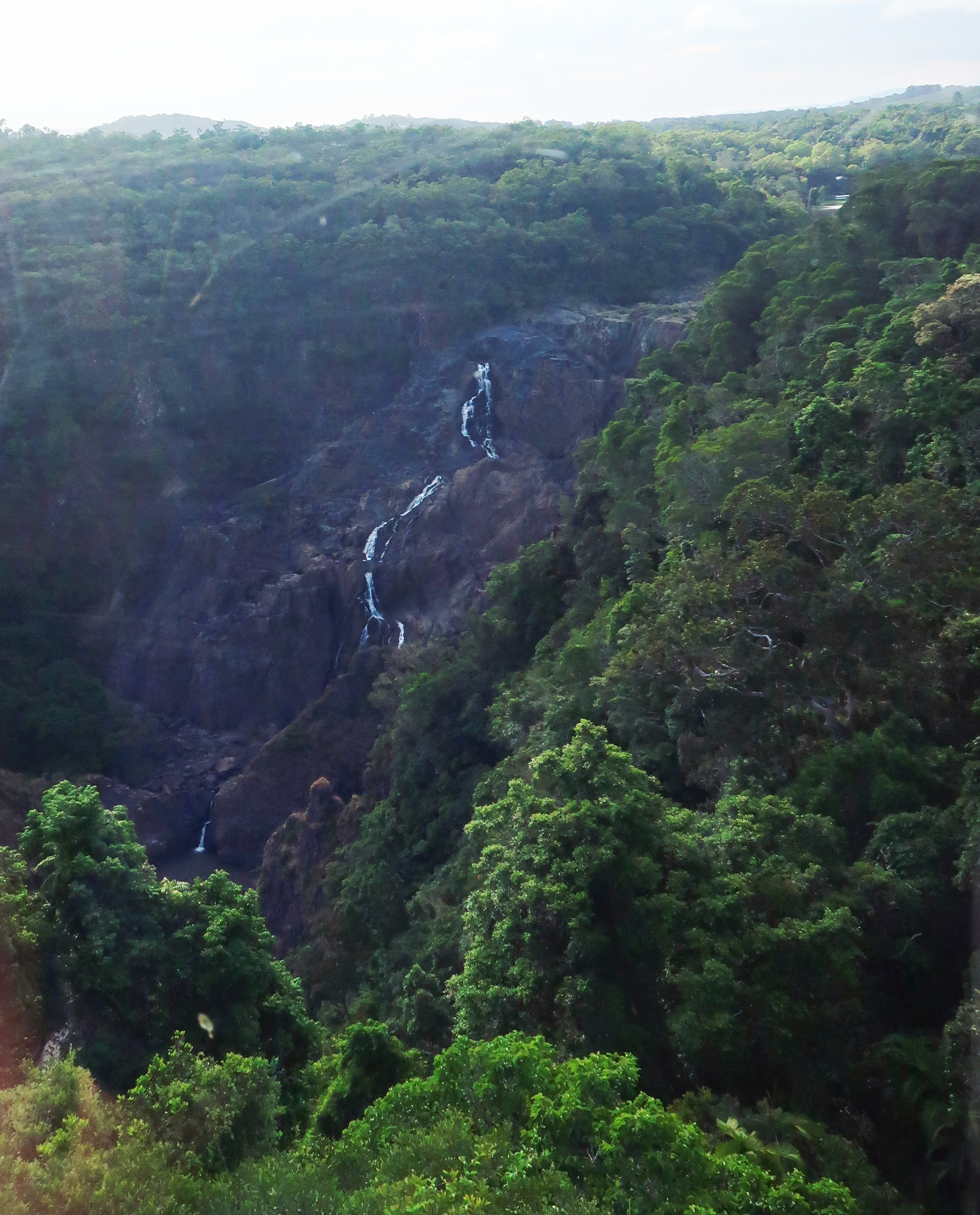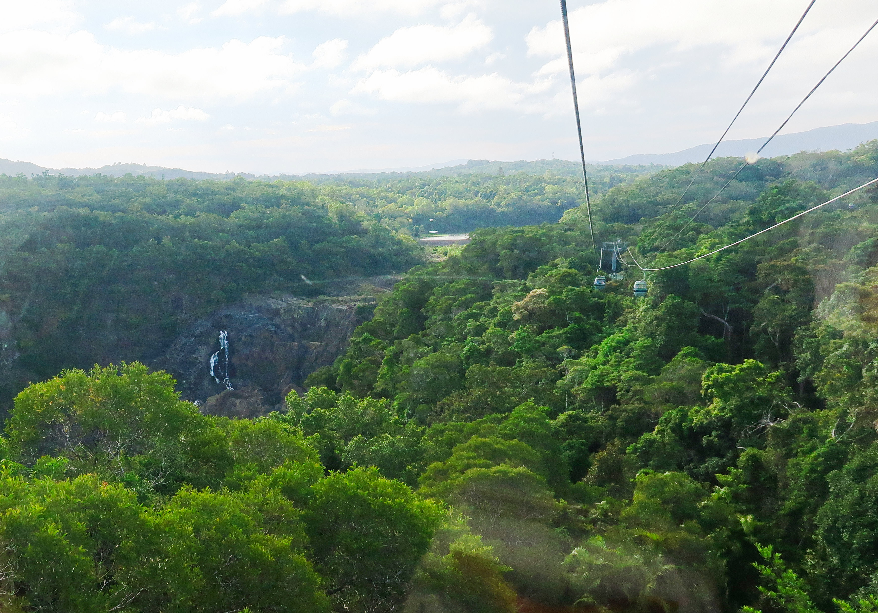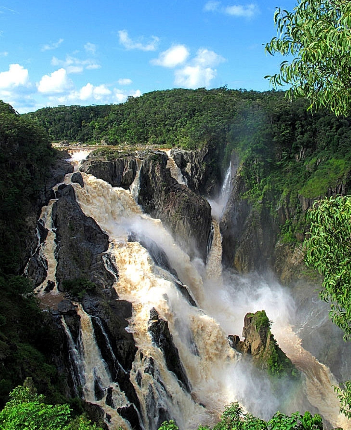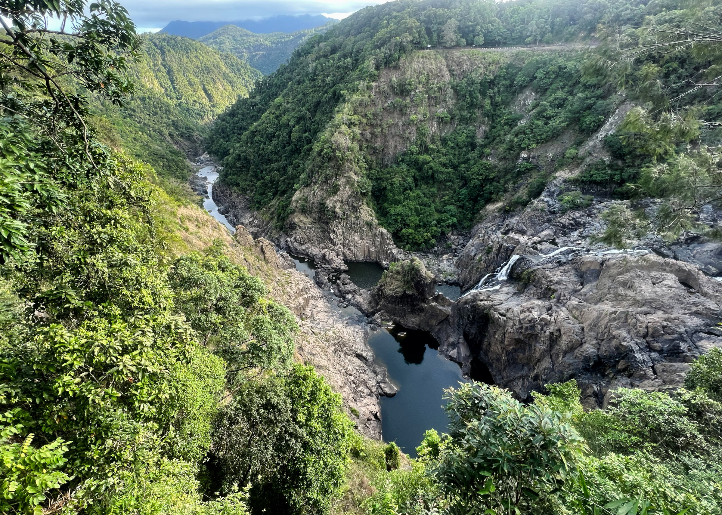 オーストラリアのグランドキャニオンと言われる。2000年に世界遺産に登録された。1億年以上前に海に堆積した厚さ1000mの砂の層が岩になり、大陸変動で隆起し、長年に渡る川の水で侵食されてジャミソン渓谷ができた。ここに生えるユーカリの葉が持つ油脂が気化して、日光に照らされて山と谷が青く光ることが名の由来。