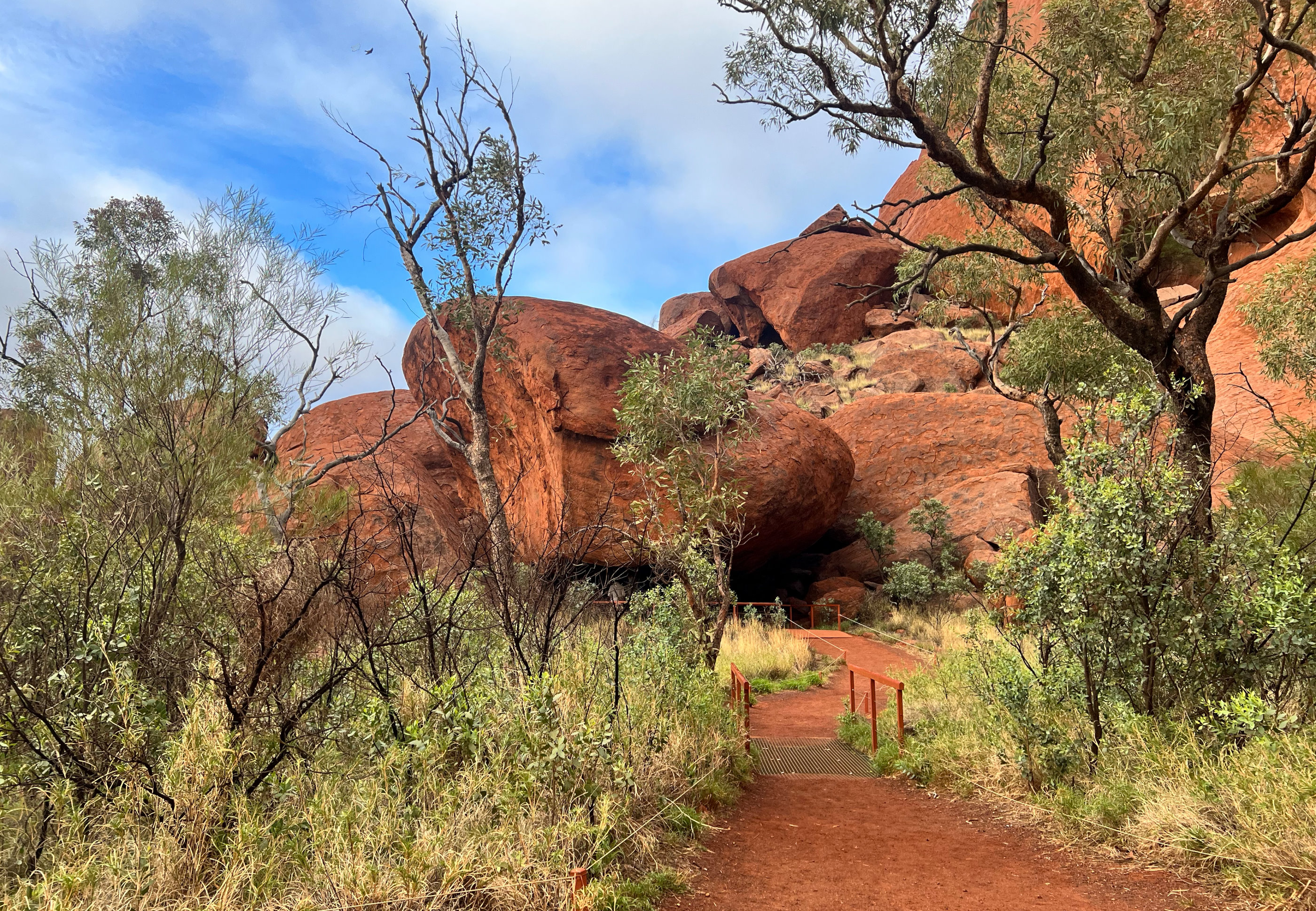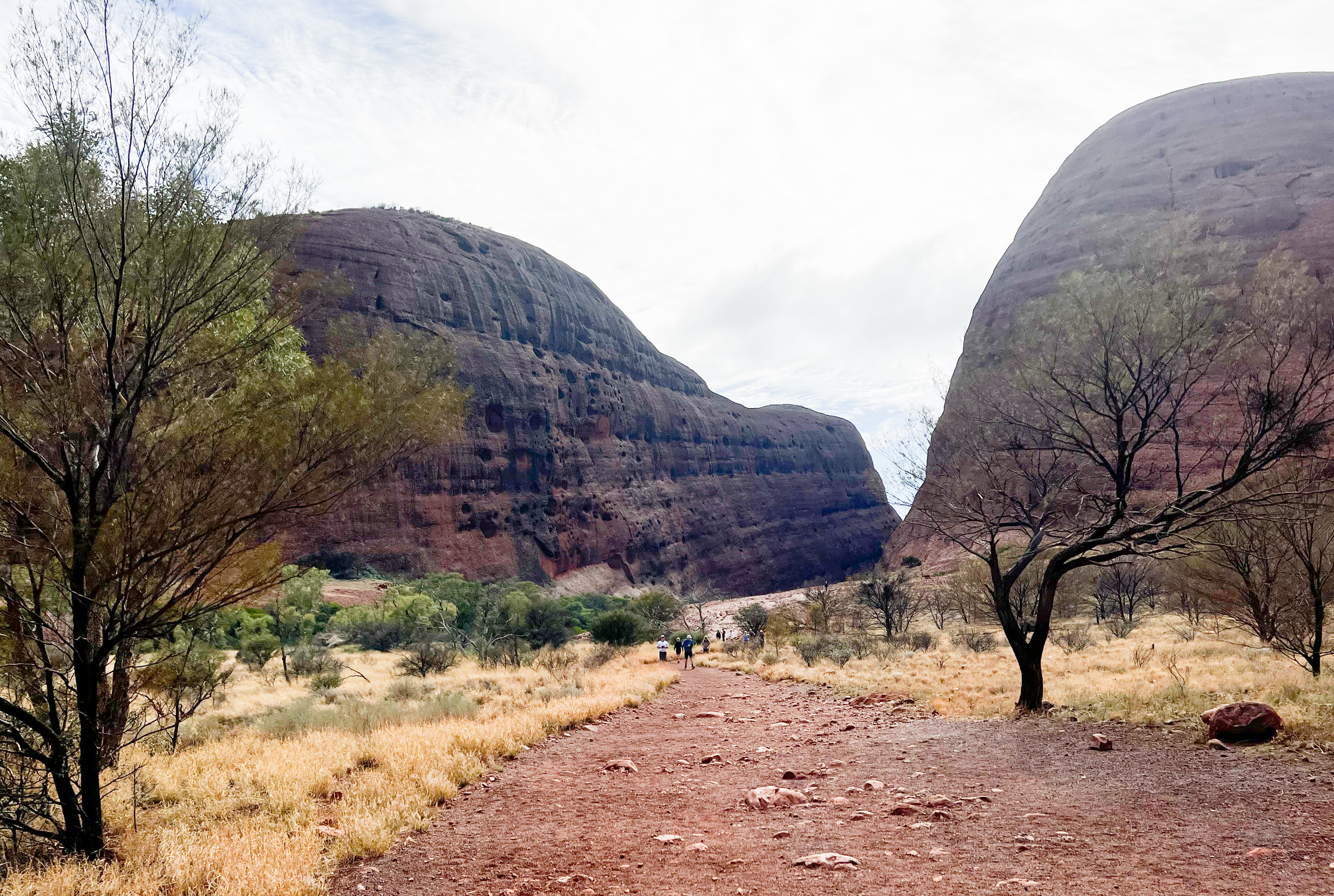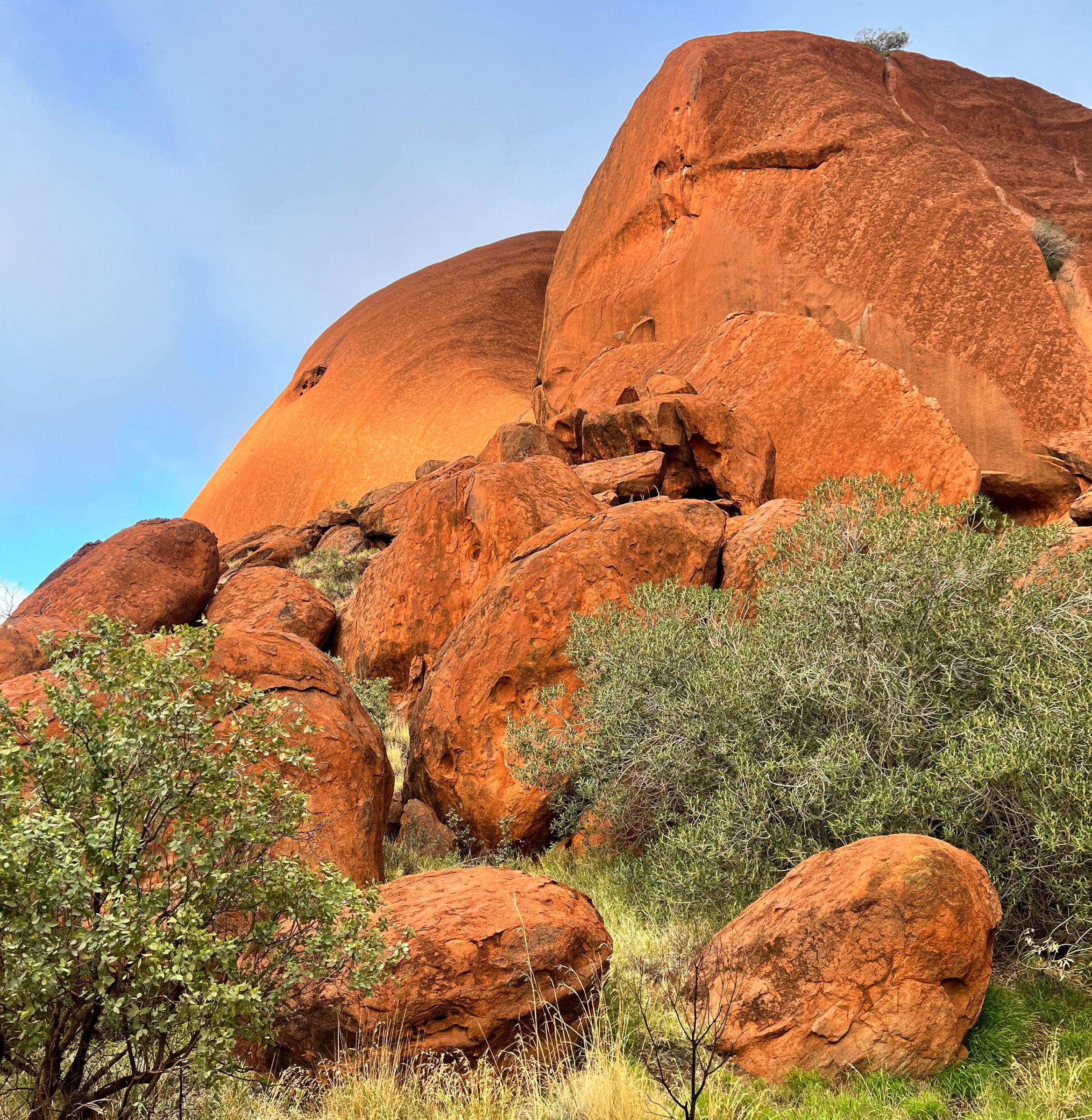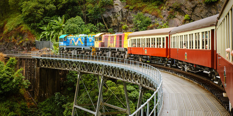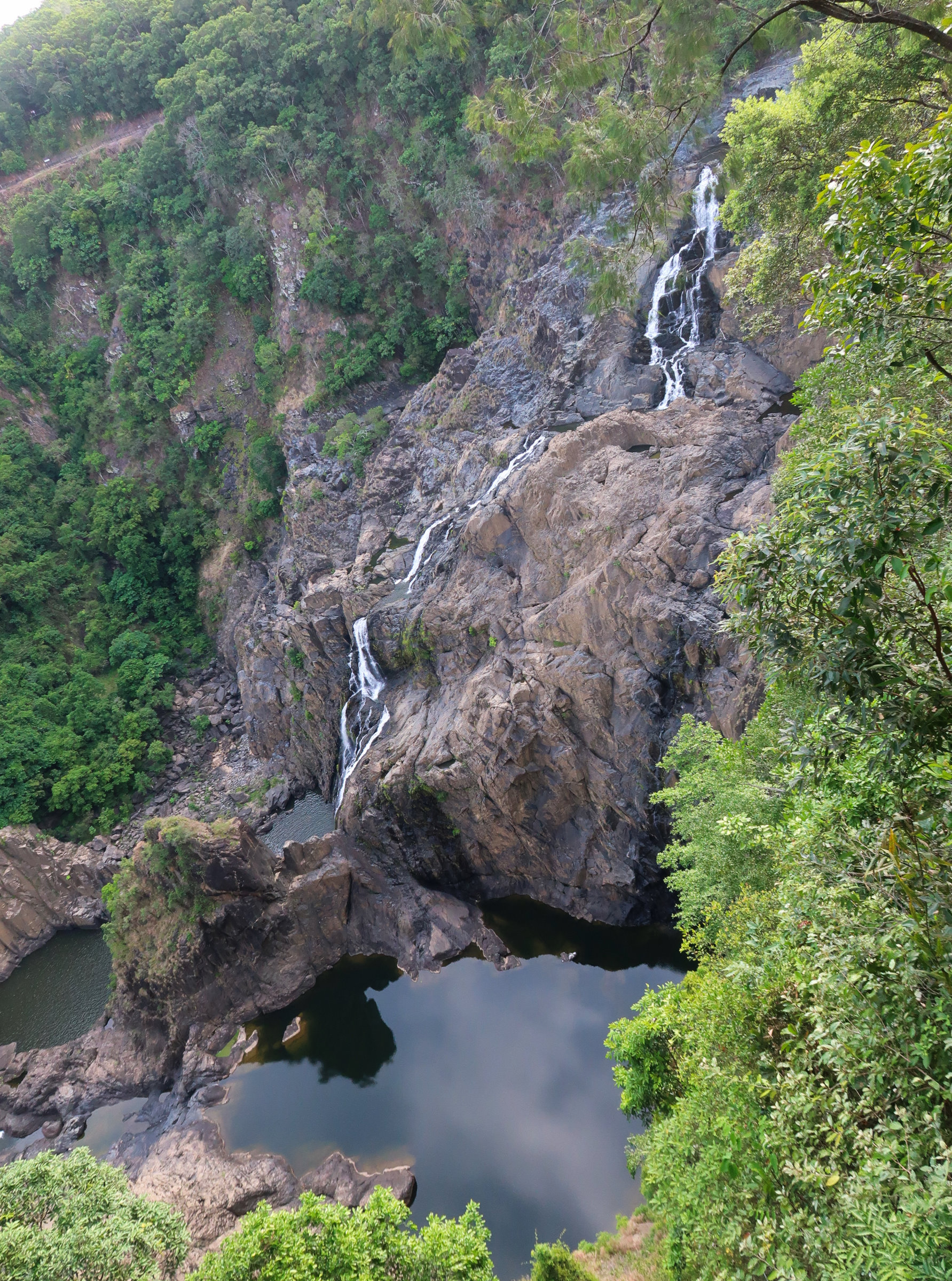 オーストラリアのグランドキャニオンと言われる。2000年に世界遺産に登録された。1億年以上前に海に堆積した厚さ1000mの砂の層が岩になり、大陸変動で隆起し、長年に渡る川の水で侵食されてジャミソン渓谷ができた。ここに生えるユーカリの葉が持つ油脂が気化して、日光に照らされて山と谷が青く光ることが名の由来。