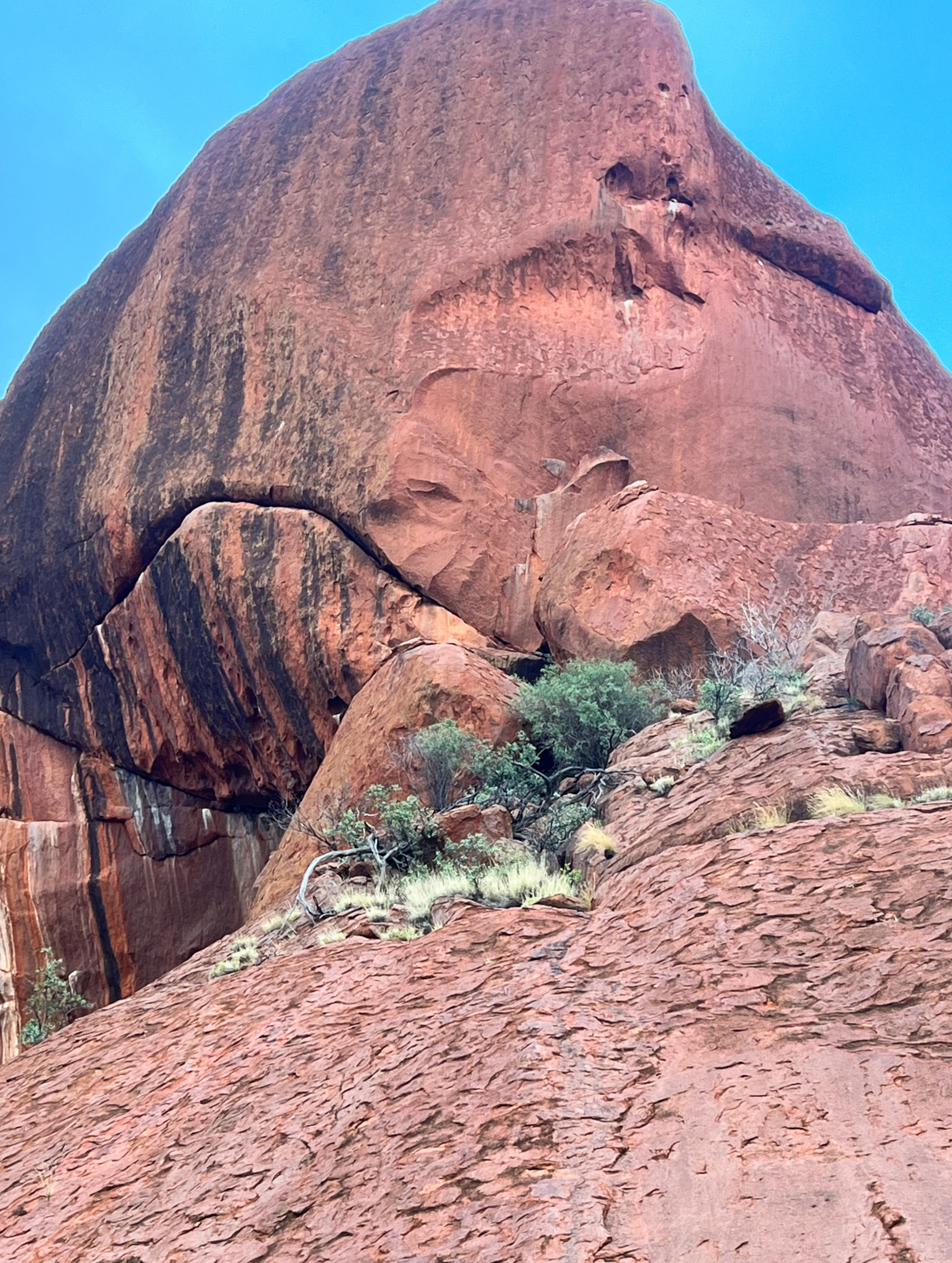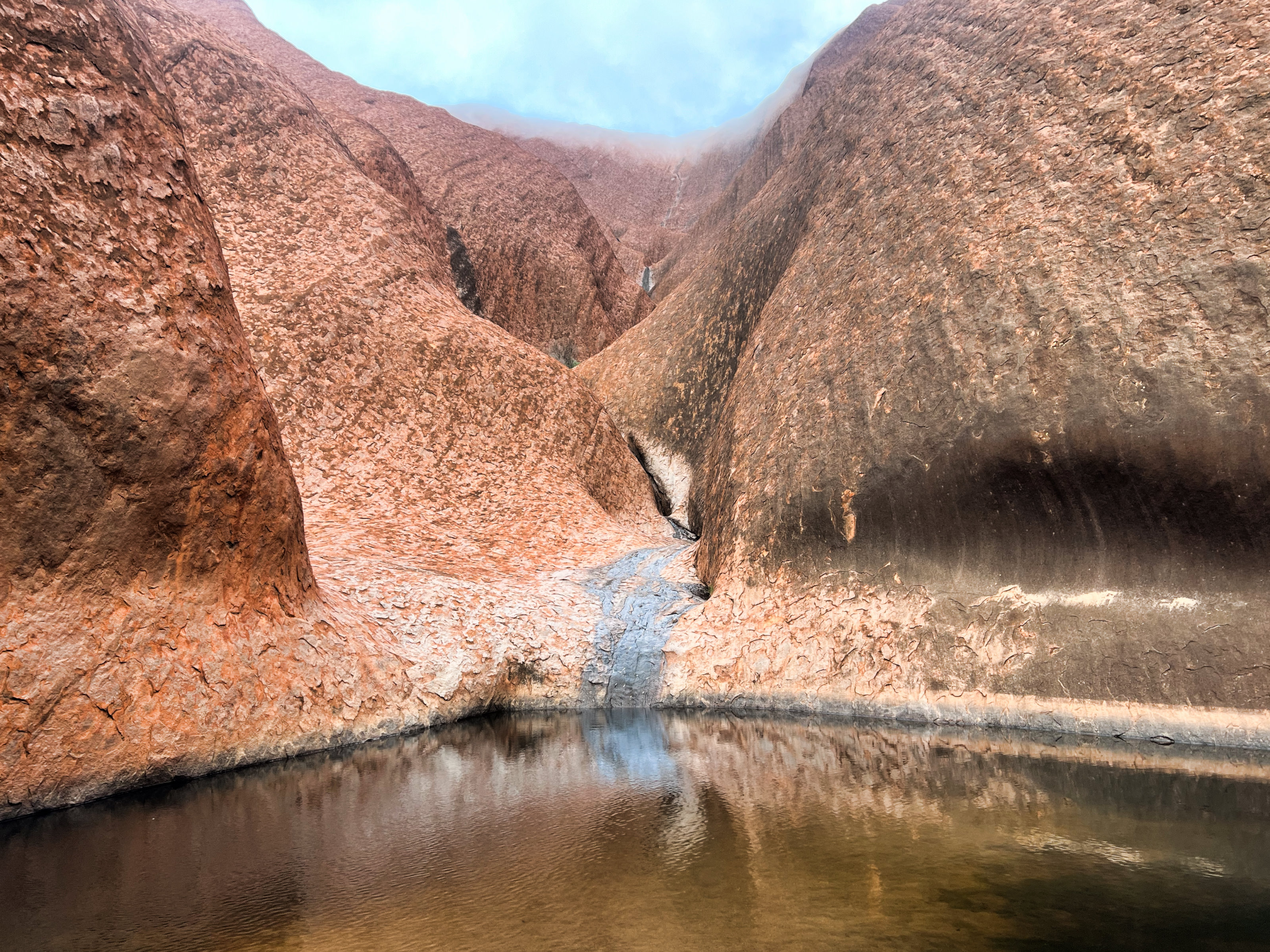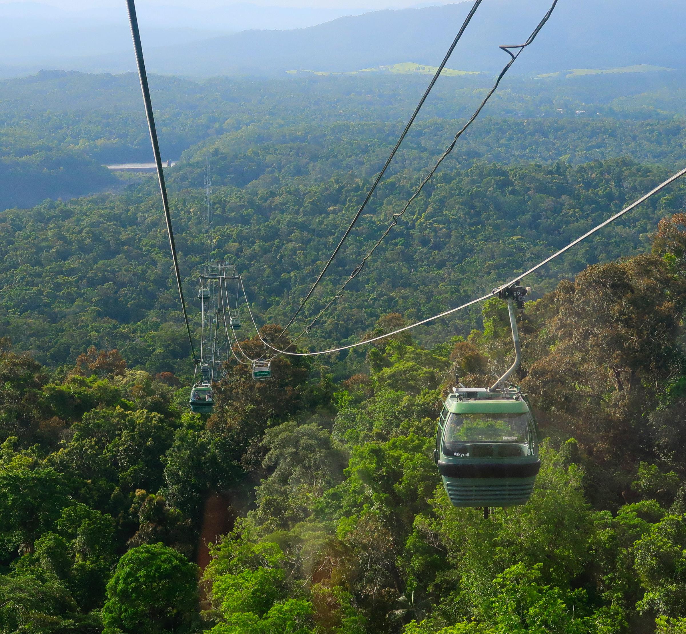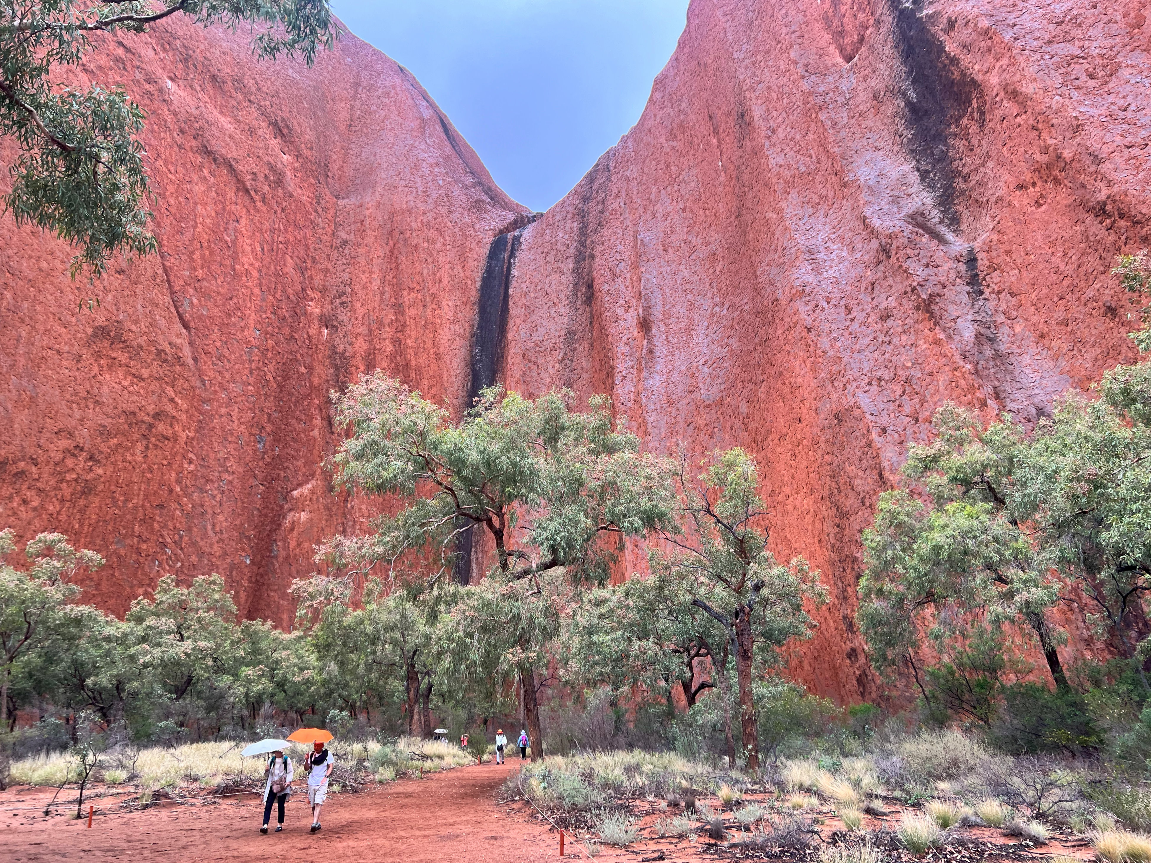 オーストラリアのグランドキャニオンと言われる。2000年に世界遺産に登録された。1億年以上前に海に堆積した厚さ1000mの砂の層が岩になり、大陸変動で隆起し、長年に渡る川の水で侵食されてジャミソン渓谷ができた。ここに生えるユーカリの葉が持つ油脂が気化して、日光に照らされて山と谷が青く光ることが名の由来。