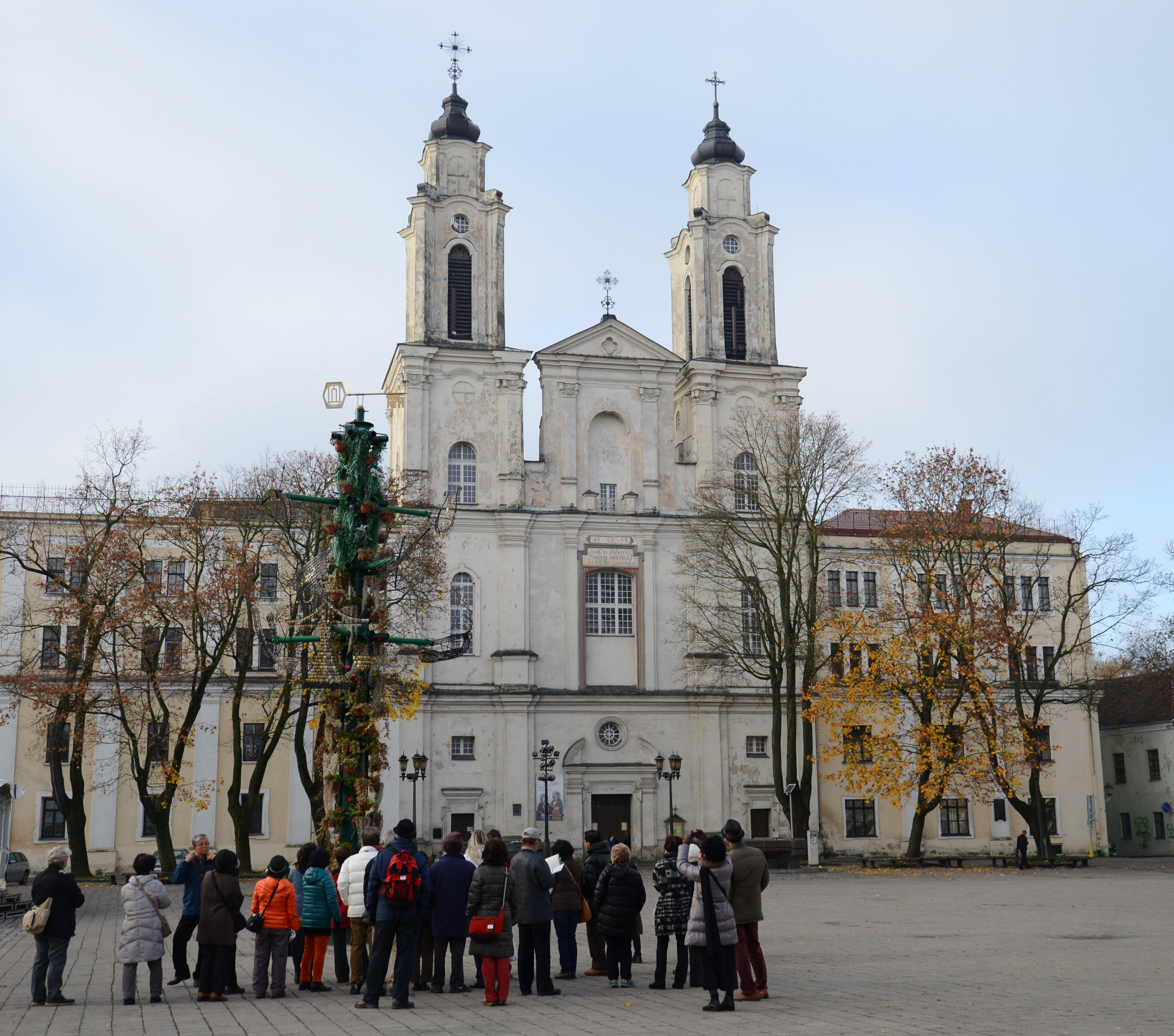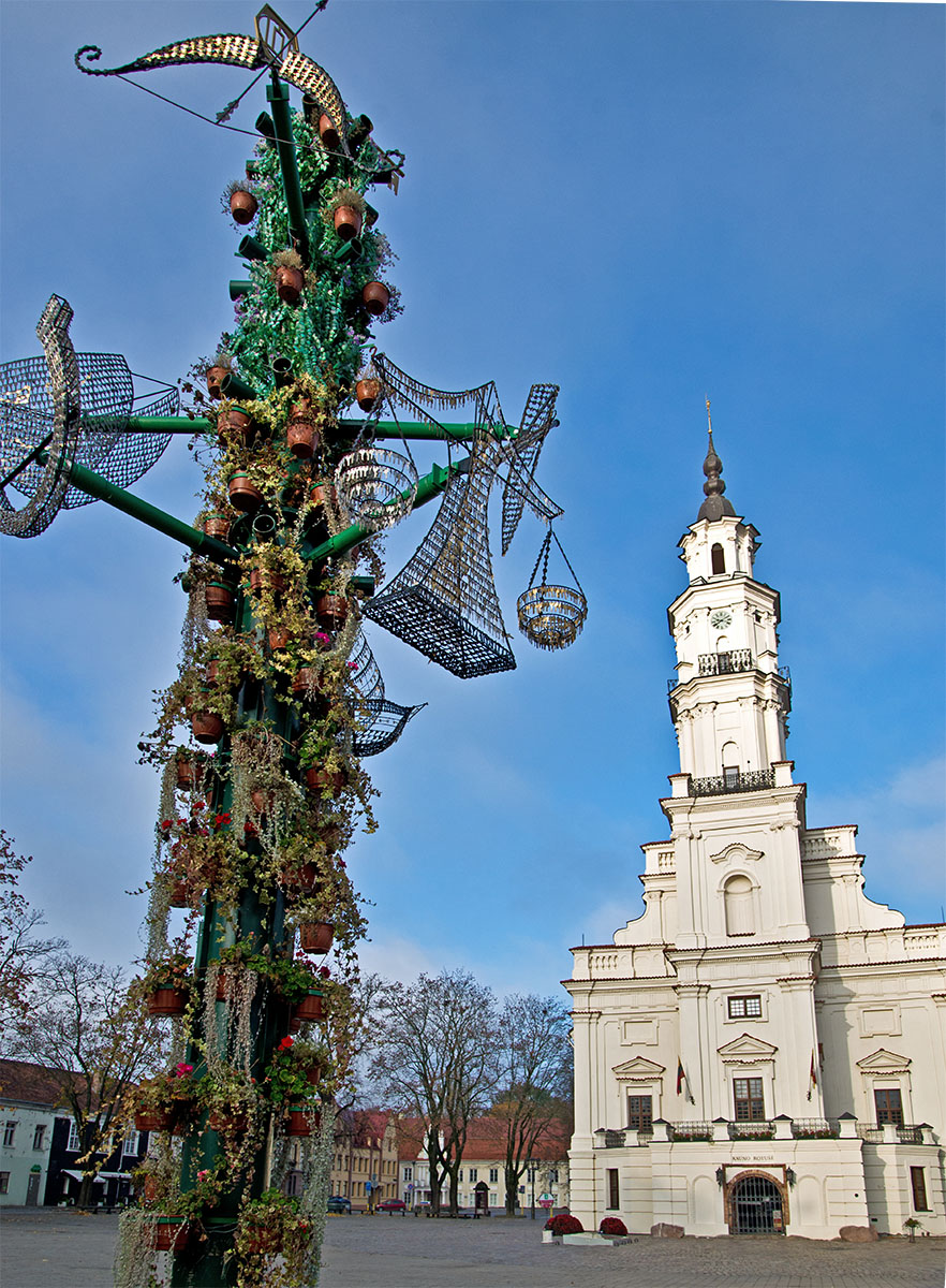 旧市庁舎広場にたつ十字架 特徴的なデザインがリトアニアの伝統