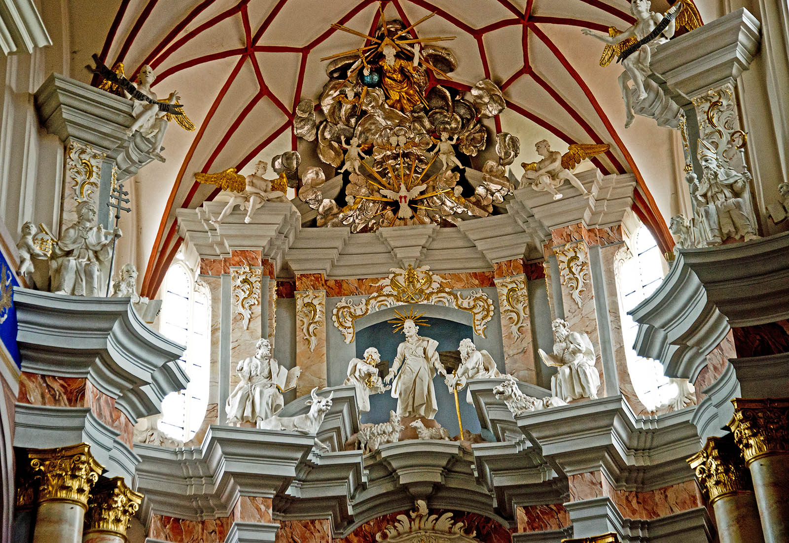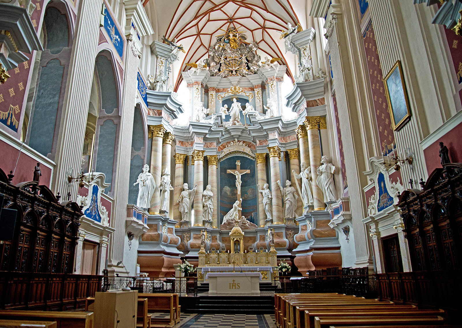 右の塔を持つ白い建物が旧市庁舎.16世紀に建設され,1775年に白鳥と言われるバロック様式の優美な姿に再建。 左は17世紀建立で修道院併設のイエズス教会 |