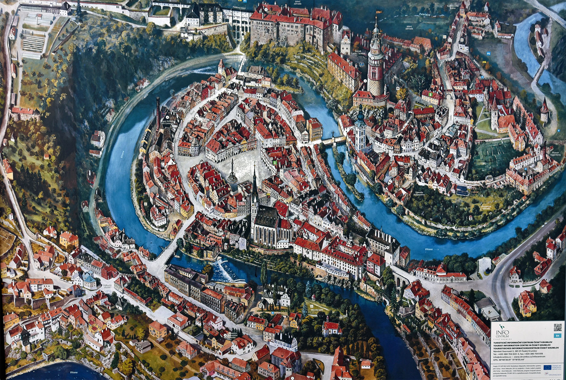 チェスキークルムロフ城からみた蛇行するヴルタヴァ川と街(合成写真)