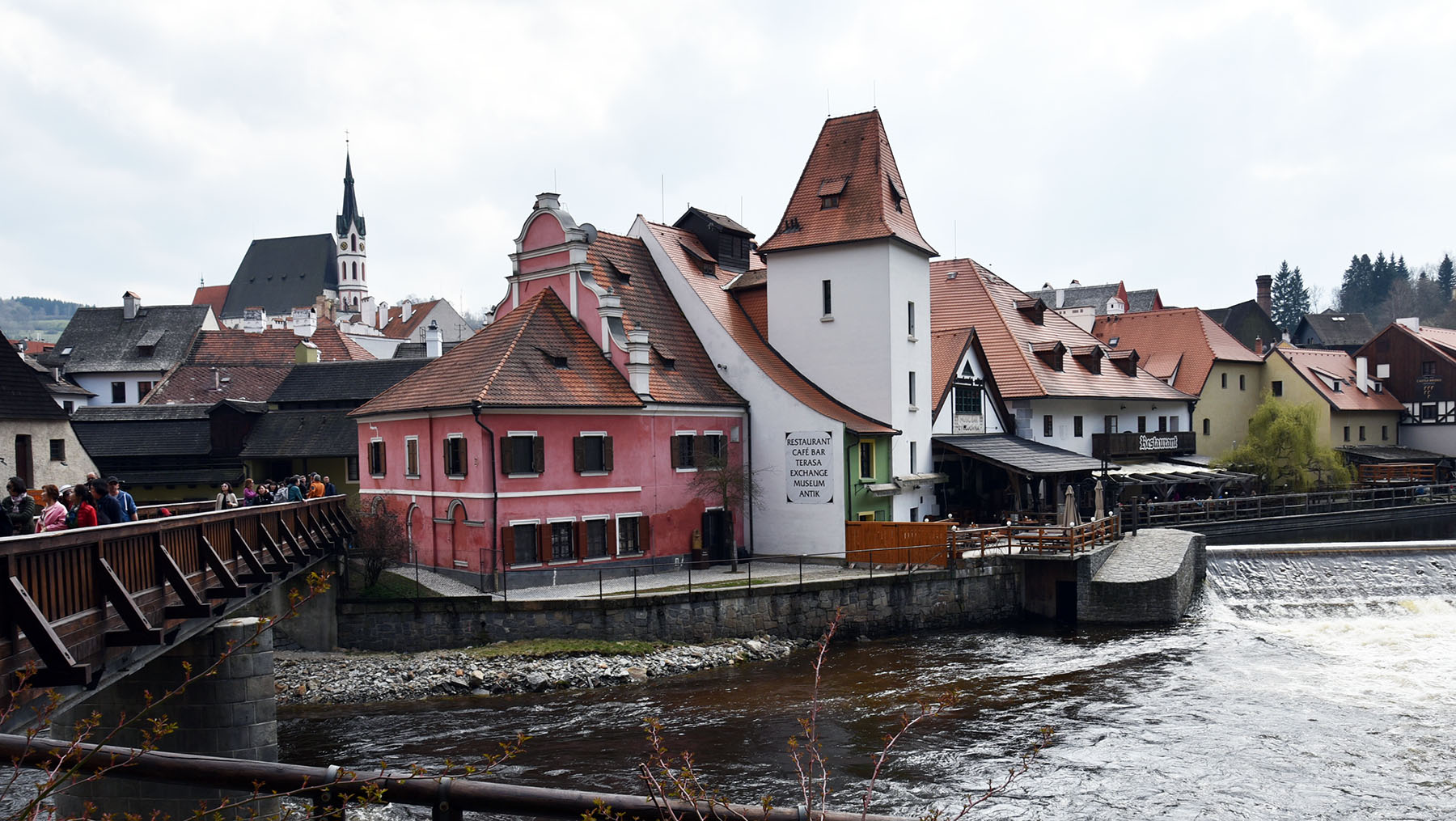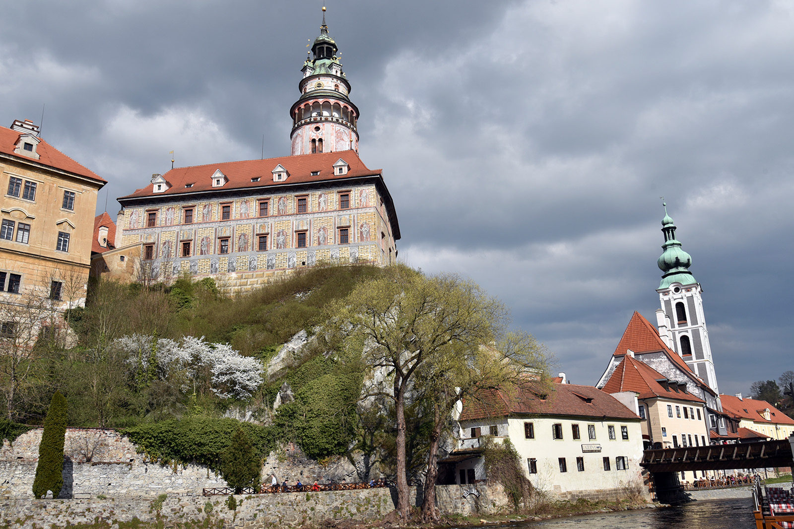 床屋橋からみたチェスキークルムロフ城と旧聖ヨシュタ教会