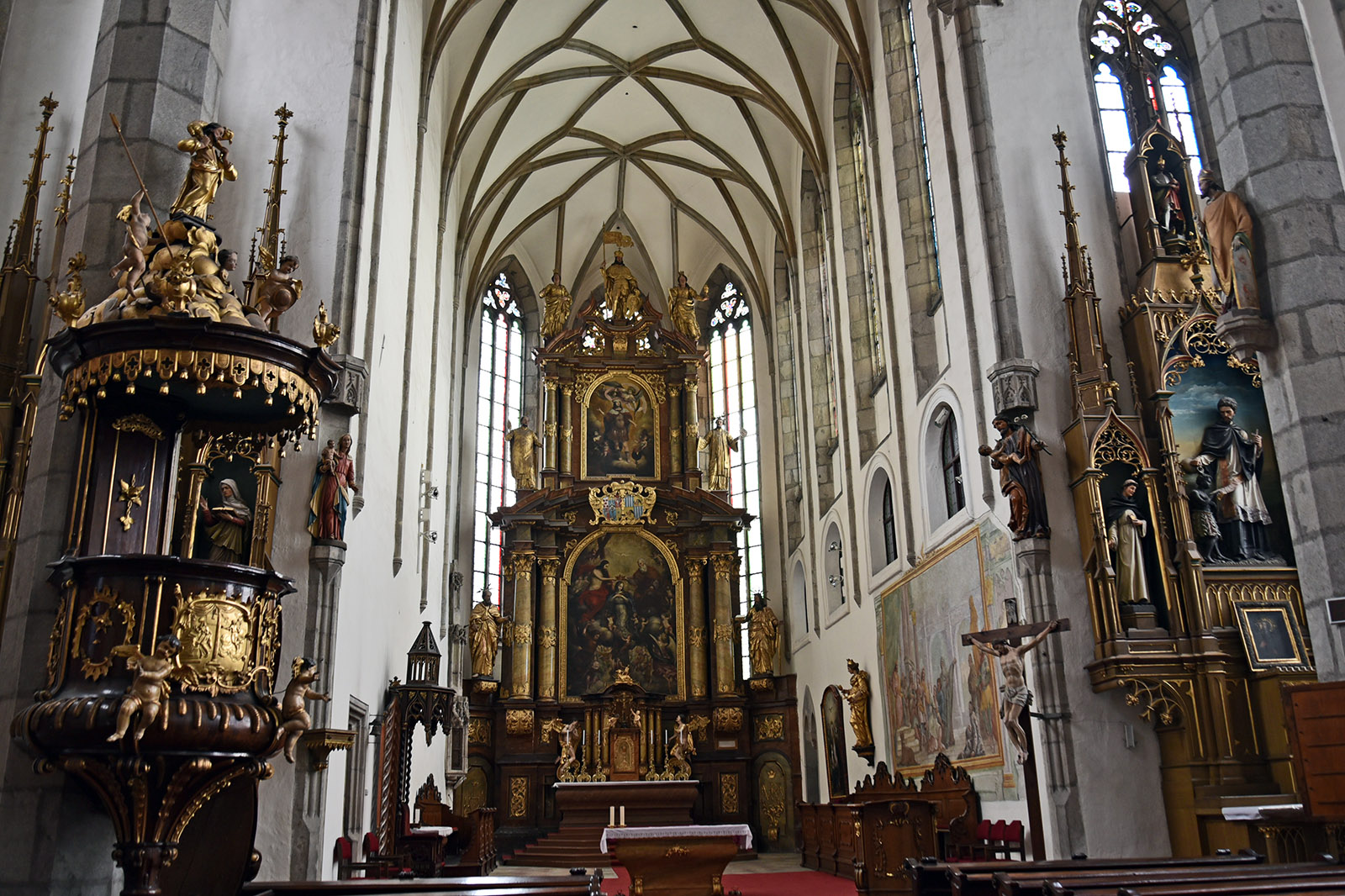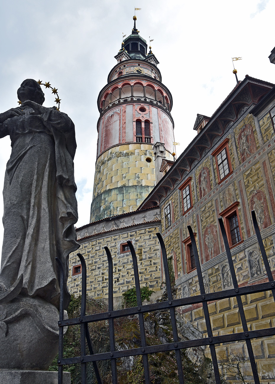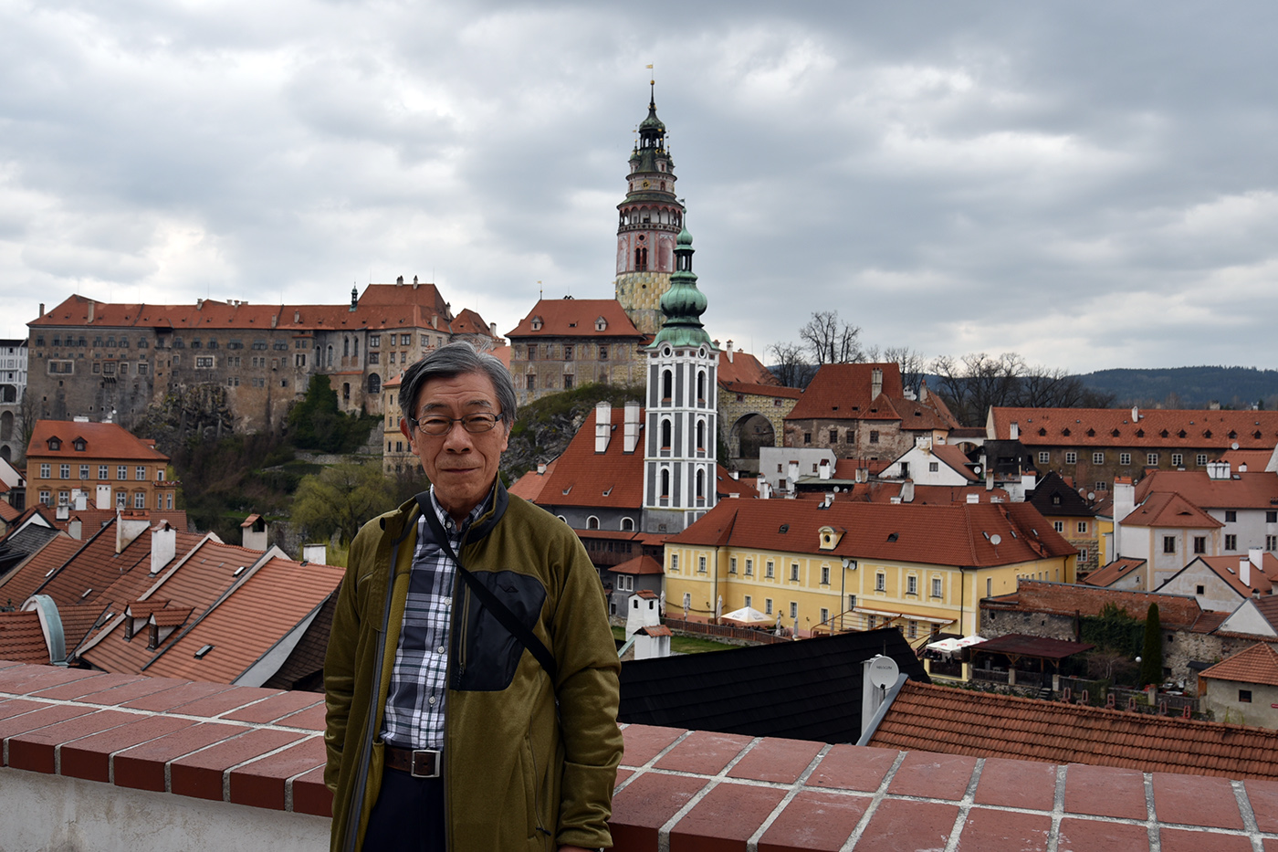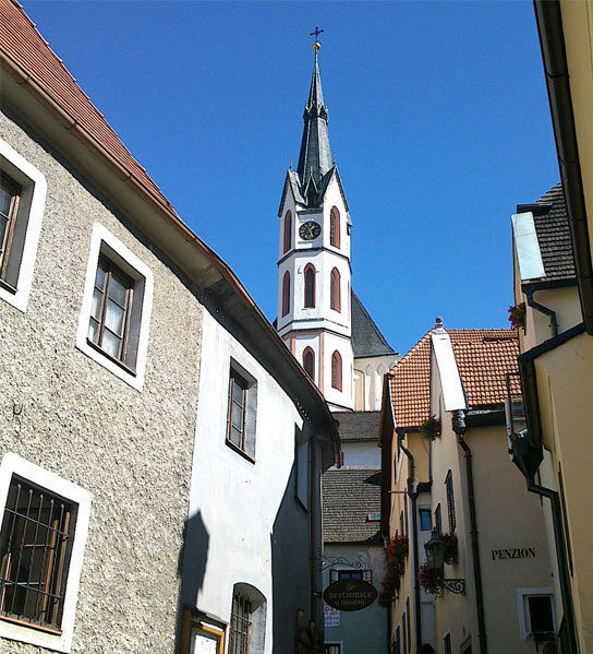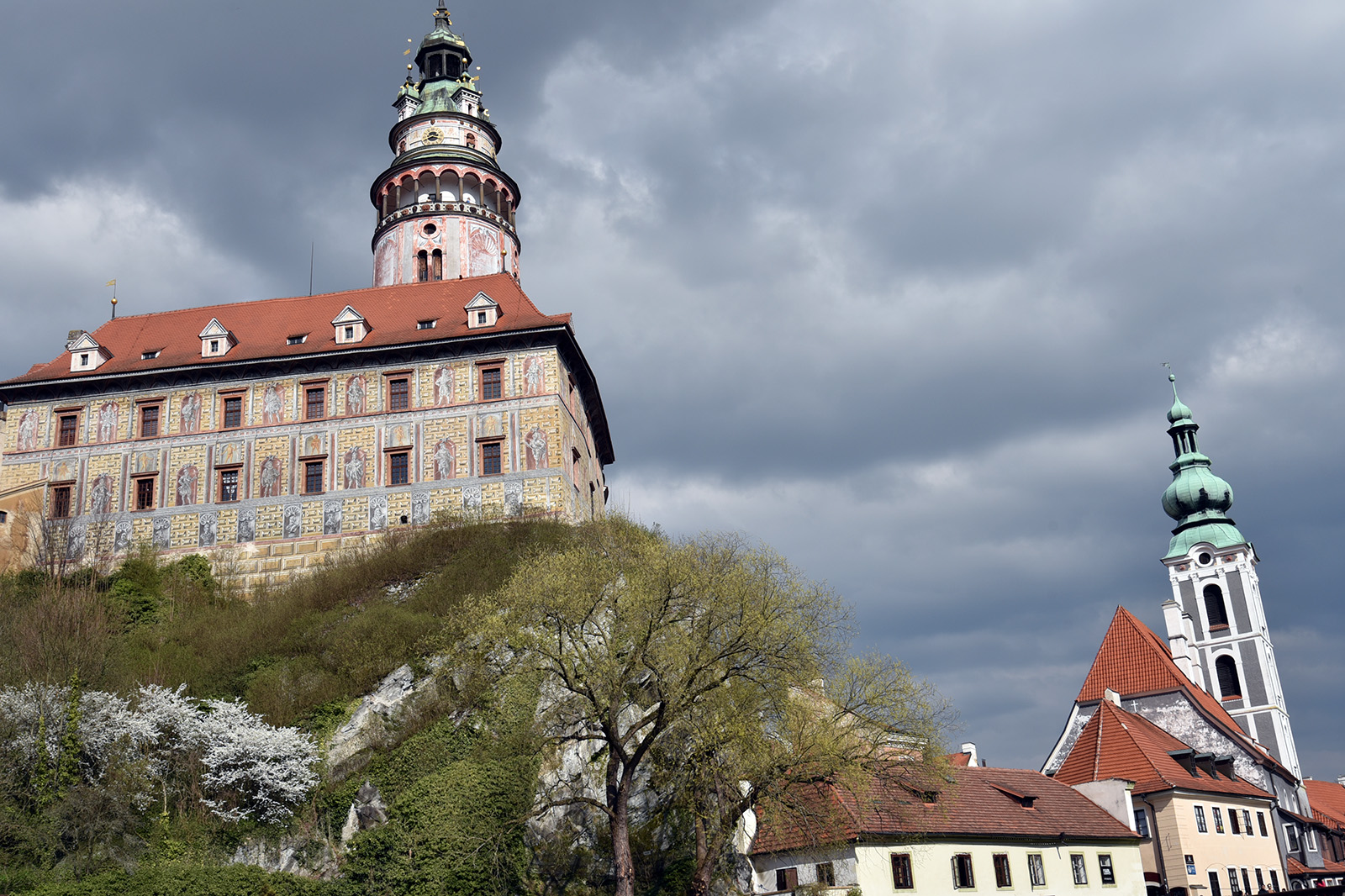 小高い展望台からチェスキークルムロフ城と旧聖ヨシュタ教会