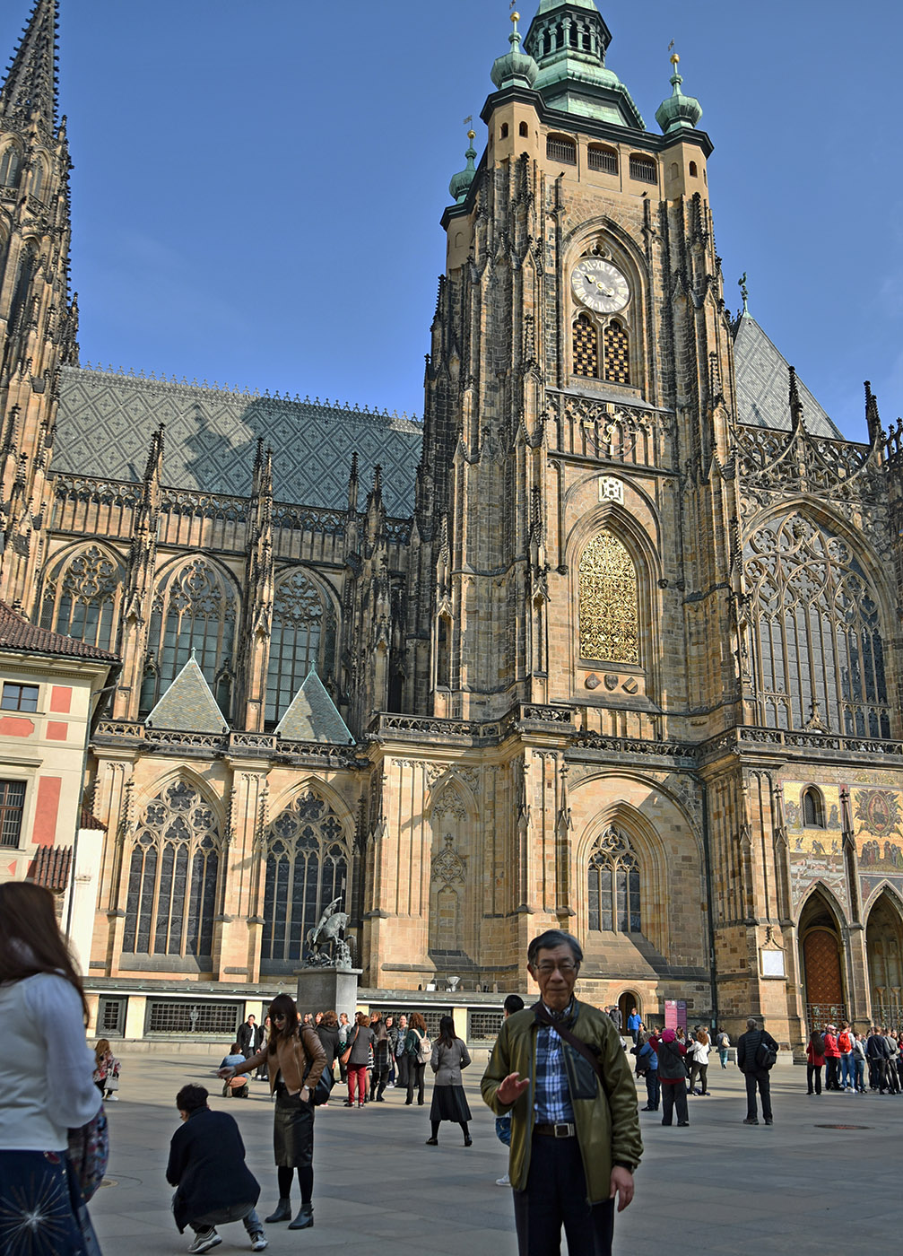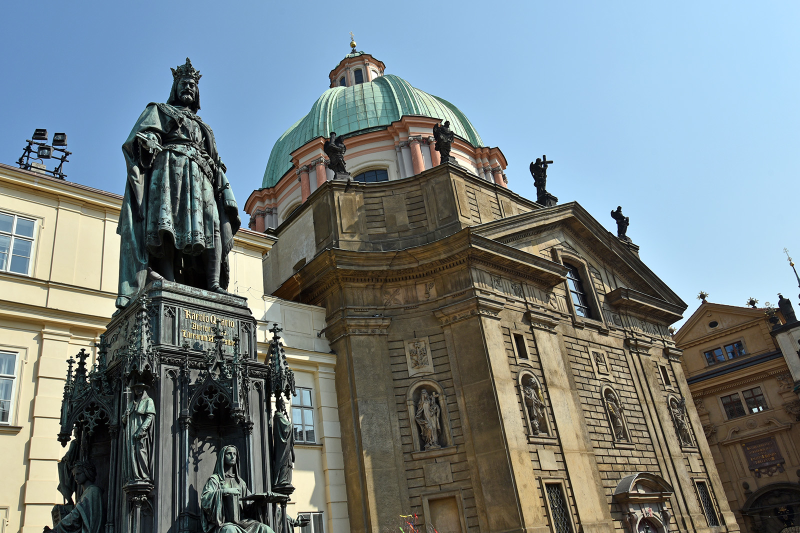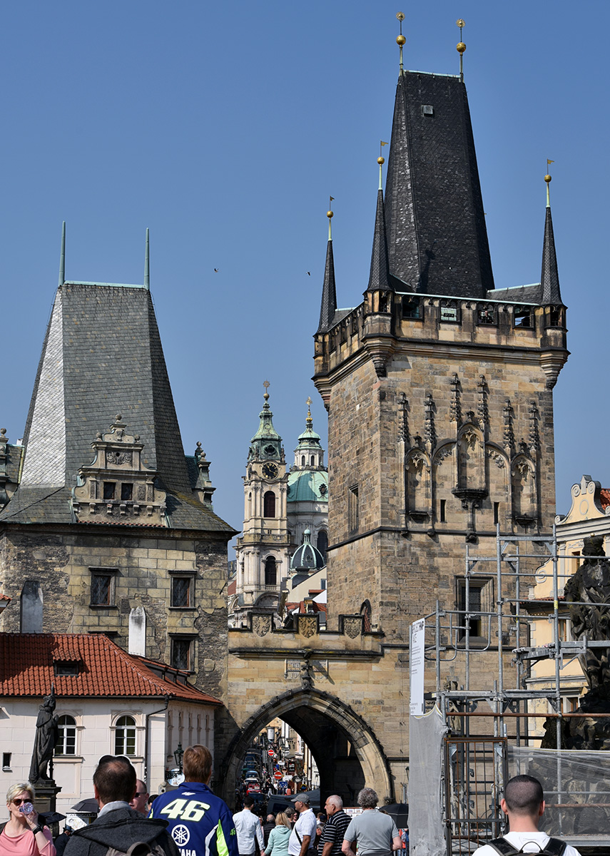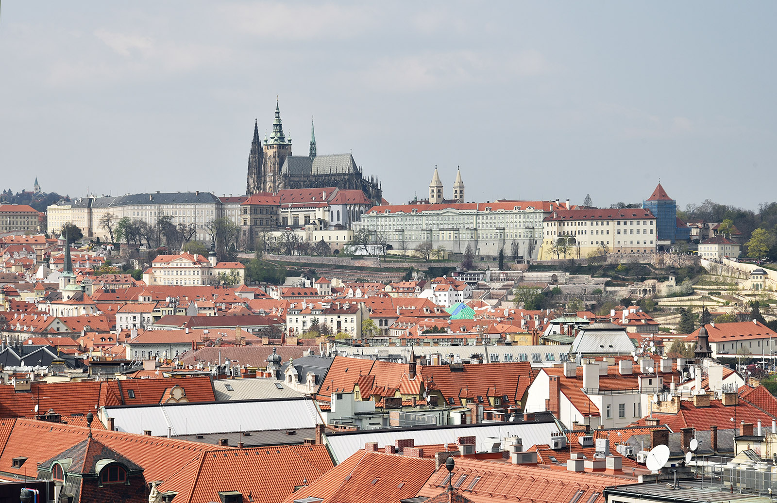 聖イジー教会のベランダから マーネス橋と旧市街の教会、旧市庁舎時計塔