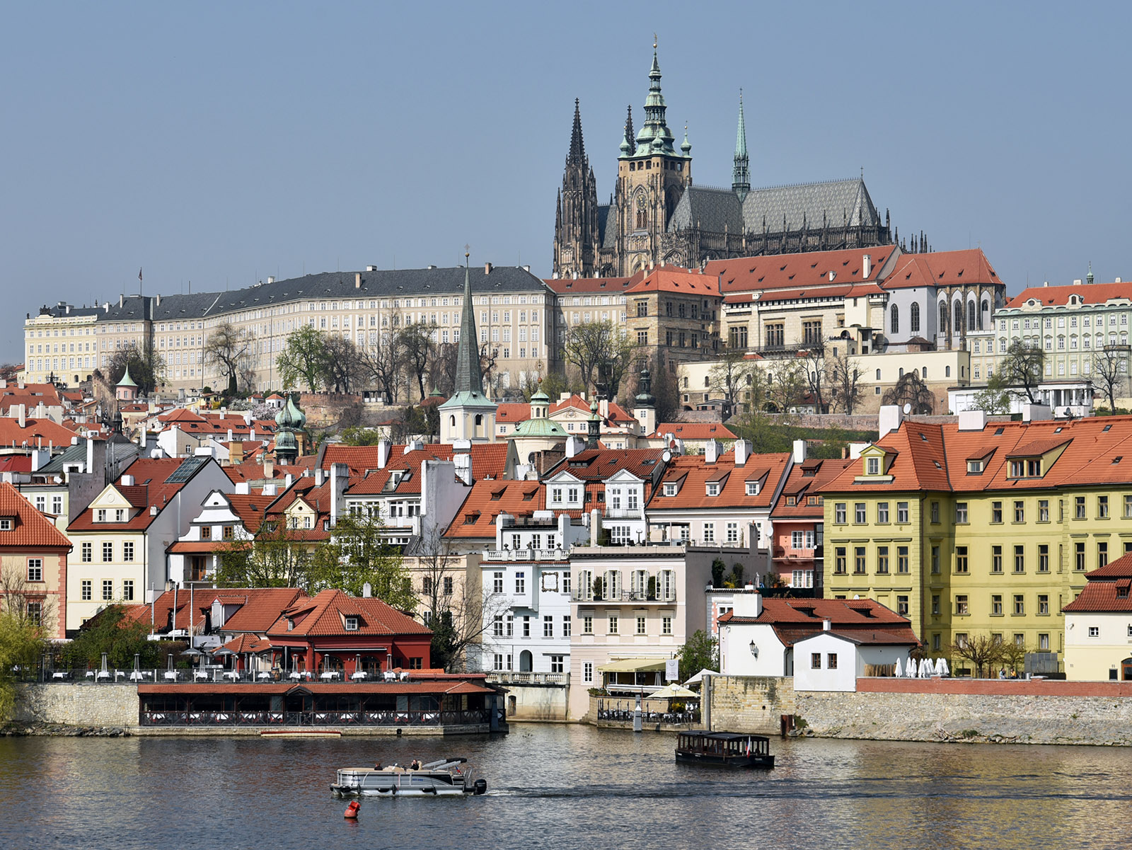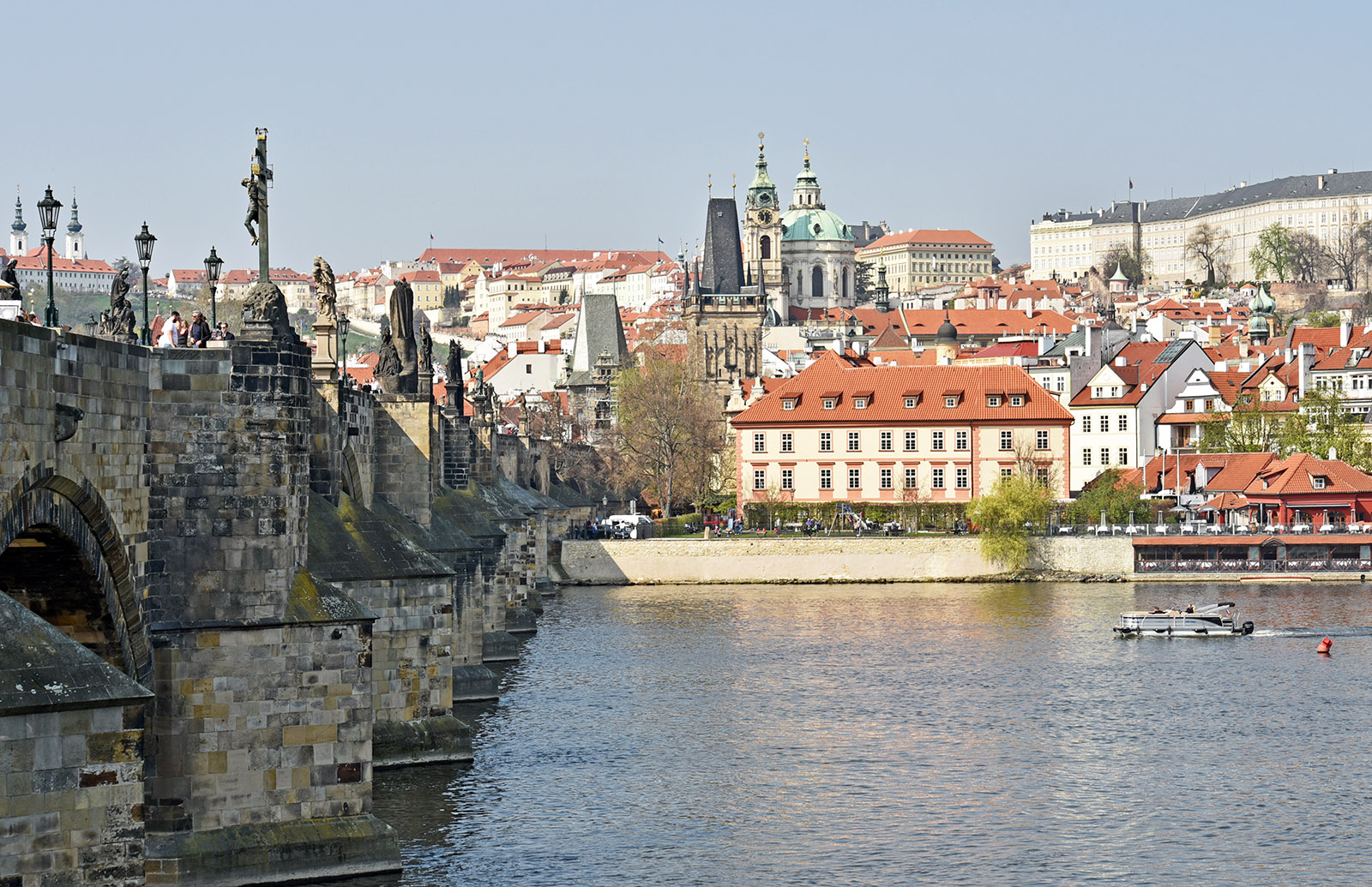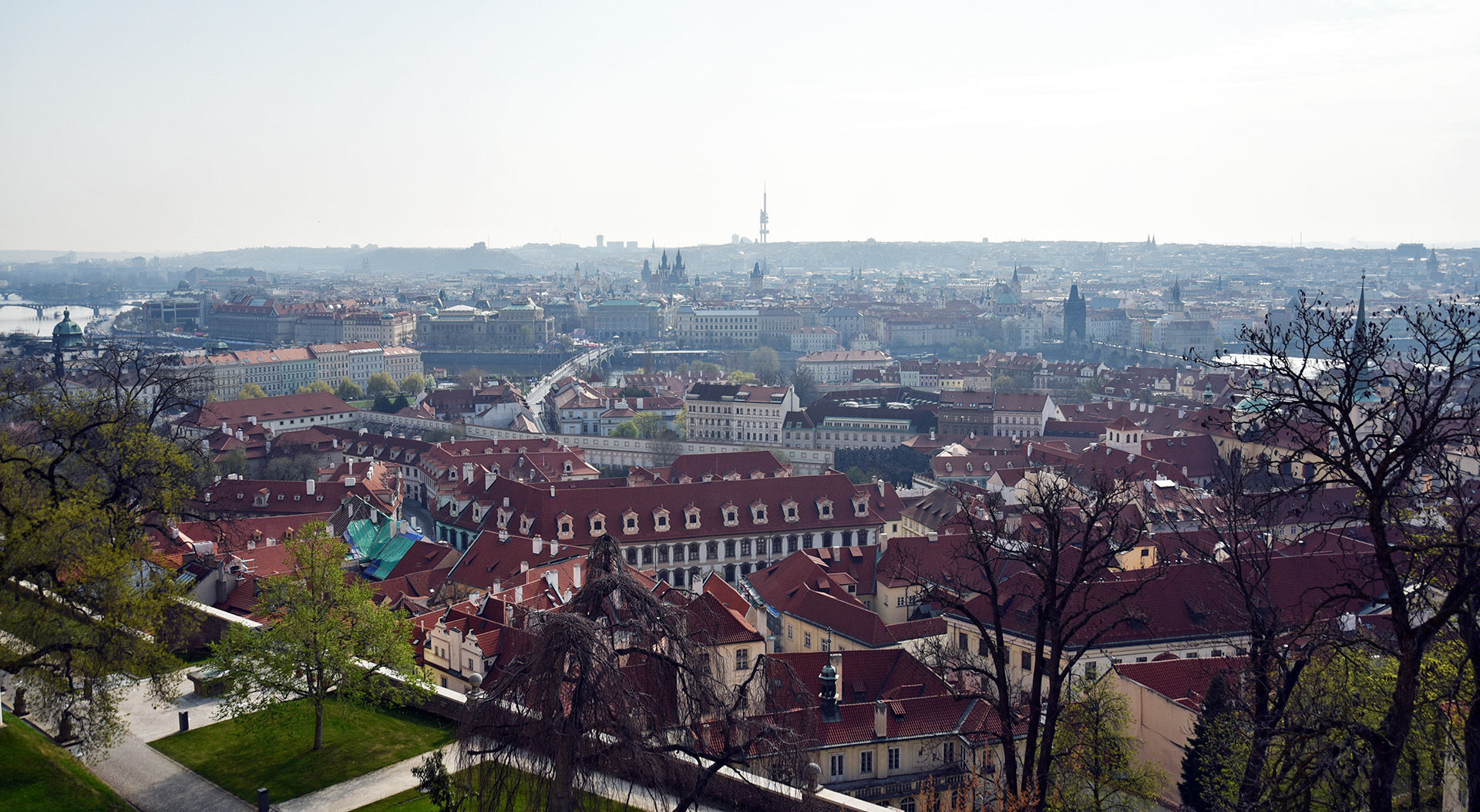 聖イジー教会のベランダからプラハ旧市街 ヴルダヴァ川、マーネス橋とカレル橋