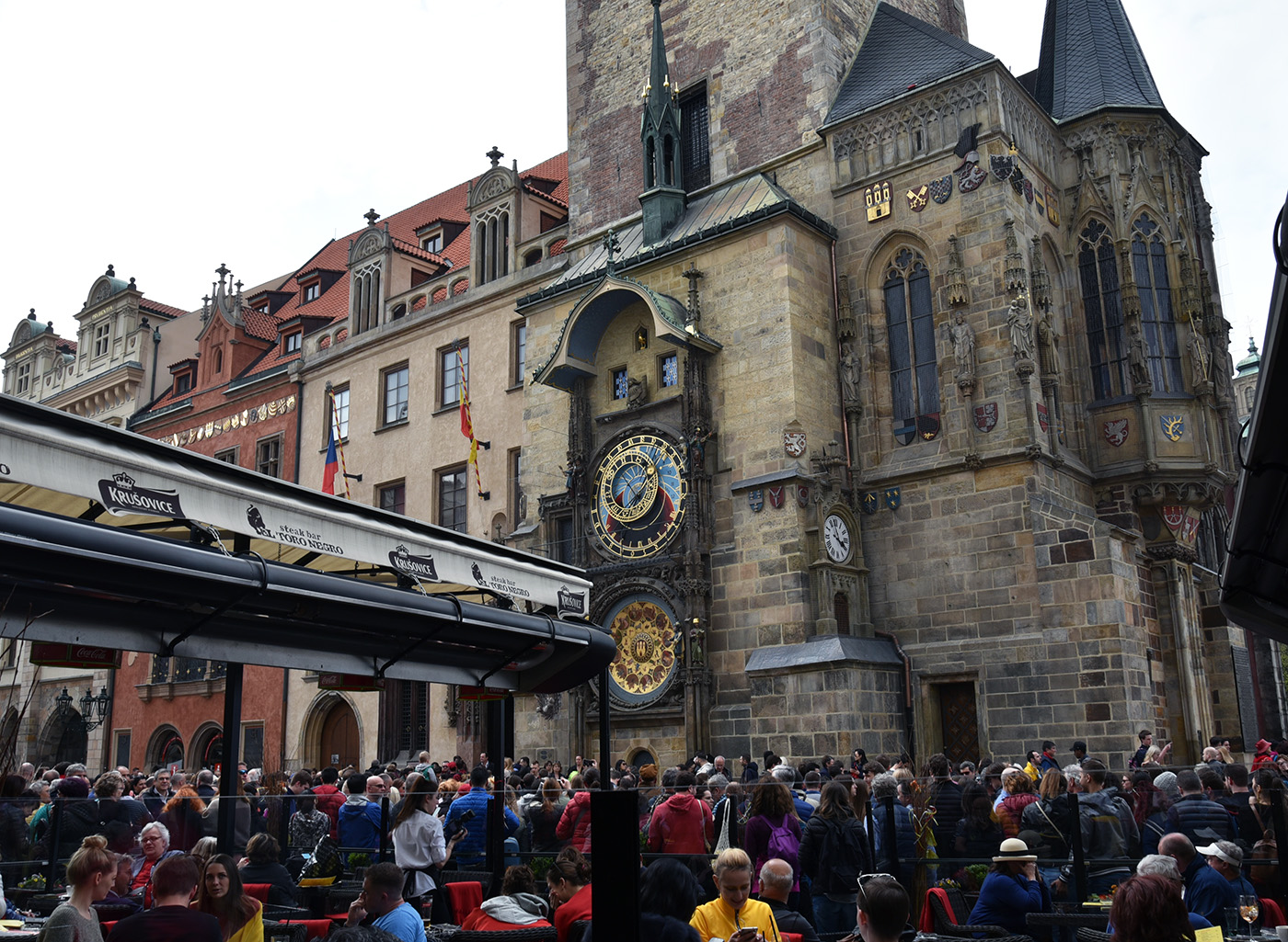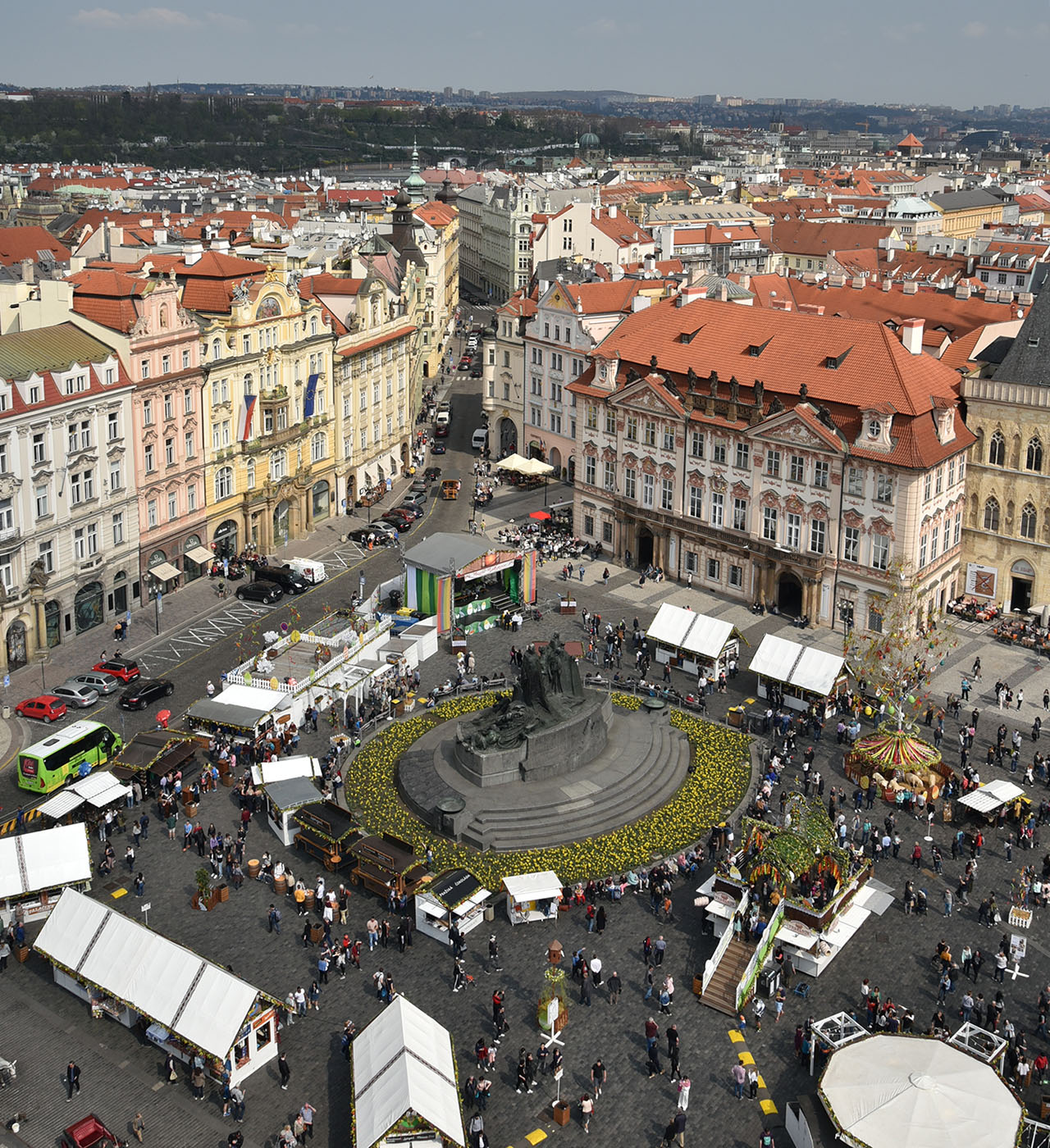 時計塔頂上の展望台から旧市庁舎広場 ヤンフス像、コルツ・キンスキー宮殿