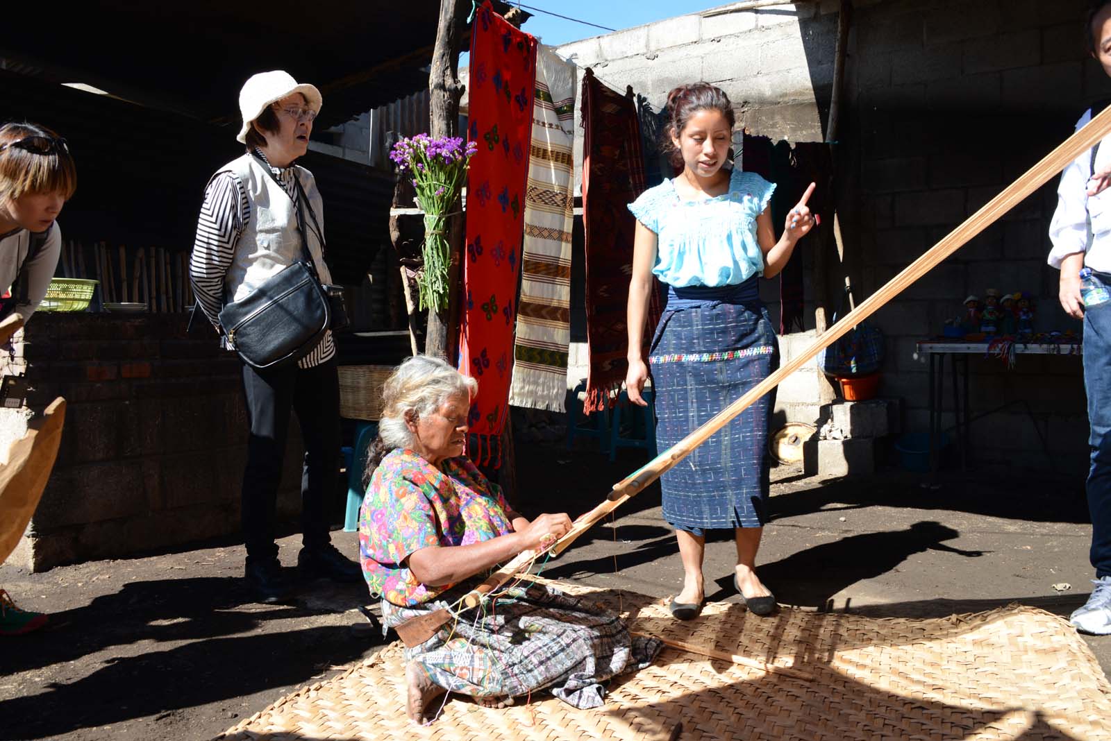 伝統の織物をする母と説明する娘