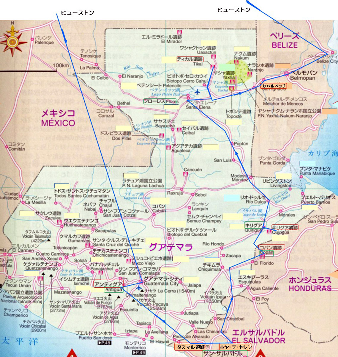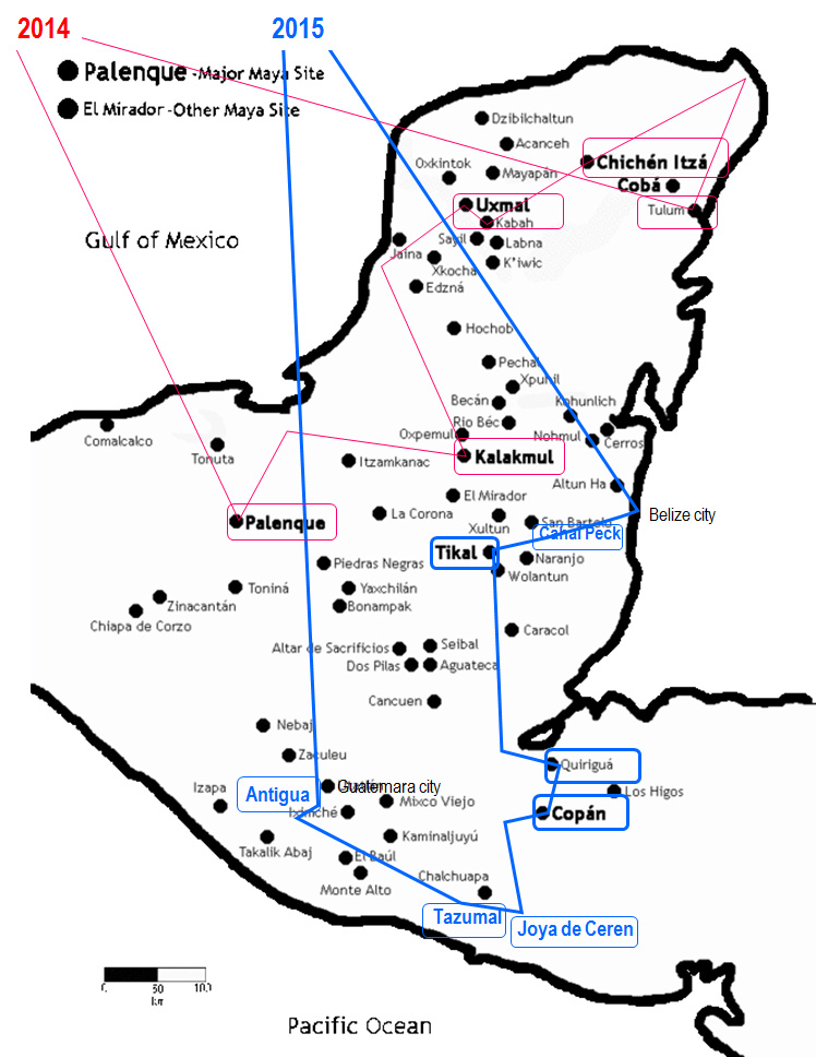 赤:2014年メキシコの旅, 青:2015年グアテマラ中心4か国
