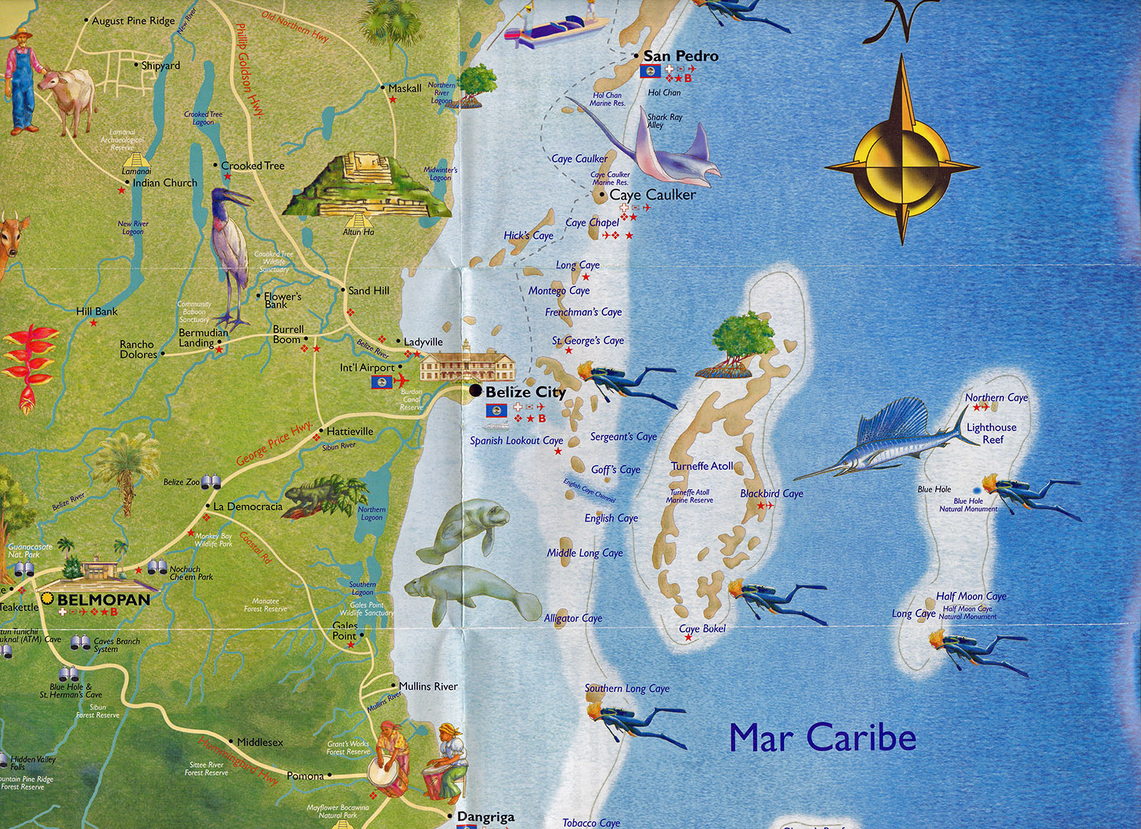ベリーズの観光地図 ブルーホールは右のリーフの真ん中 陸には川や湿地が多い。