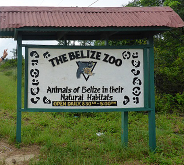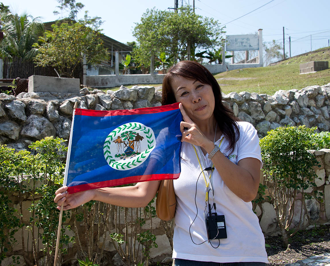 ベリーズ国旗とベリーズ在住日本人ガイドのソリス麻子さん