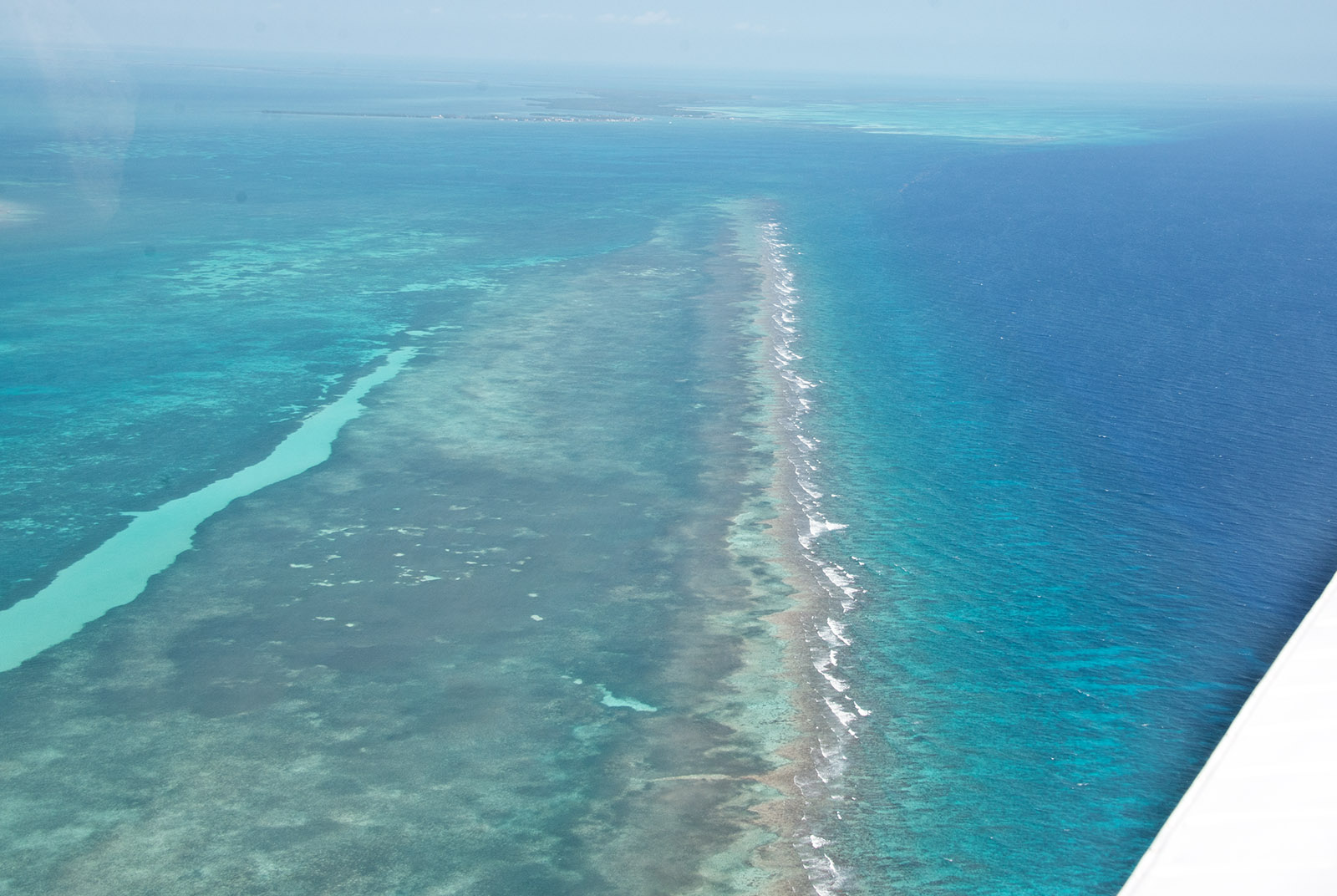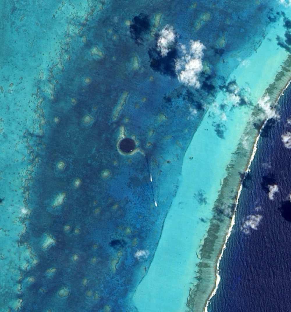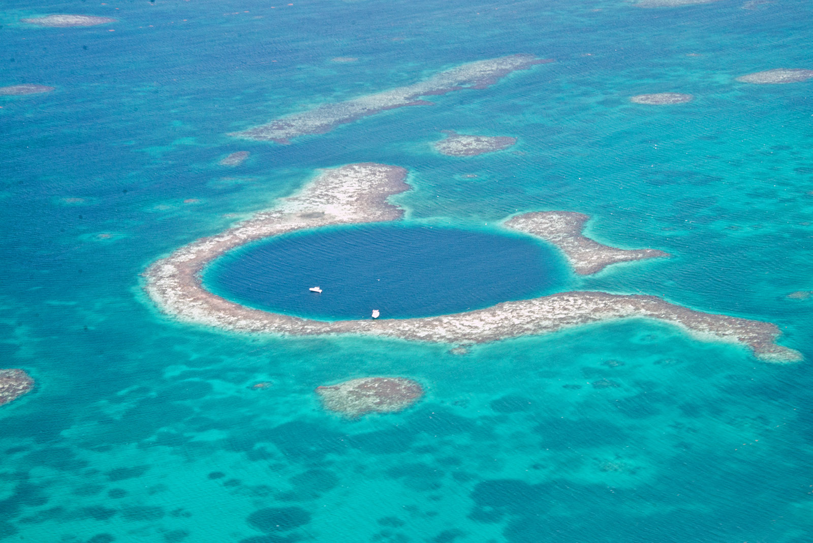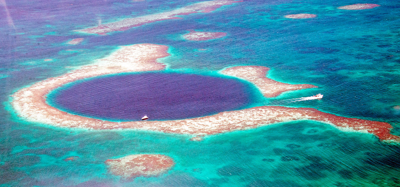 ブルーホールはベリーズシティの東約100km,ライトハウスリーフの中のひときわ深い青い色の丸い穴です。