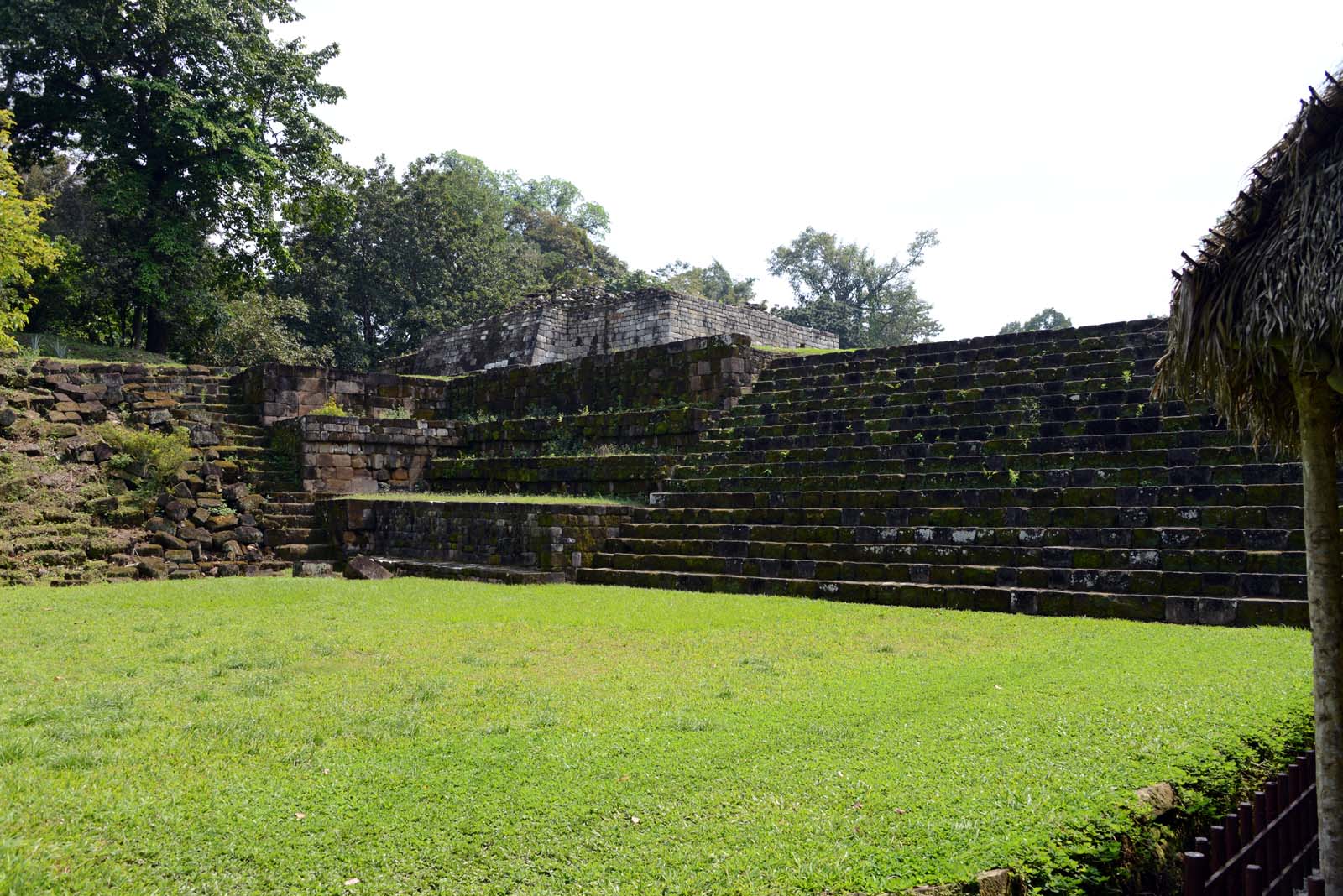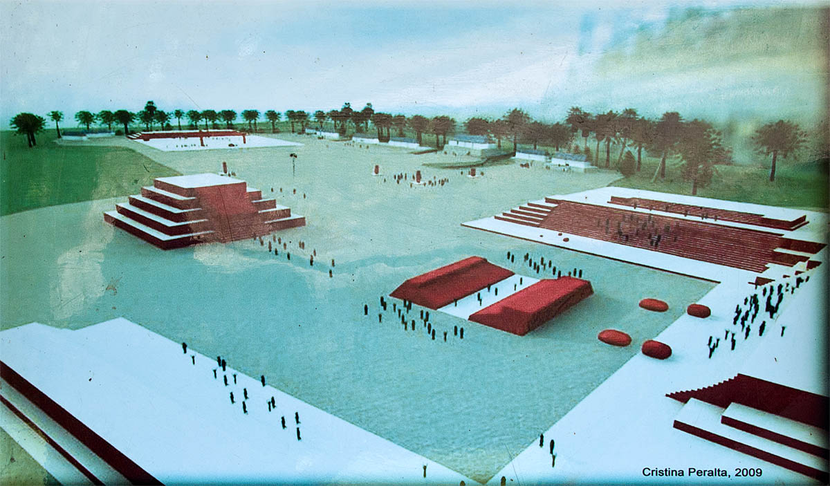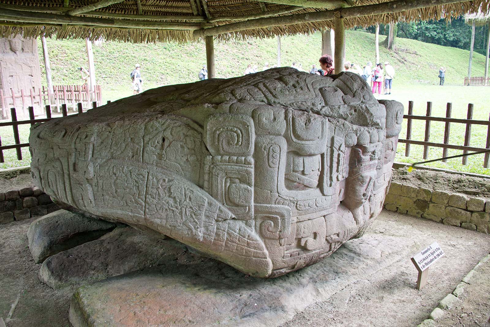 獣形祭壇B 780年に作られたカック・ティリュウの最後の建造物. 長さが3.7m,高さ1.8mの巨大な石彫りです。 南を向いた正面からは王が顔を出し、当時は全体が真っ赤に塗られていたようで, 色が少し残っている。