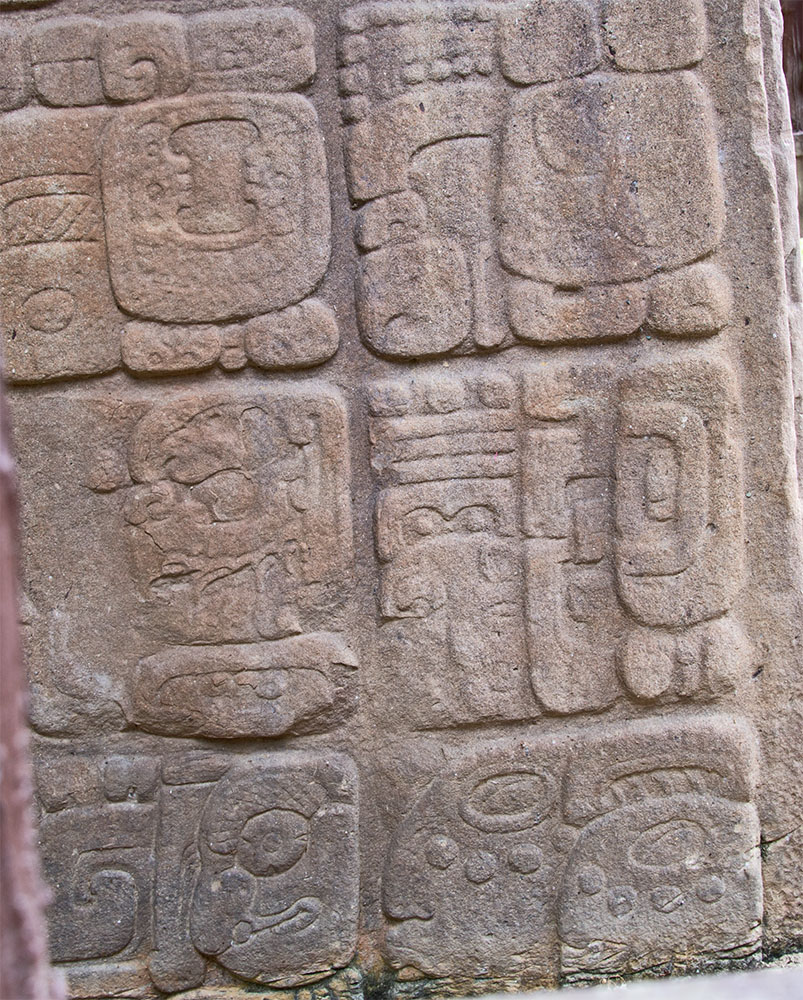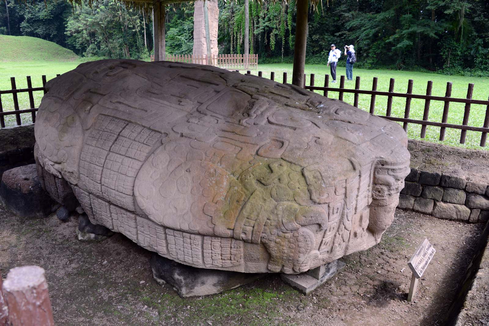 亀の甲羅ような体の側面にはマヤ文字が彫られている。