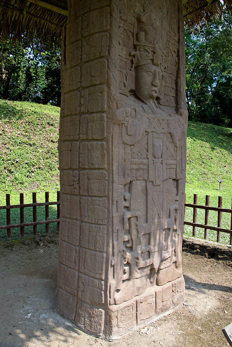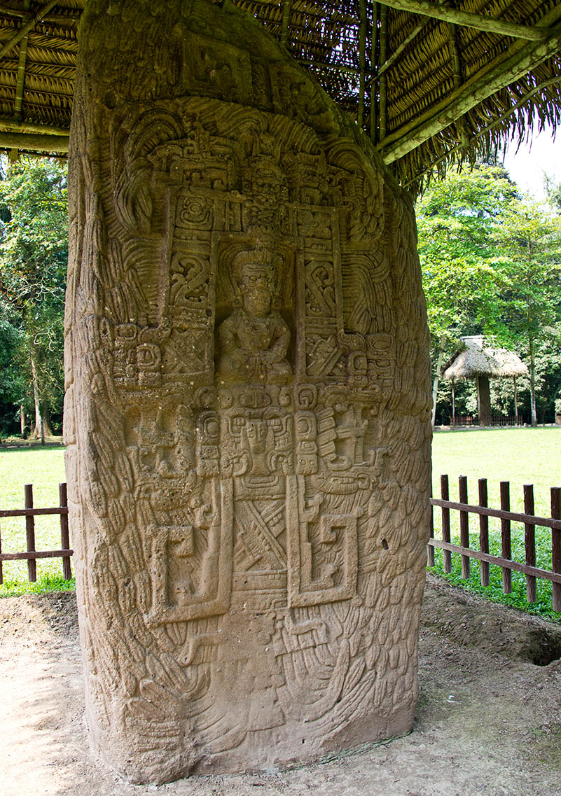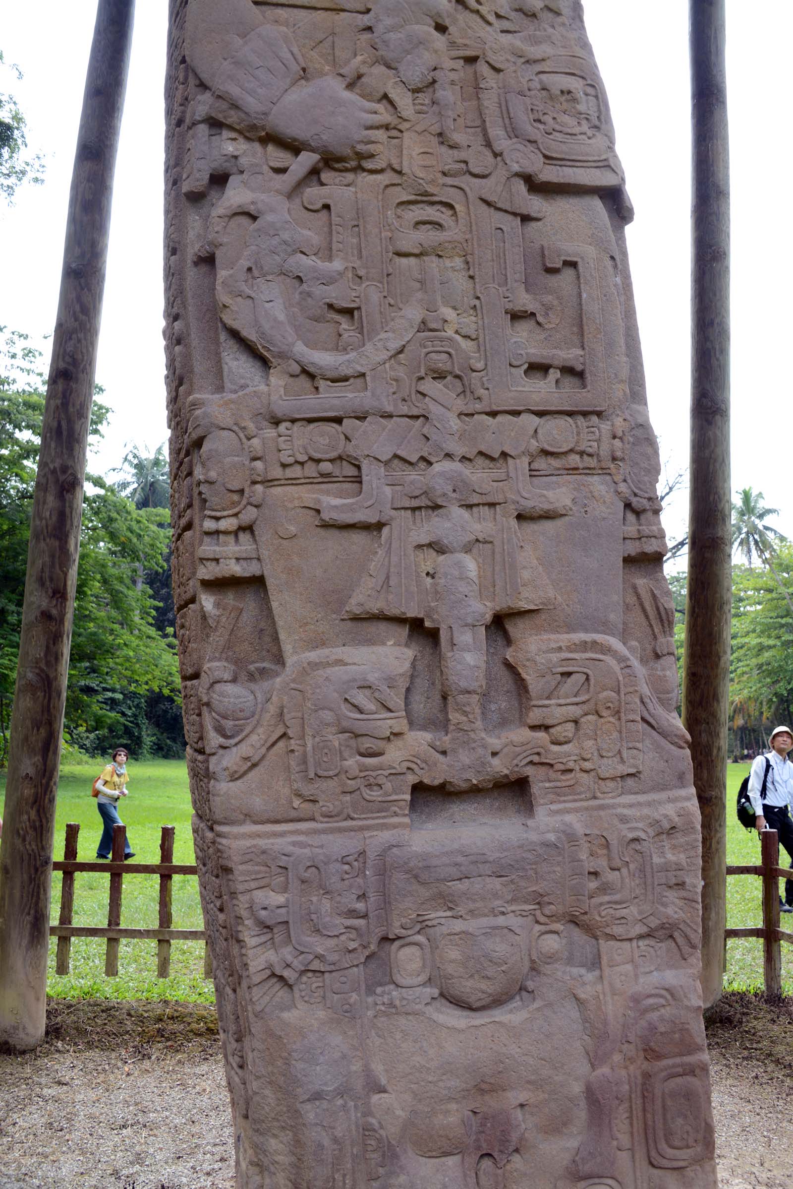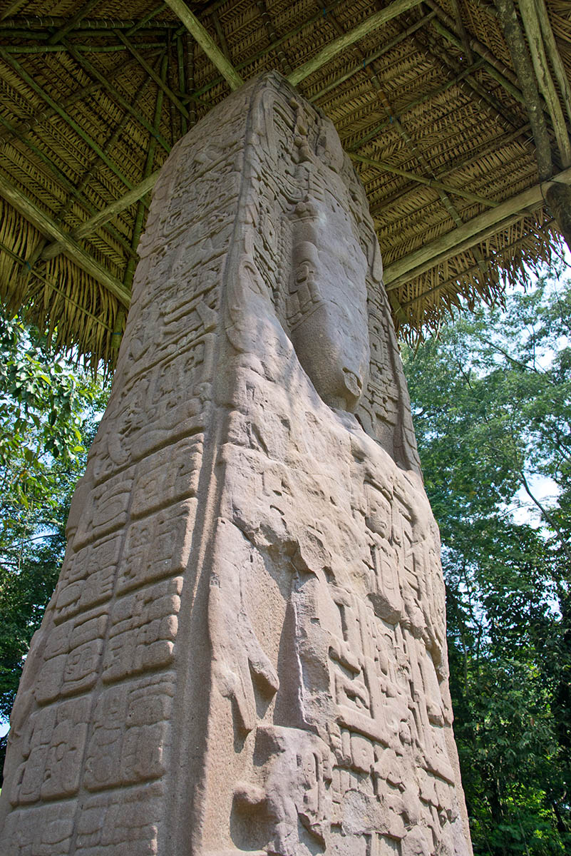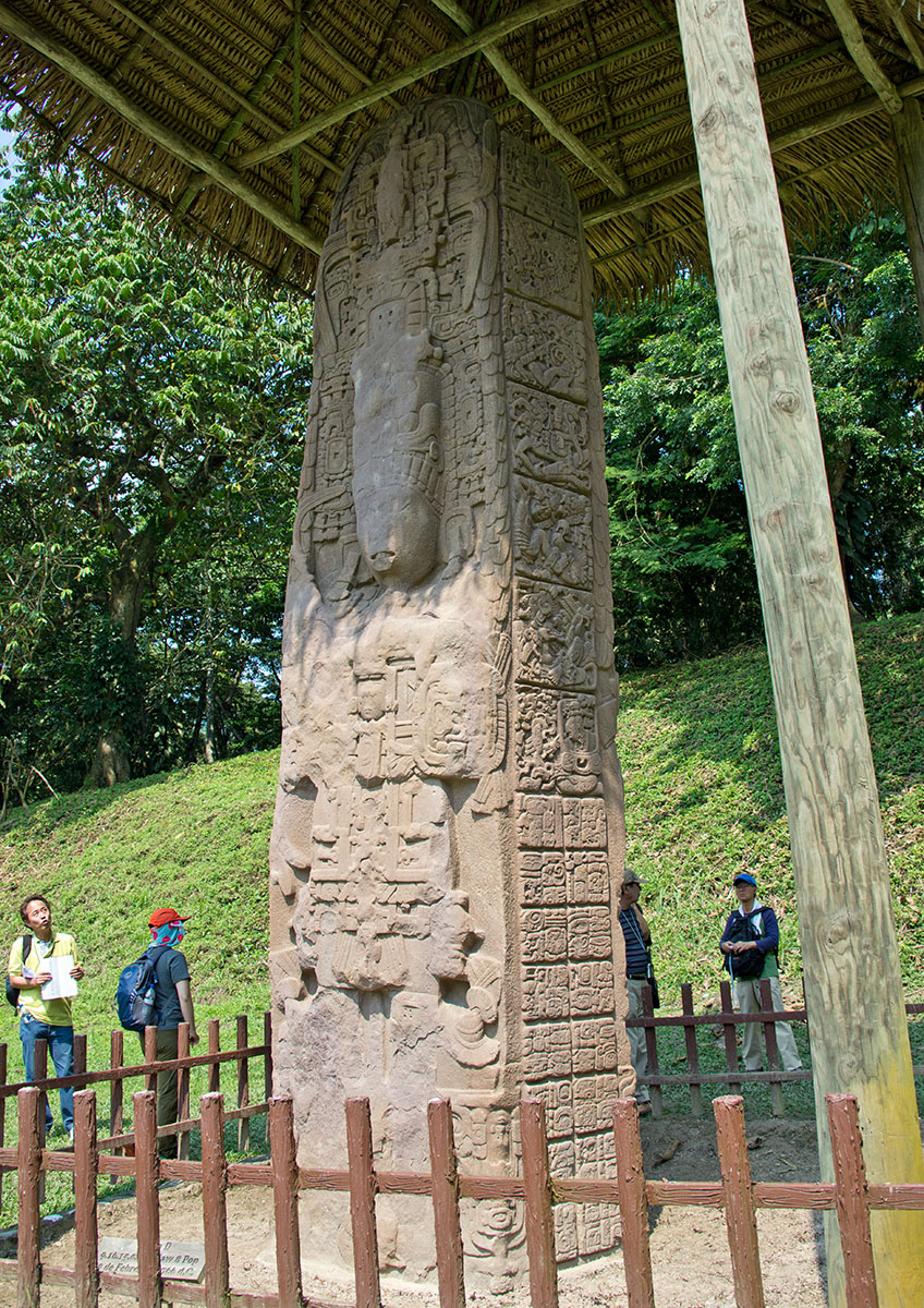 石碑E 771年(9.17.0.0.0.) に建てられ、カック・ティリュウが南北両面に彫られており、高さ7.6m、地下も合わせとると11.7mと最も高い、立派な石碑。