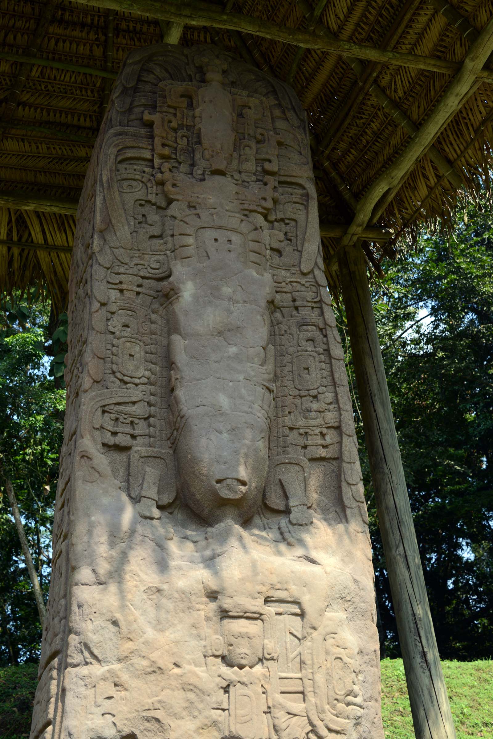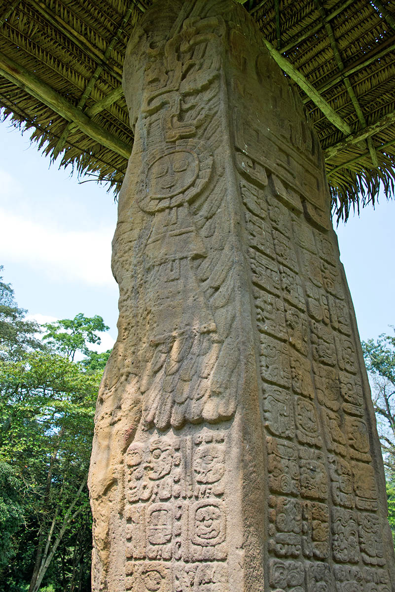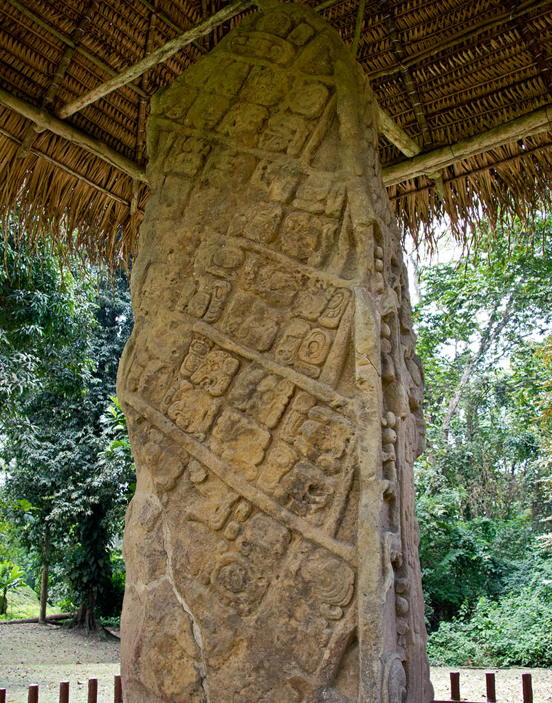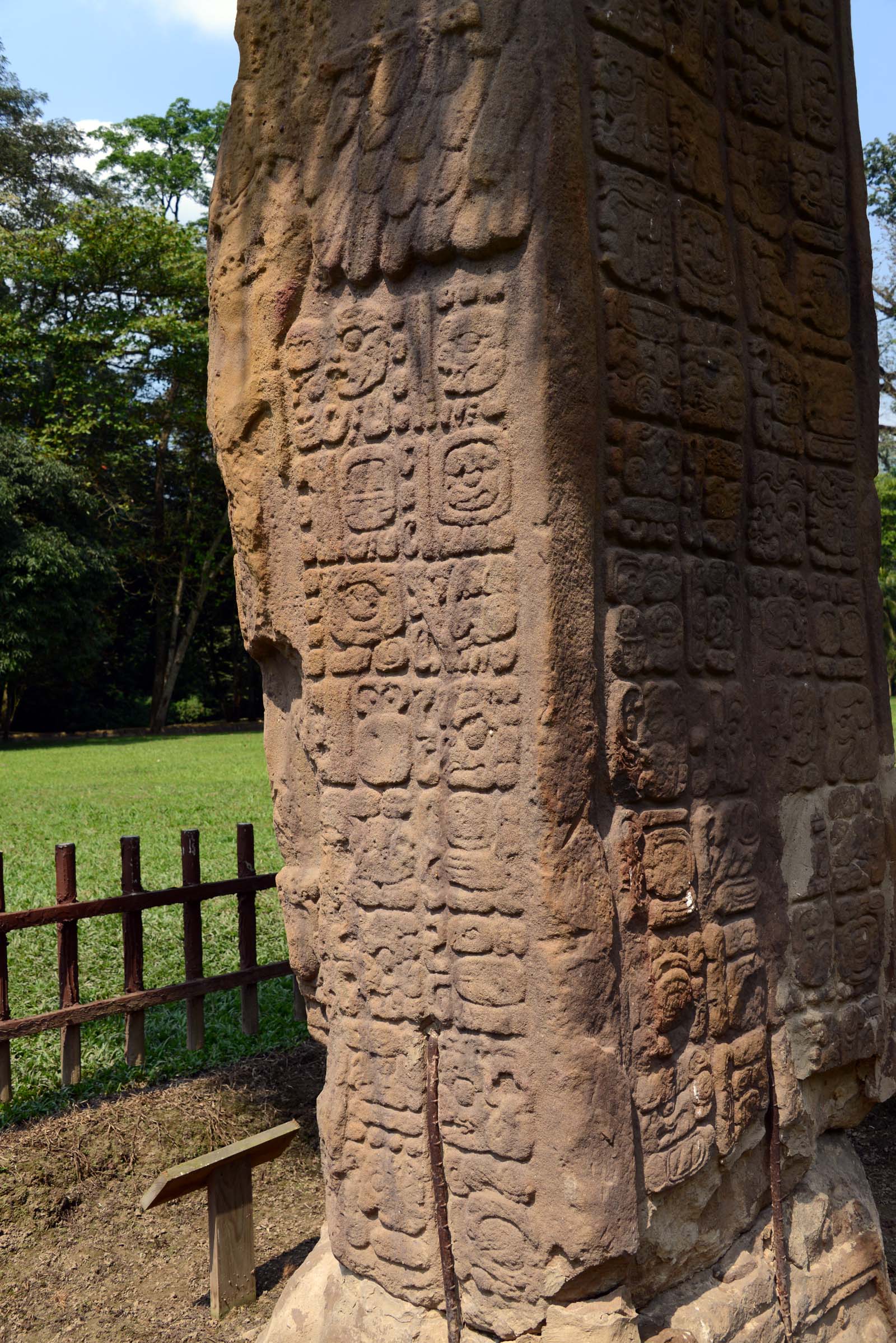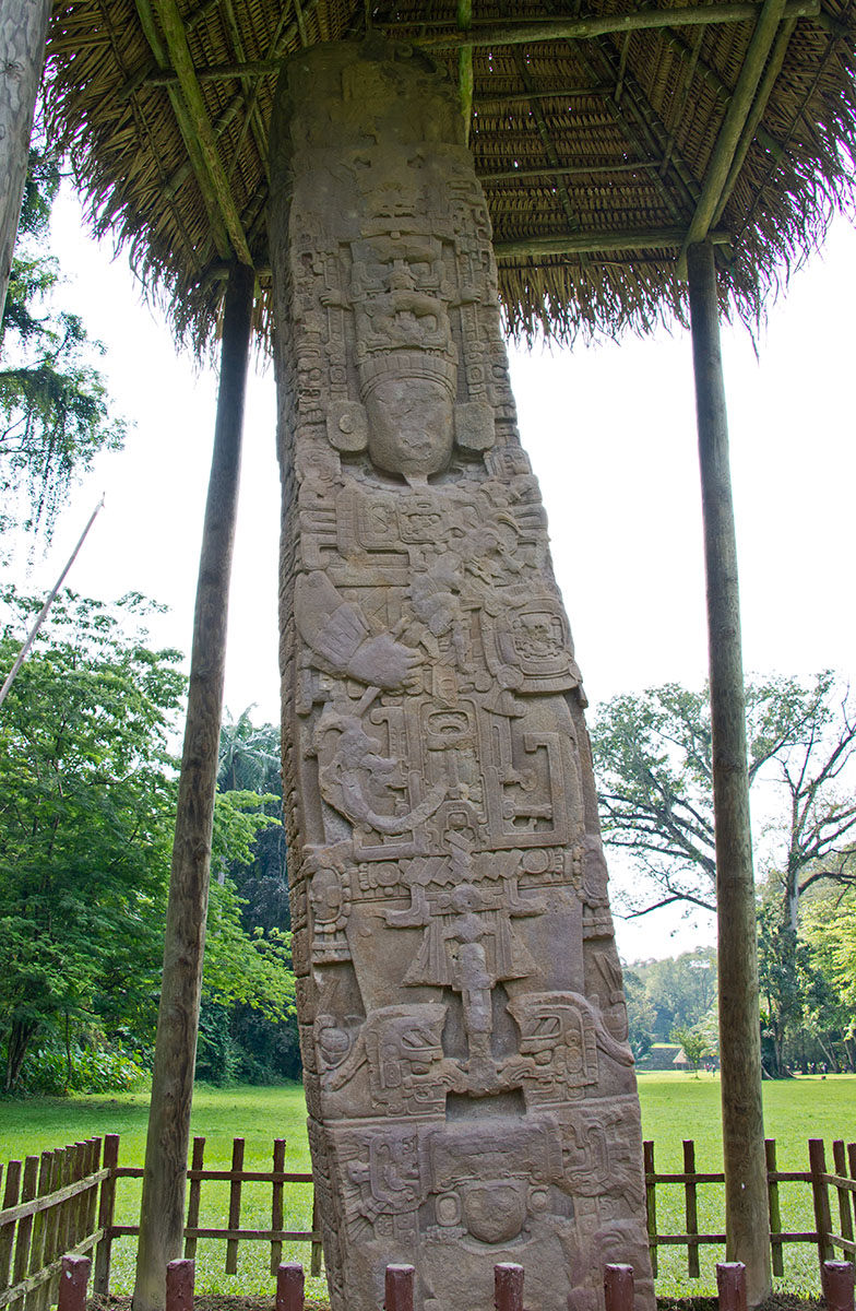 石碑E 771年(9.17.0.0.0.) に建てられ、カック・ティリュウが南北両面に彫られており、高さ7.6m、地下も合わせとると11.7mと最も高い、立派な石碑。