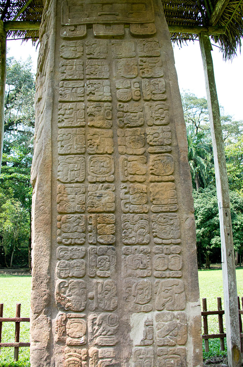 石碑C 775年にカック・ティリュウにより石碑Aと一対で奉納された。マヤ創生となる13バクトゥンが記されていて、2012年12月21日の人類終末論の元になり脚光を浴びた。マヤ長期暦は1周期の13バクトゥン(=5000年)で、紀元前3114年8月11日から始まるとされている。2012年12月21日に最初の長期暦が終り次の周期が始まったわけです。