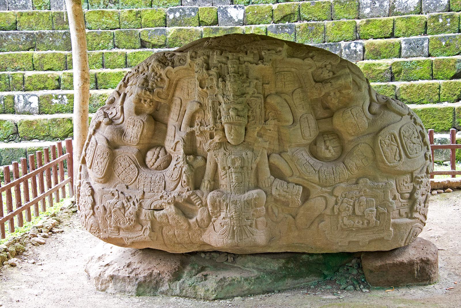獣形神G カック・ティリュウの顔が彫られ, 石碑EとFを南から見守るような位置に据えられている。カック・ティリュウの死後を継いだシュル・シエロ「空シュル」(785-800年頃)が785年に先王に捧げて建立したもので、マヤの宇宙観で大地を表すとされる亀の形で、先王の魂が亀に宿ったことを示したという説とか、蛙とジャガーを一体化した獣に宿ったという説がある。