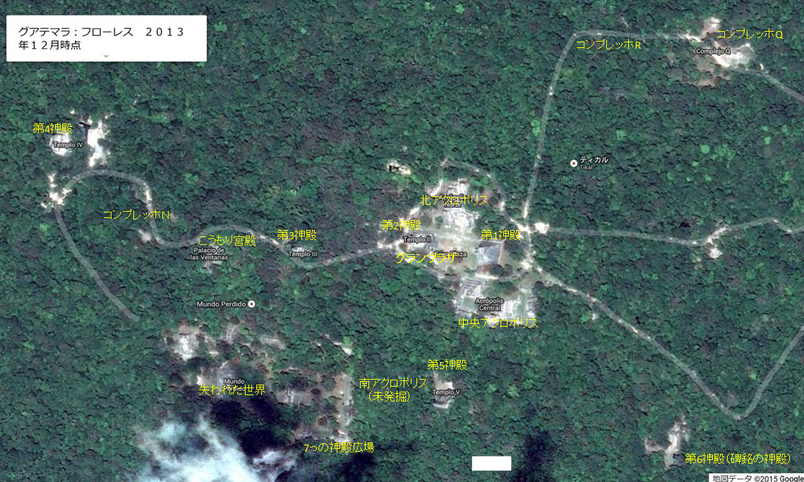 第IV神殿からの絶景 、左から、急峻な第I神殿, ずっしりした第II神殿, 工事中の第III神殿, 右端に頭だけ見える第V神殿