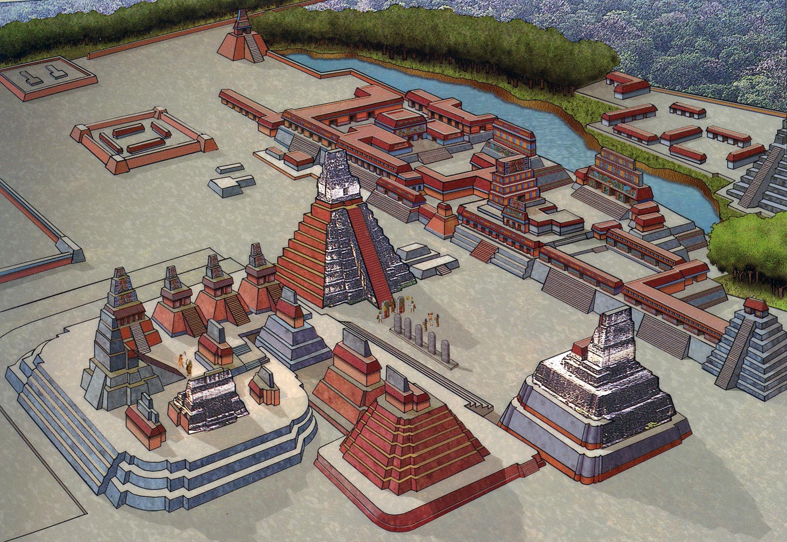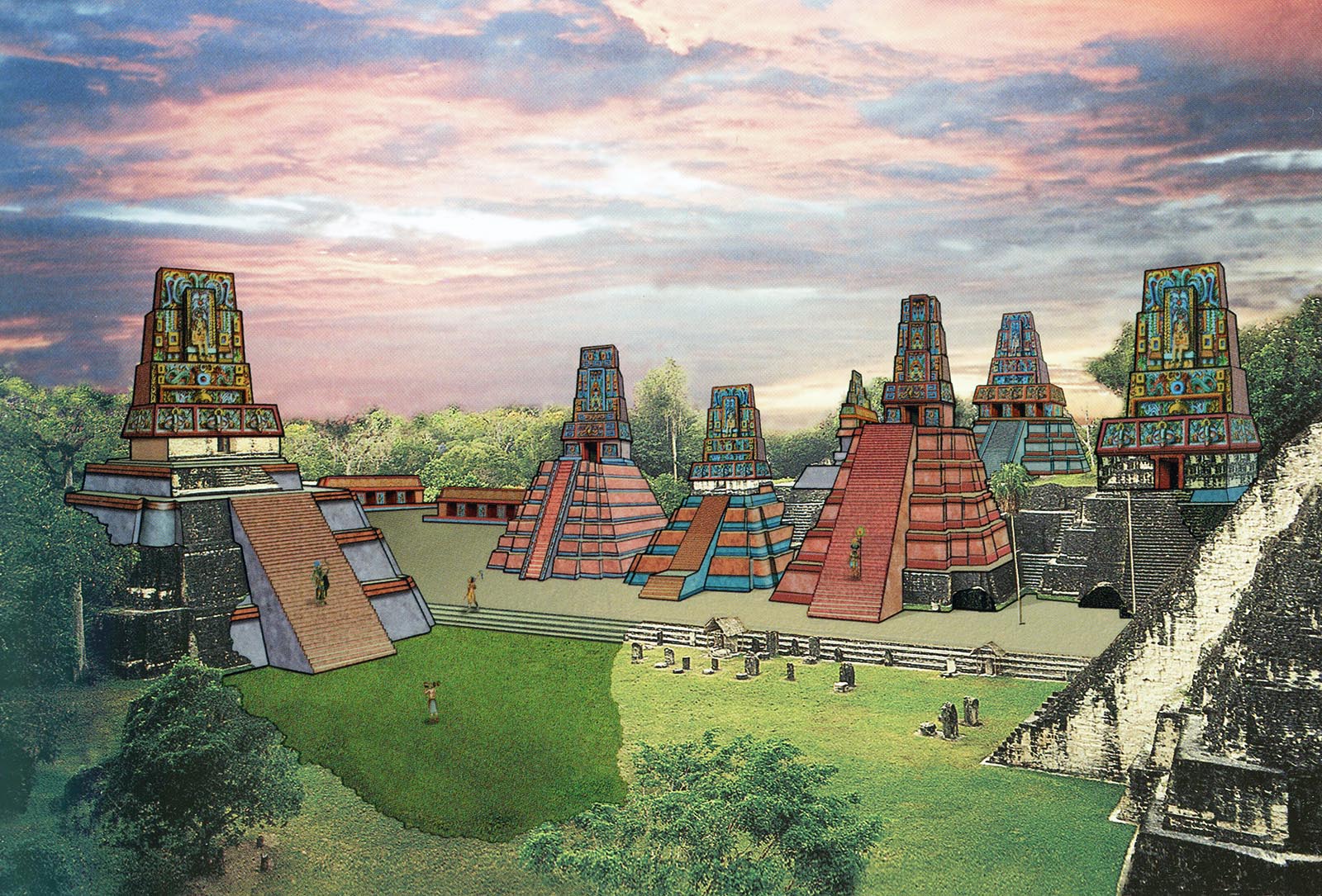 ティカル遺跡中心部の再現図 建造物の多くは赤く塗られていた(写真ガイブック「マヤ人」から)
