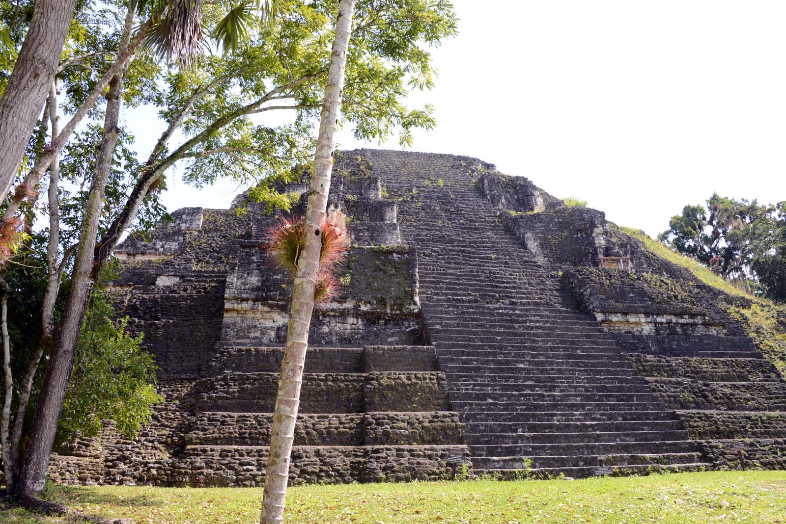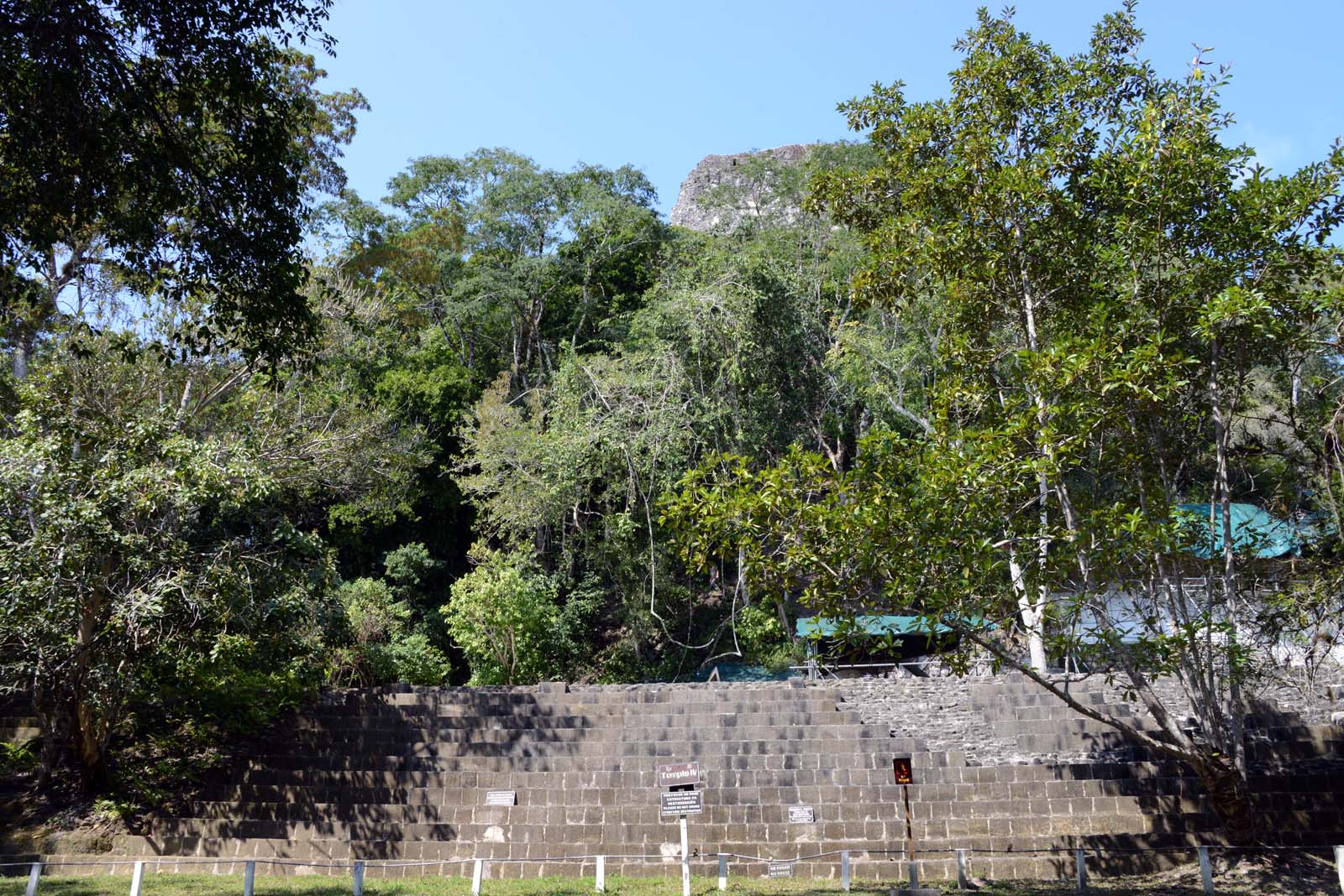 グランプラザから見た第Iの神殿 急にそびえるピラミッドと階段が特徴 奥は中央アクロポリス