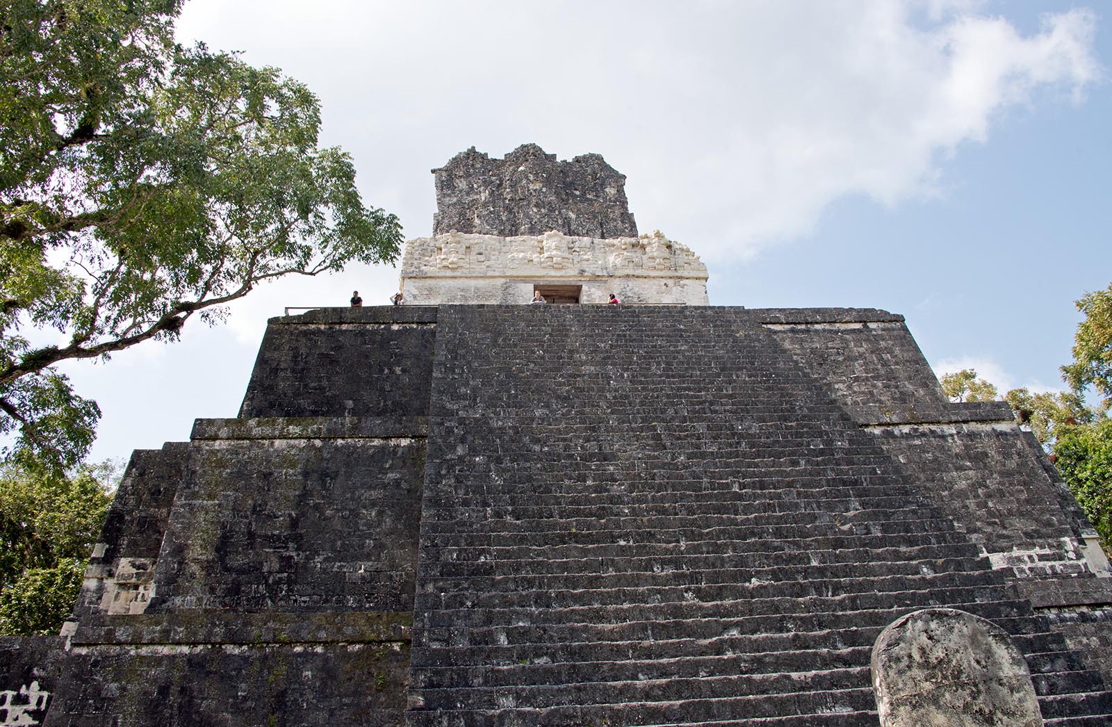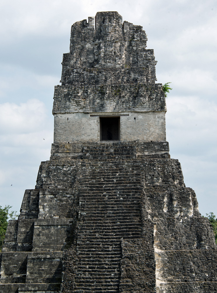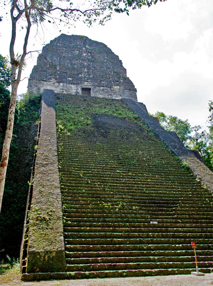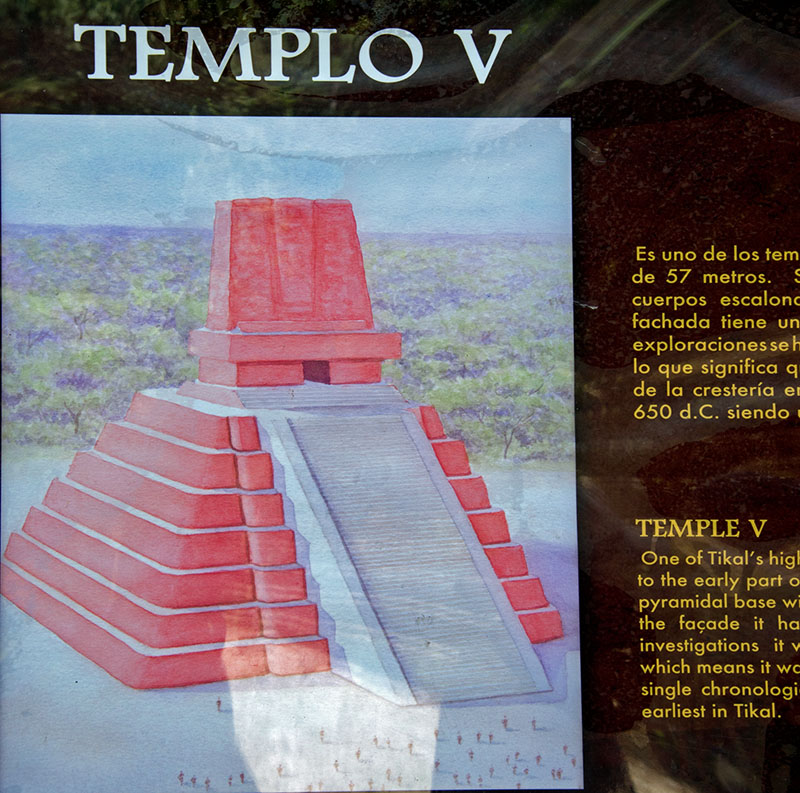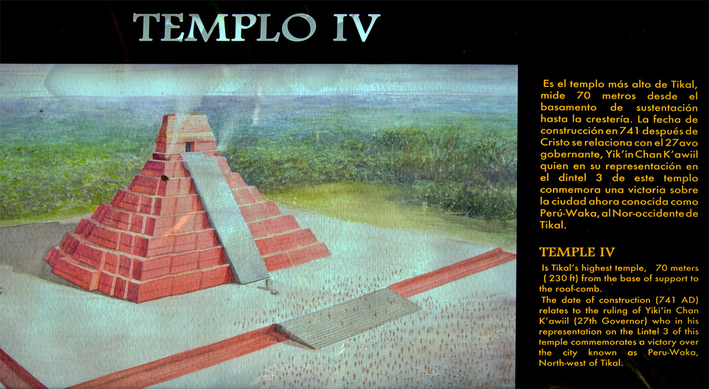 695年にカラクムルを打ち負かした ハサウ・チャン・カウィール王 (682-734AD) により 700AD 頃に造られた高さ52mのピラミッド。九層の急勾配の基壇上に神殿が築かれ、高く大きな屋根飾りで 上部が装飾されたティカルの代表的な建造物。屋根飾りの装飾は風化が激しいが、当時はクリーム色、赤、緑、青に塗られ、ピラミッド全体は赤く仕上られていたようです。
