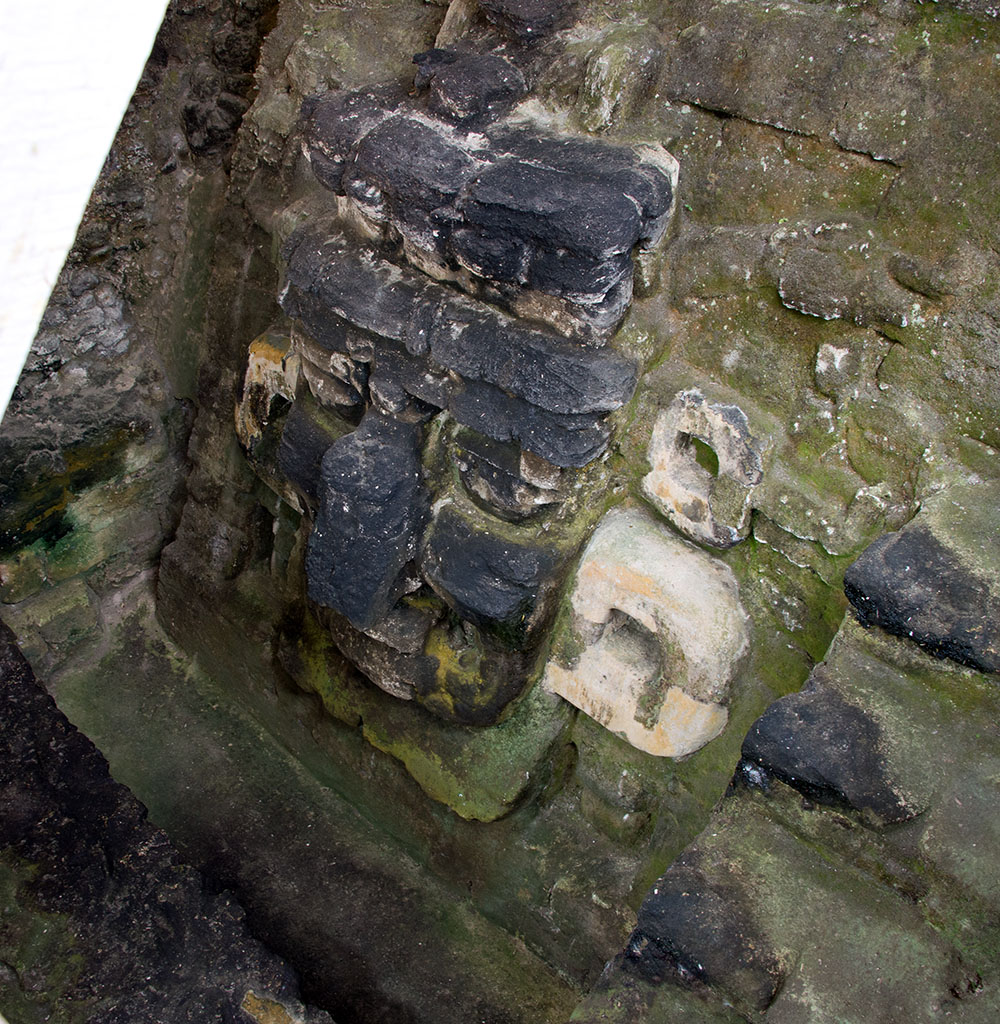 ジャガー神殿頭部 神殿の中にジャガー神がまつられ極彩色の跡かたもなく、一部崩れている。