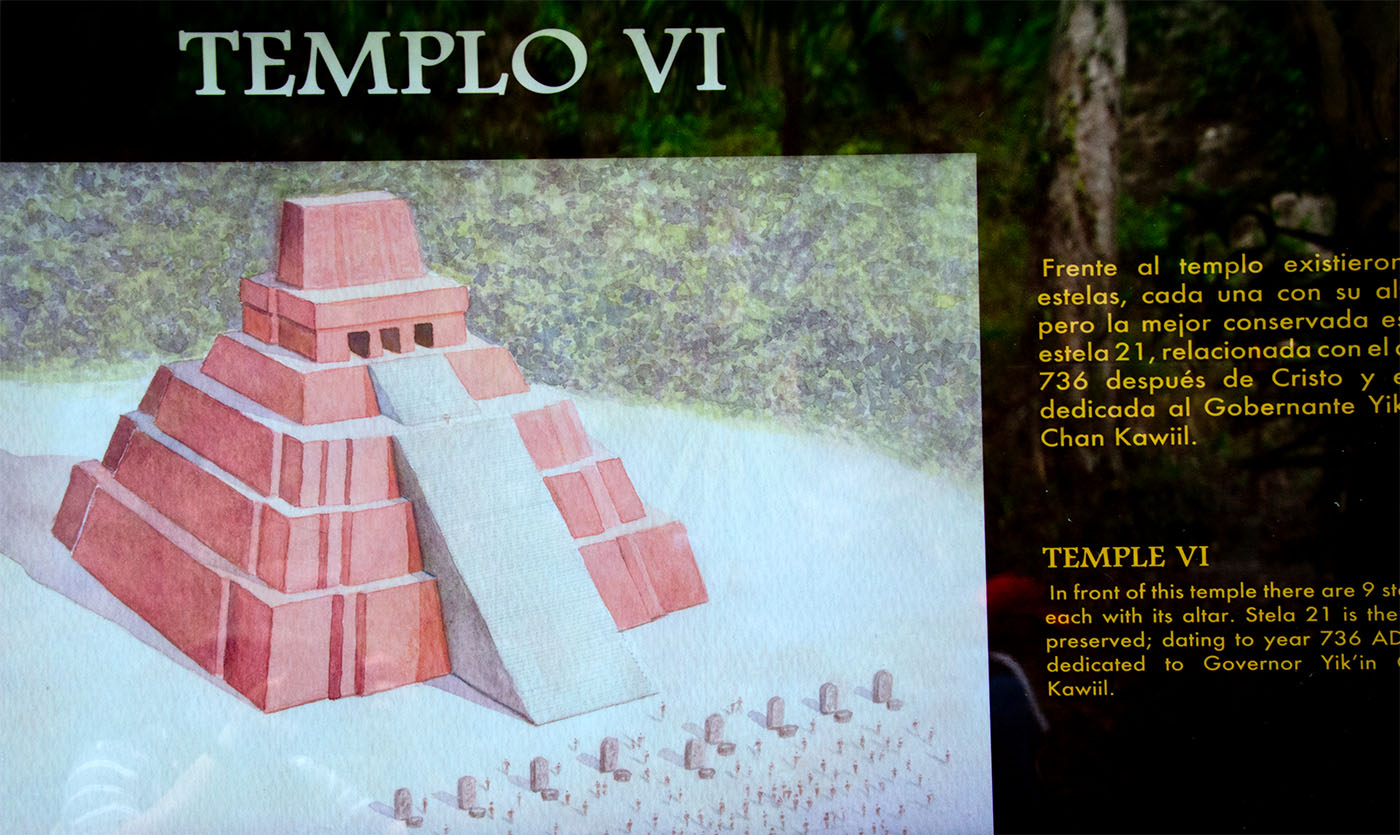 ハサウ・チャン・カウィール王 (682-734AD) の時代に造られた高さ38mのピラミッド。基壇は三層でずっしりとしており、第Iの神殿とは対照的に女性的であり、王妃のために建設されたとされる。上部の神殿は大きくレリーフが多く、屋根飾りも大きく、彩色も第I神殿と同様に綺麗であった。後ろに作られた木の階段で楽に登れる。