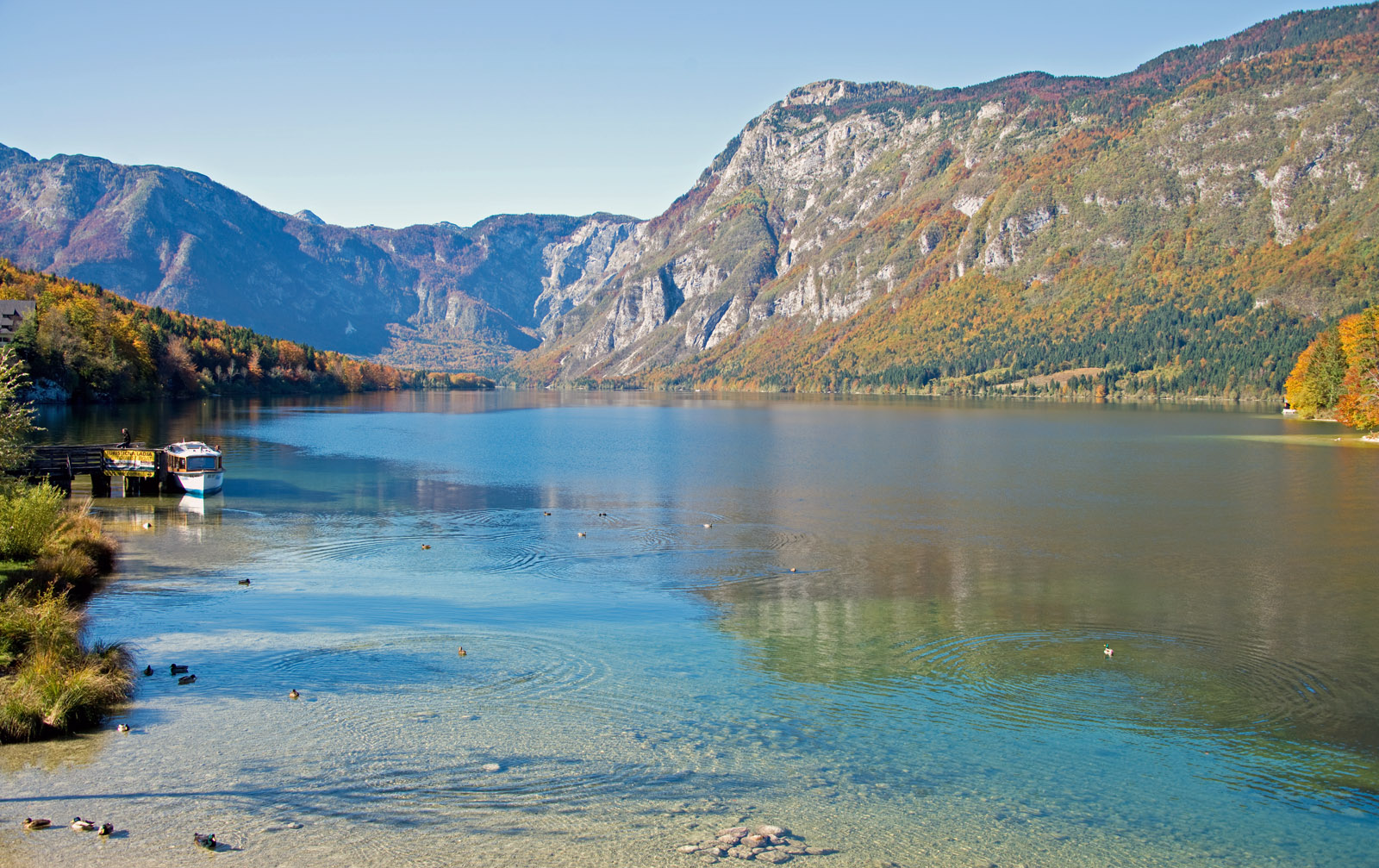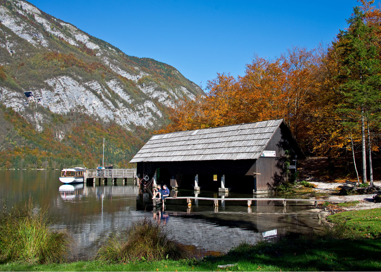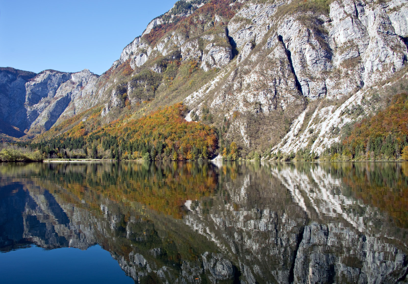 ボーヒン湖はブレッド湖から南西に30kmに位置する。ユリアンアルプスのトリグラフ国立公園の中にあり、澄んだエメラルドグリーンの幻想的な湖である。湖面に映る周囲の山の紅葉と岩肌が素晴らしいです。