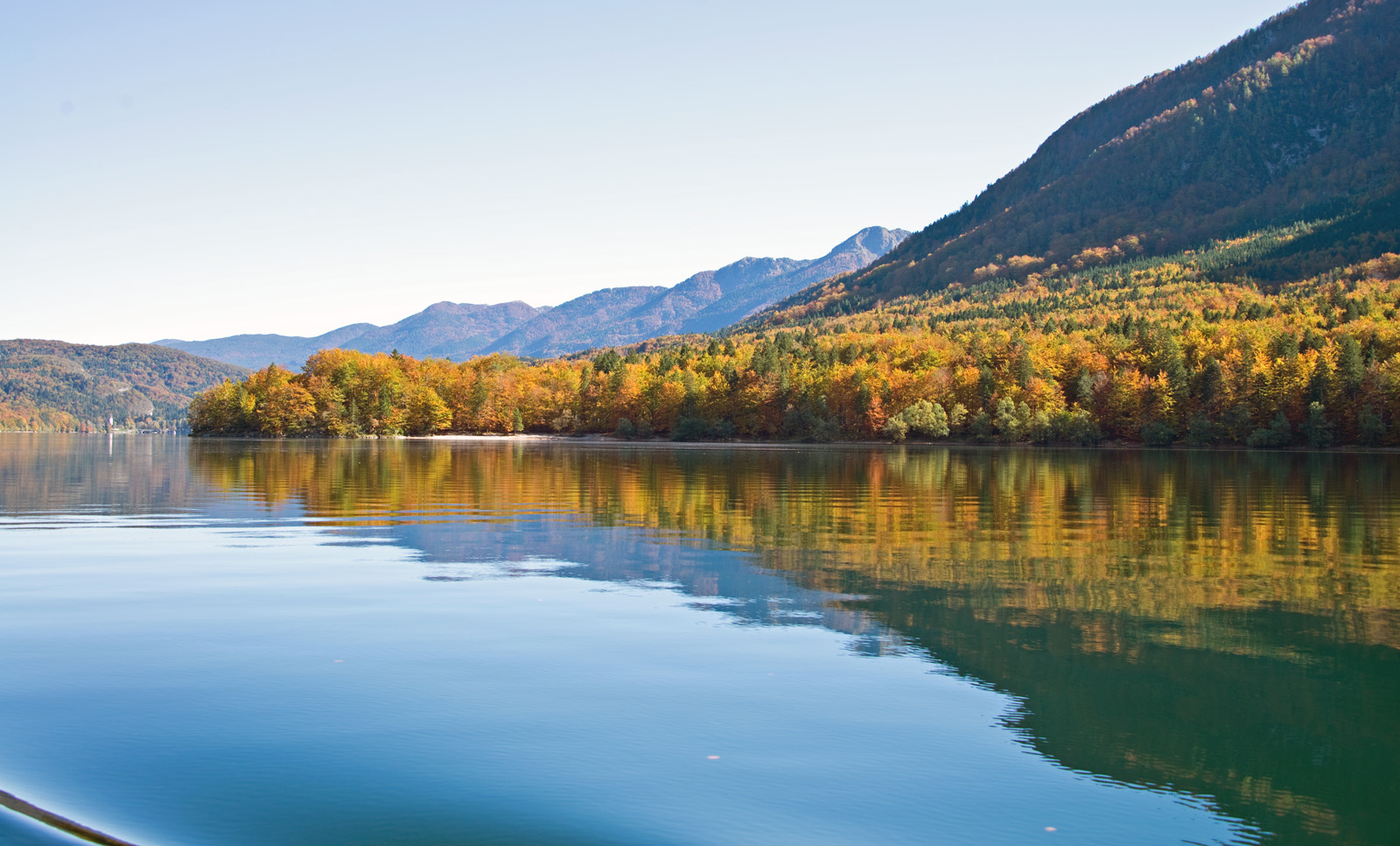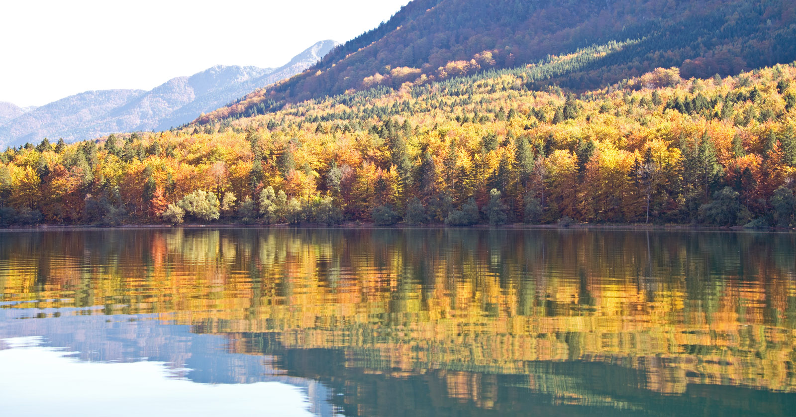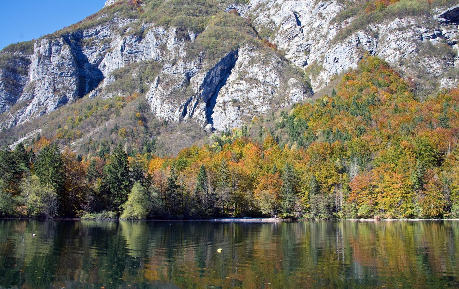 ボーヒン湖はブレッド湖から南西に30kmに位置する。ユリアンアルプスのトリグラフ国立公園の中にあり、澄んだエメラルドグリーンの幻想的な湖である。湖面に映る周囲の山の紅葉と岩肌が素晴らしいです。