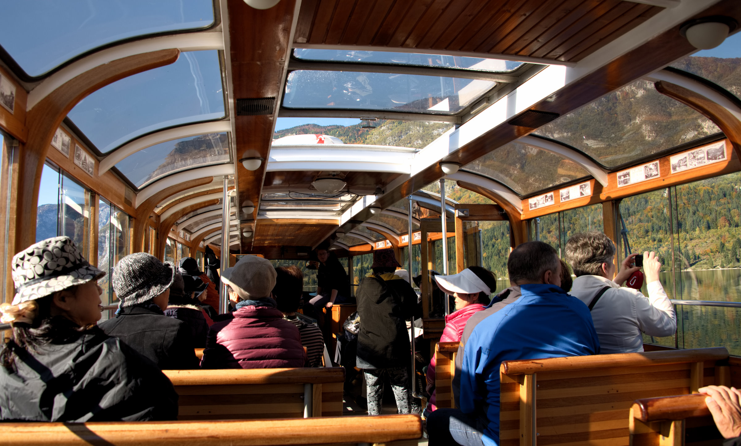 鏡のような湖面に船が起こす波、黄葉や山々が鮮やかに写る、聞こえるのは客の歓声のみ。