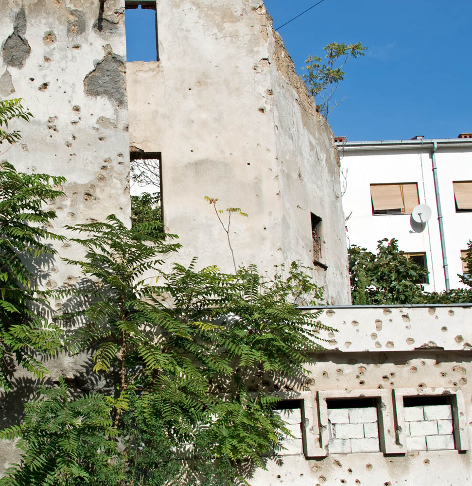 モスタル市街の廃墟には内戦で残された銃弾の跡 |