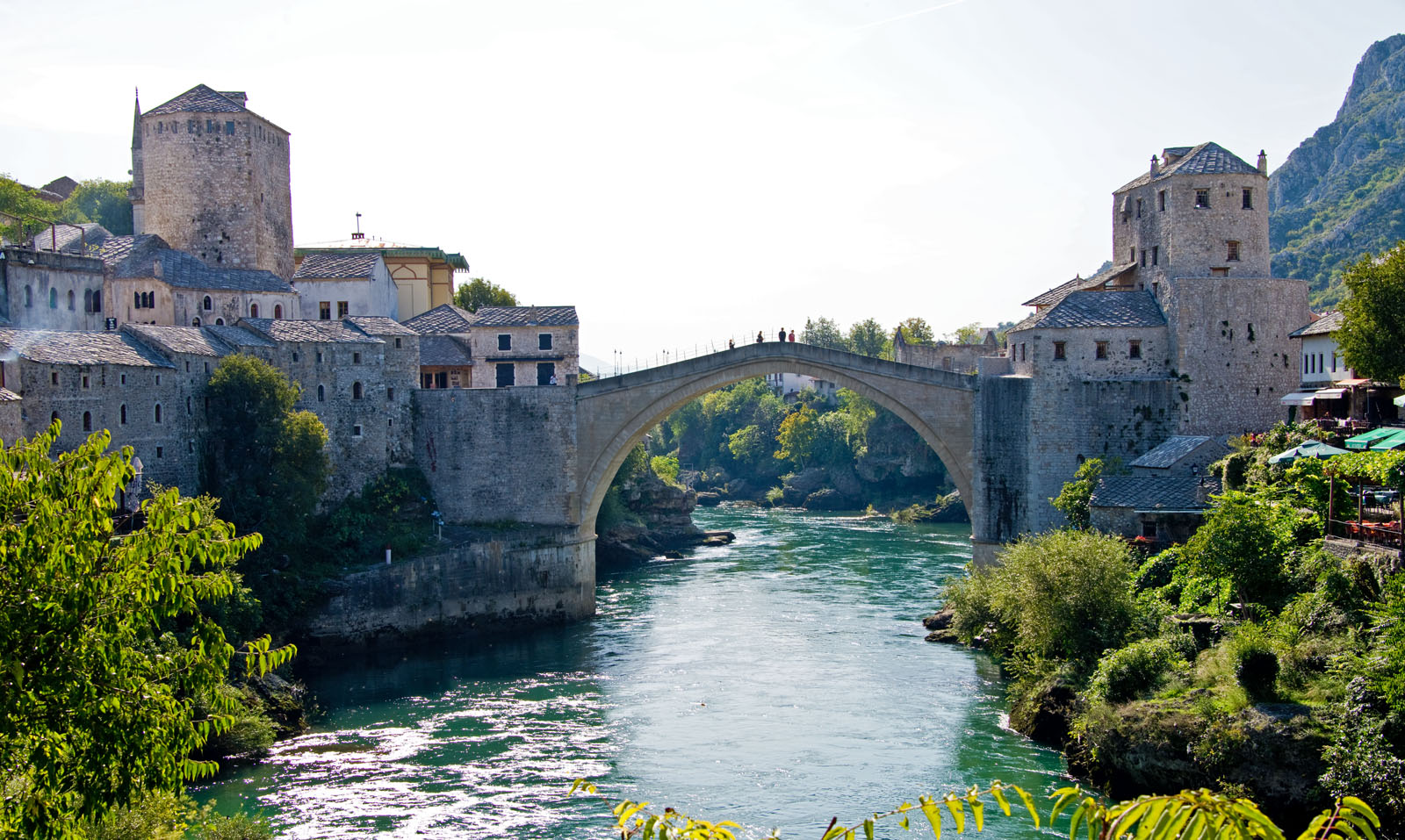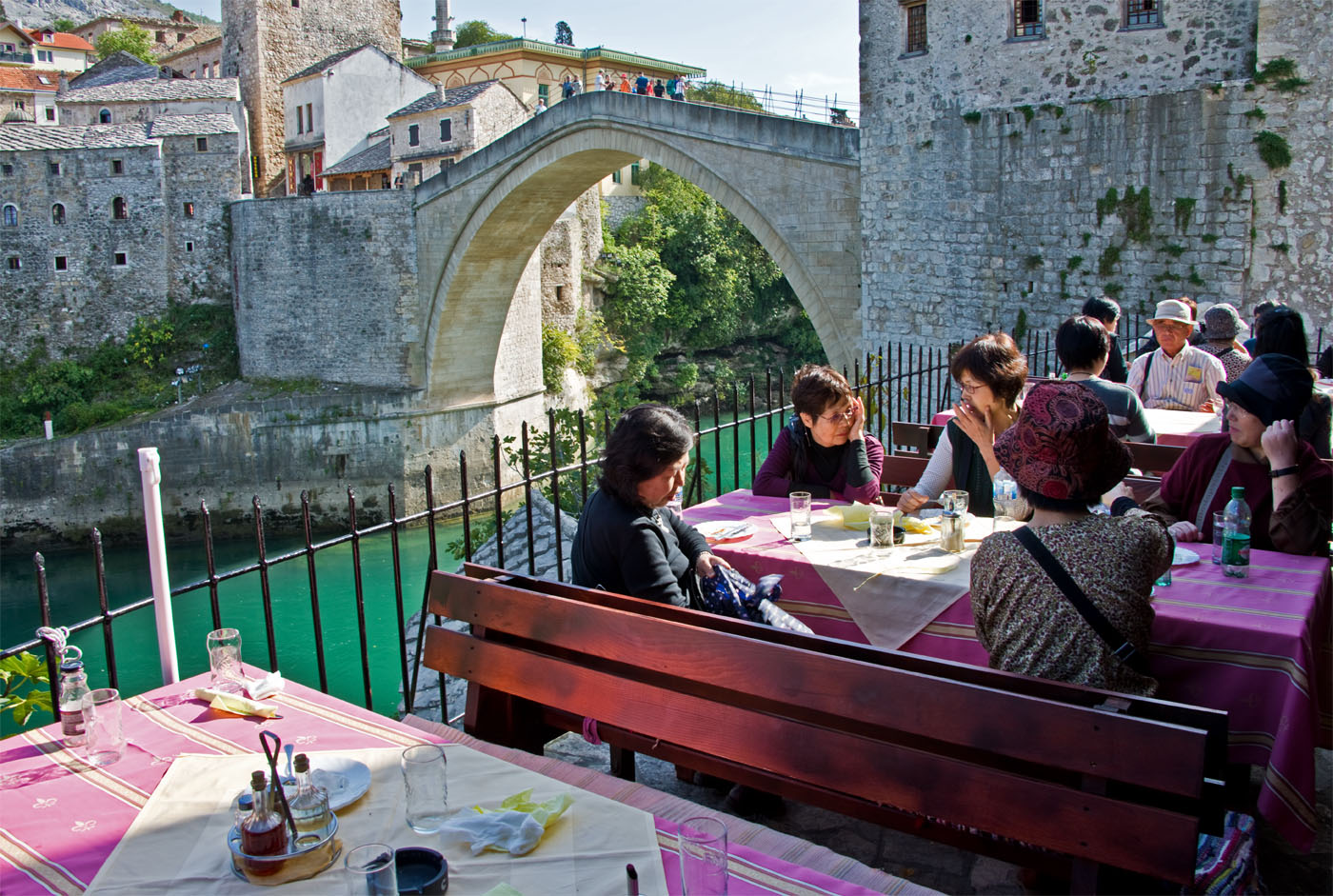 スタリ・モスト(Stari Most)は1566年のオスマン帝国の時代に建設されたトルコ洋式の美しい橋である。全長30メートル、水面からの高さは最大24メートルの石灰岩でできたアーチ橋です。この橋の両側には、要塞化された塔が備えられており、北東にあるのがヘレビヤ塔 (Helebija) 、南西がタラ塔 (Tara) である。この2つは「モスタリ」 (mostari)と呼ばれ、その意味は「橋の護衛者たち」である。 この橋もボスニア・ヘルツェゴビナ紛争でクロアチアのロケット弾によって崩れ落ちました。1995年に紛争が終結すると、1997年から橋の再建工事が始まりました。まずは、川底から破壊された橋の残材を拾い集める作業を行い、その後、残材を乾燥させる作業を行いました。足りない石材は、創建当時と同じ地元の石灰岩が使用されました。ユネスコの支援を受けたトルコ企業によって、創建当時の技法を使って、2004年6月23日に建設当時の姿が再建されました。