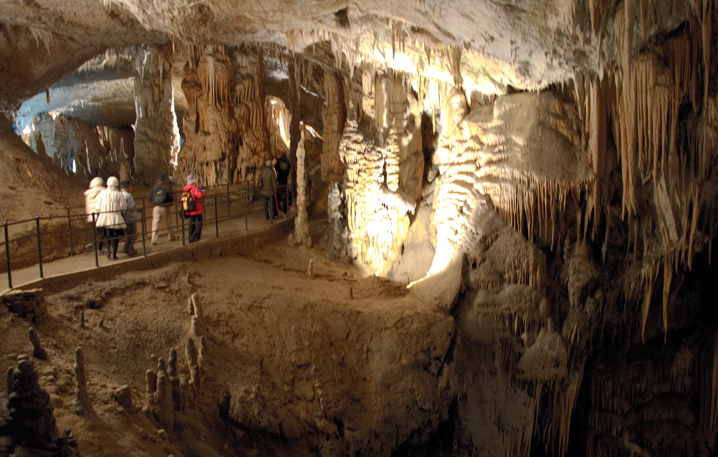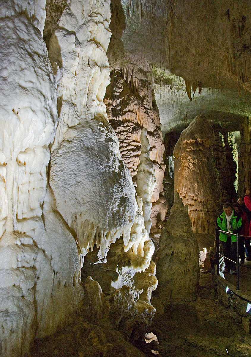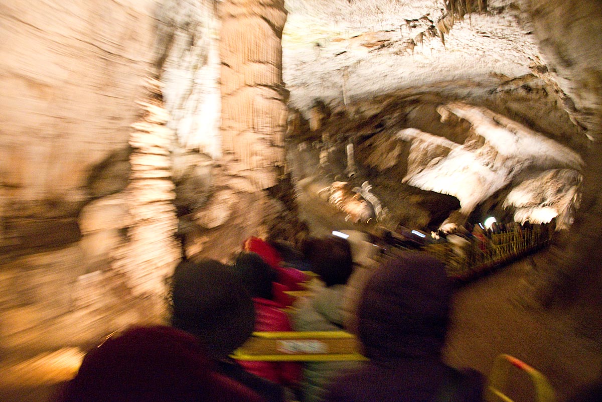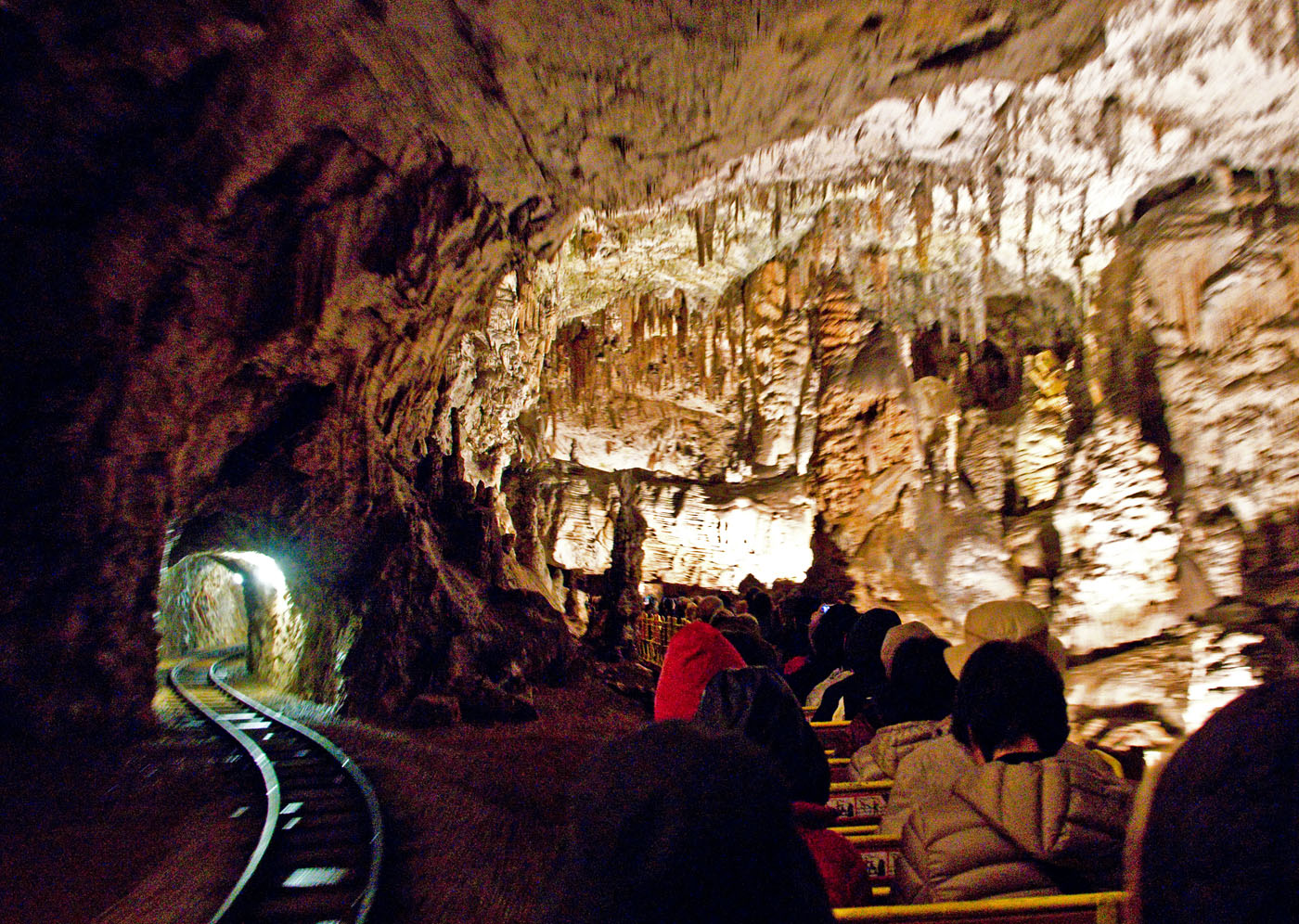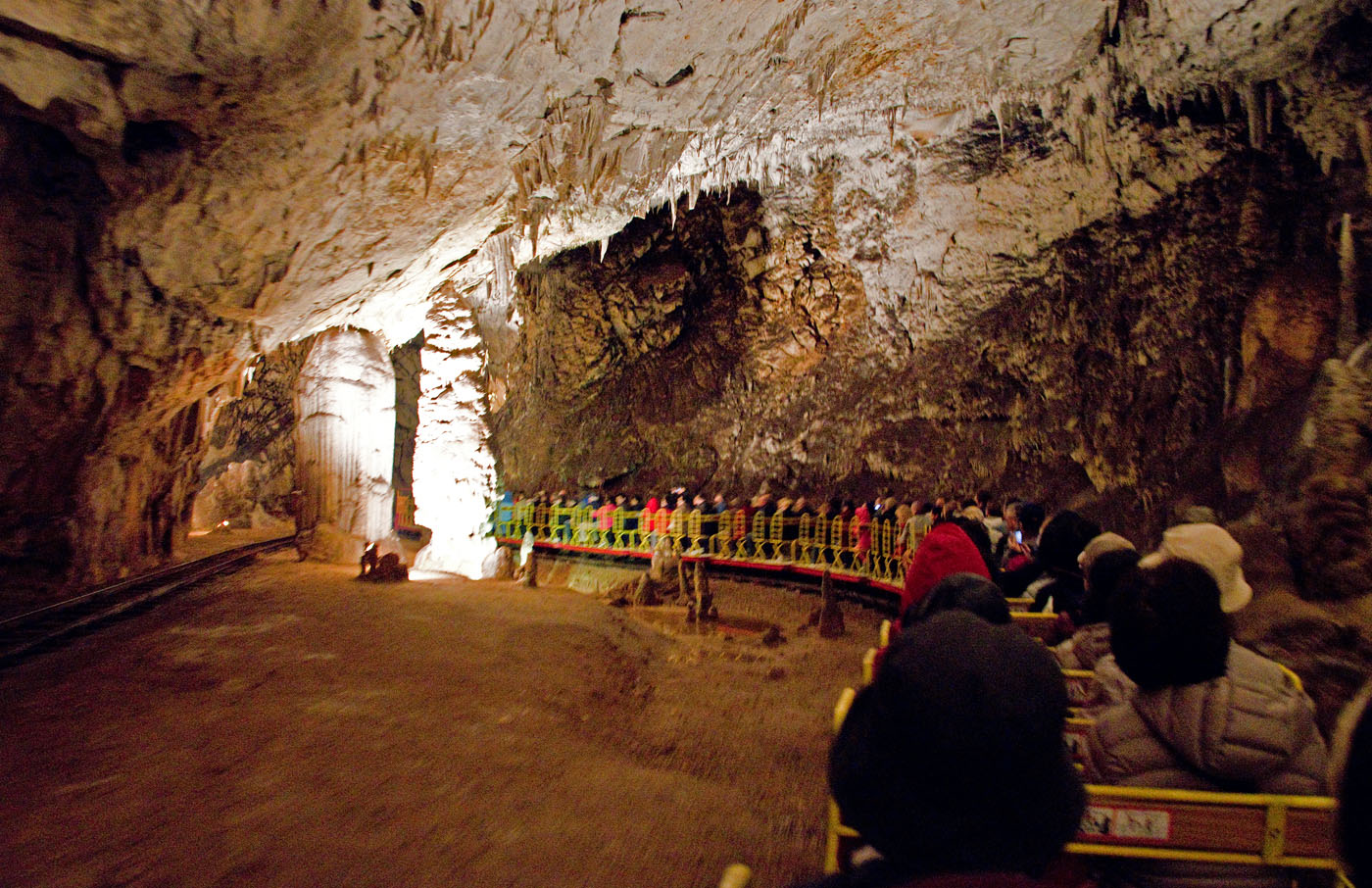 トロッコから下車し、2km程度徒歩で観覧する。「高層建築」と呼ばれるところから、大きい山(ヴェリカ・ゴラ)という洞窟の山に登り、ノアの箱舟などの石筍を見る。数々の鍾乳石を見ながら山を下り、ロシア橋を渡る。この橋は、第一次世界大戦の間、ロシア捕虜によって建設されたものである。そして鍾乳洞は最も美しい洞窟(レペ・ヤメ)に続く。ここではスパゲティホール、白のホール、赤いホールを巡る。「スパゲティ」と呼ばれる美しい細く繊細な中空状の氷柱のような形状の鍾乳管がある。最も美しい「ブリリアント」を見て、高さ40m、広さ3000平方mの大きなコンサート・ホールと呼ばれる空間に至る。実際にコンサートが開催され1万人を収容でき、ショップもある。ここから帰路の電車に乗る。