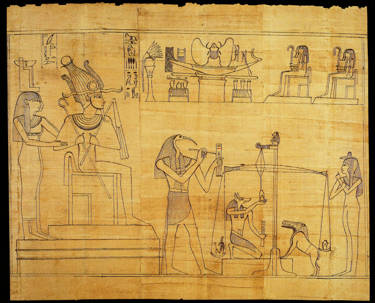 ![]() ネシタネベトイシェルウの死者の書、オシリスの前でトトが死者の心臓の重さを量る場面 |