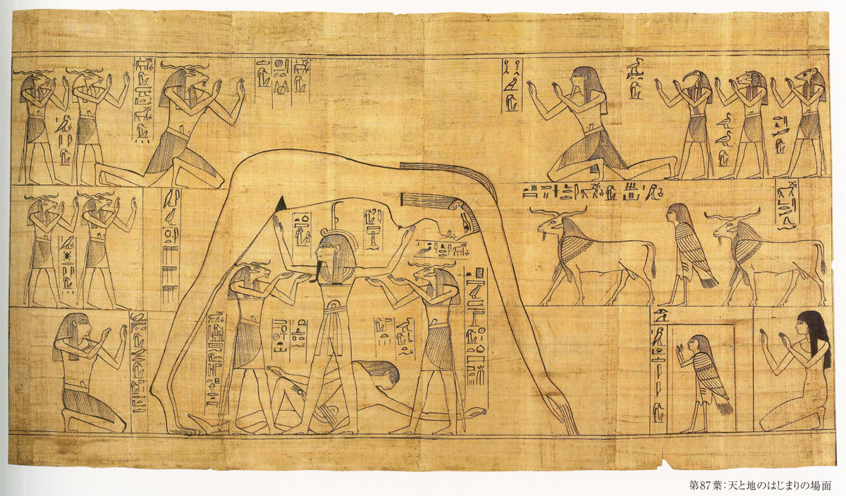 ![]() ネシタネベトイシェルウの死者の書、天と地の始まりの場面 ヌト(天空の神) とゲブ(大地の神)が描かれている。 |