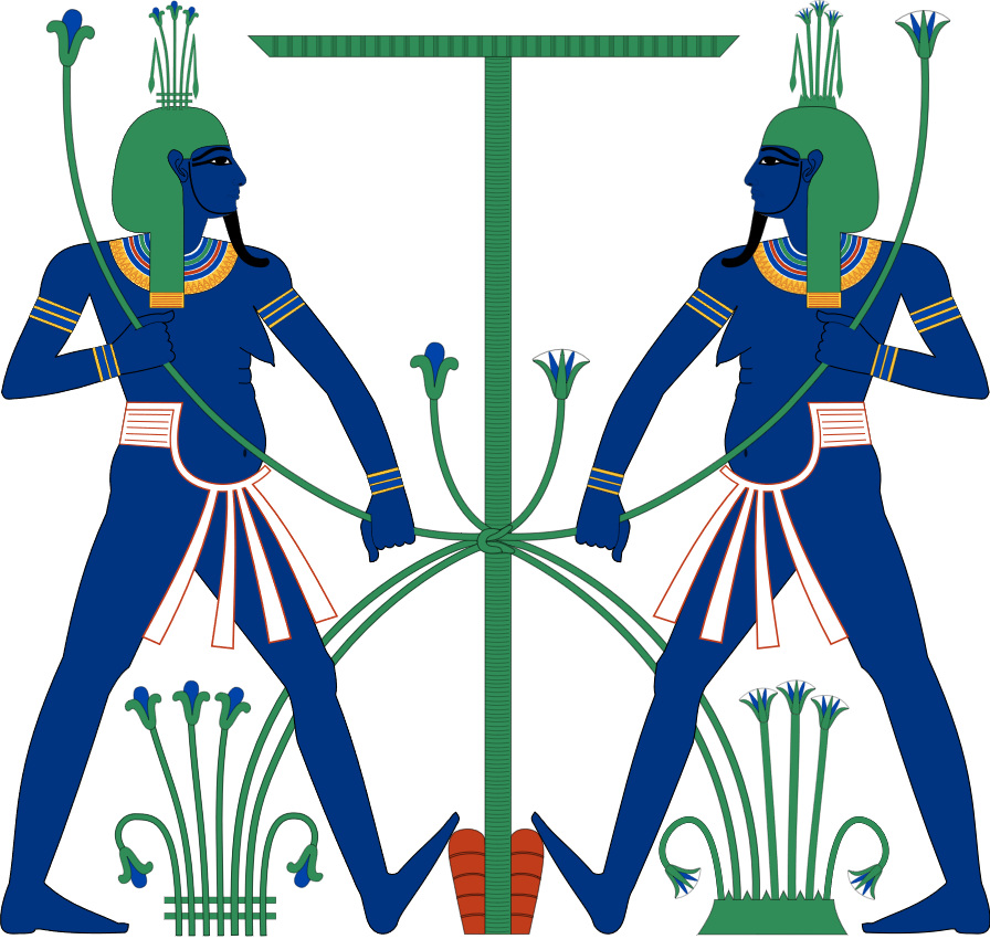 ![]() ハピ(Hapi) ナイル河の神の神 頭の植物はナイルの象徴パピルス。 二人のハピがパピルスで呼吸を意味する文字を縛っている 上下エジプトの統一を意味する。 |