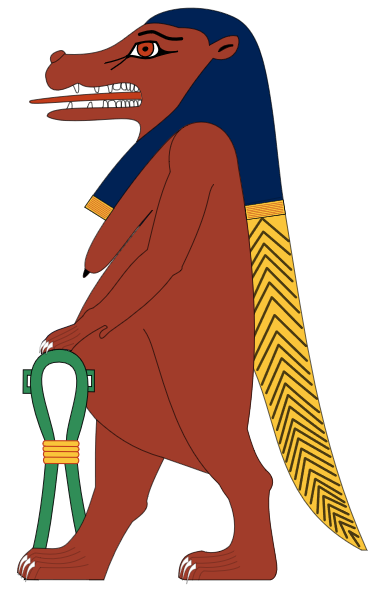 ![]() タウエレト(Tawaret) 大いなる母。 大きな乳房と護符「サァ」を持つ 雌のカバの姿 |