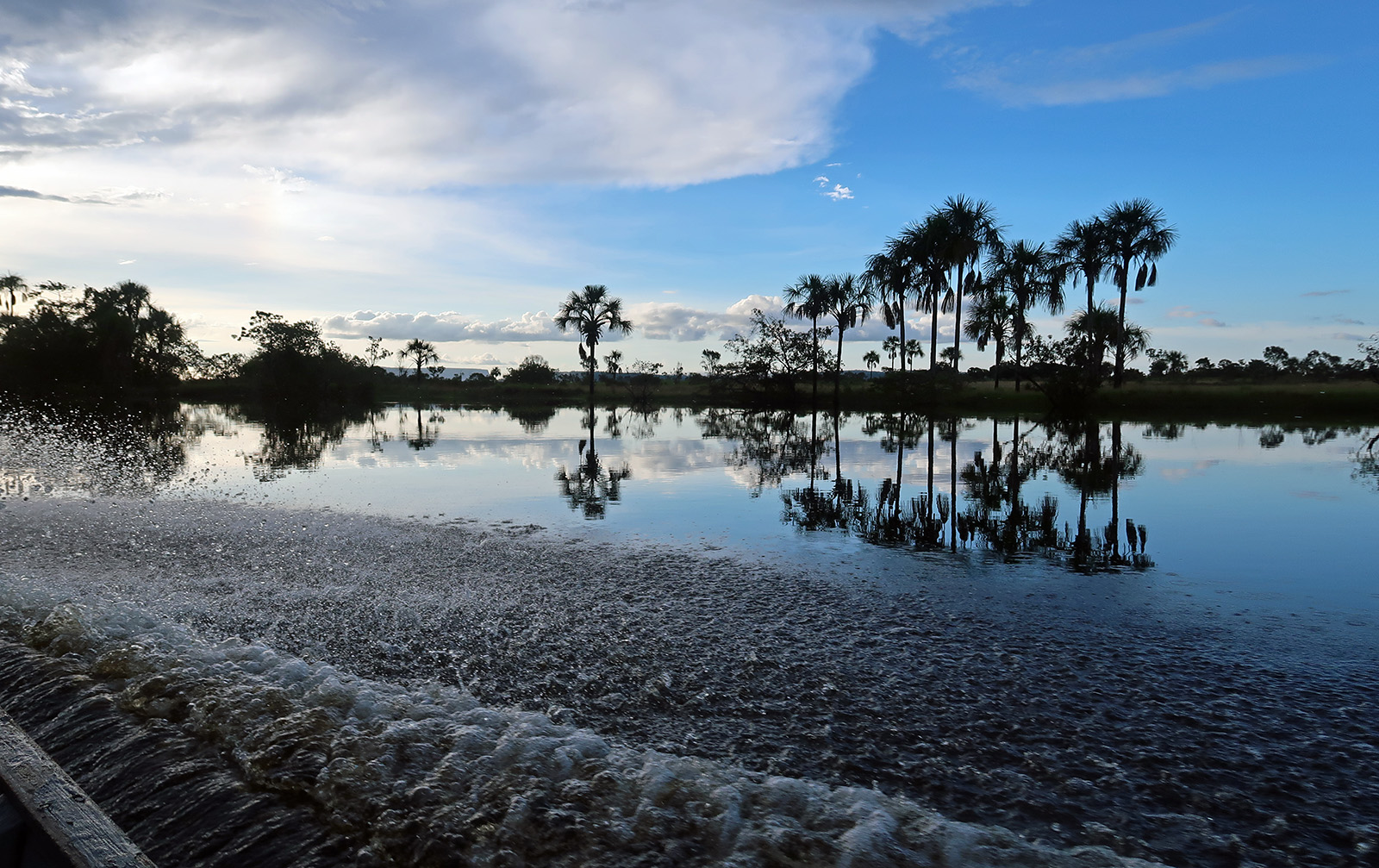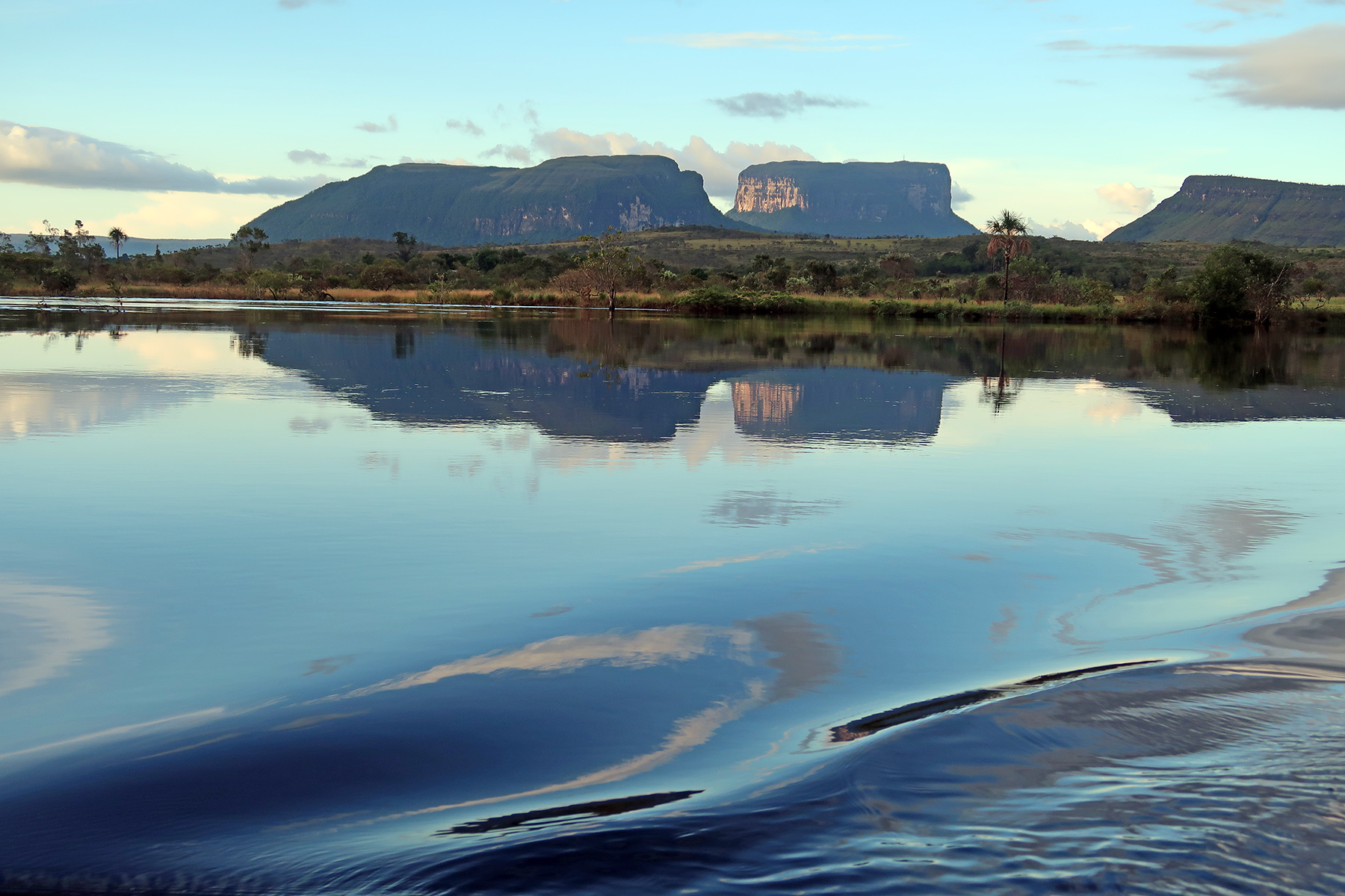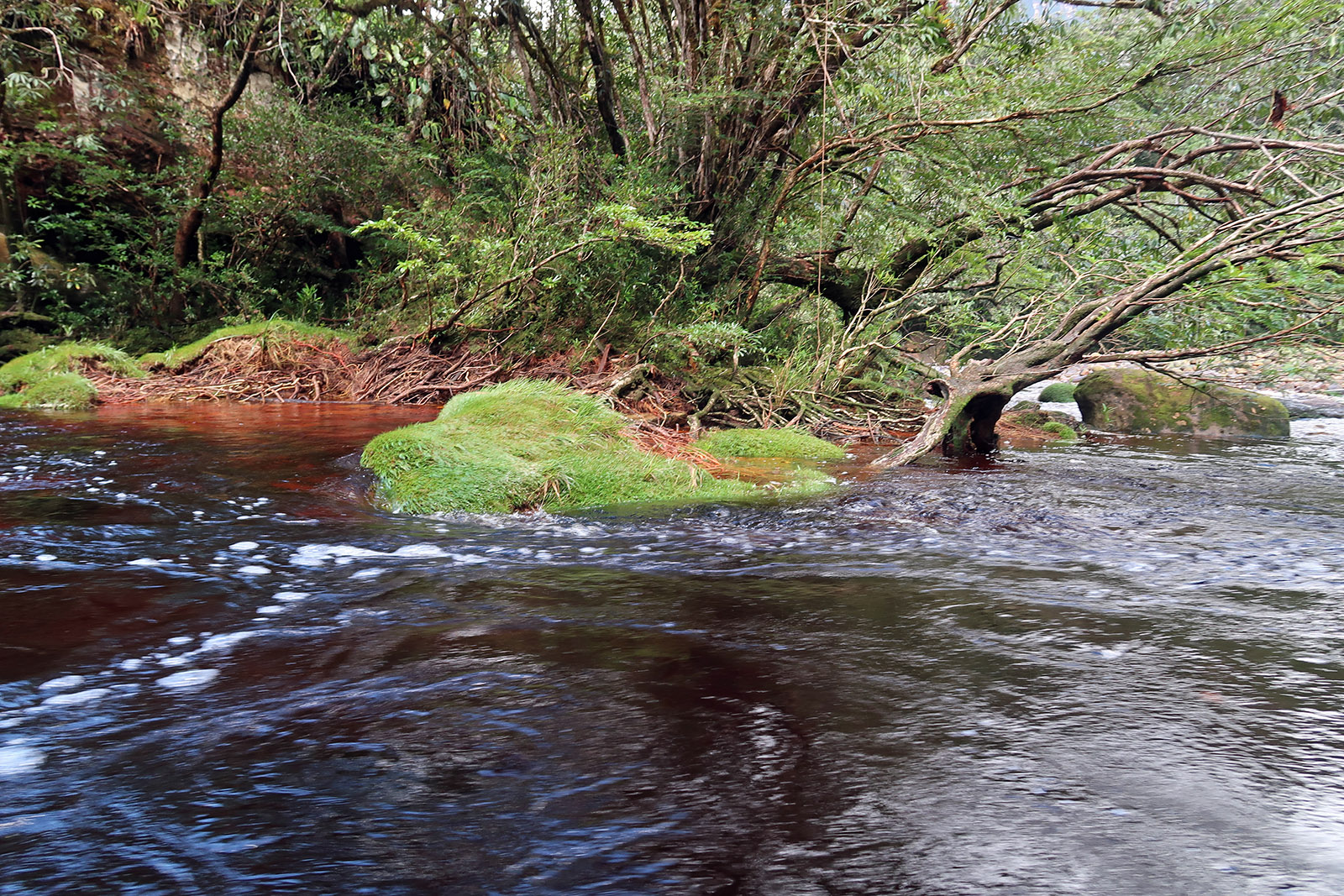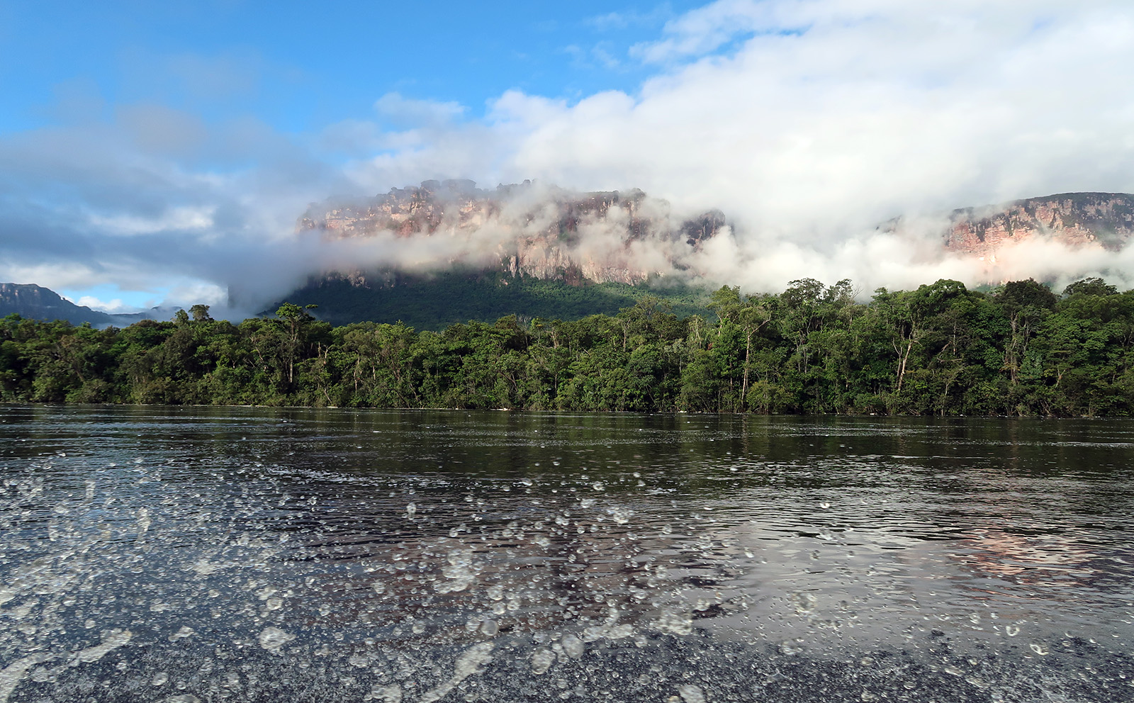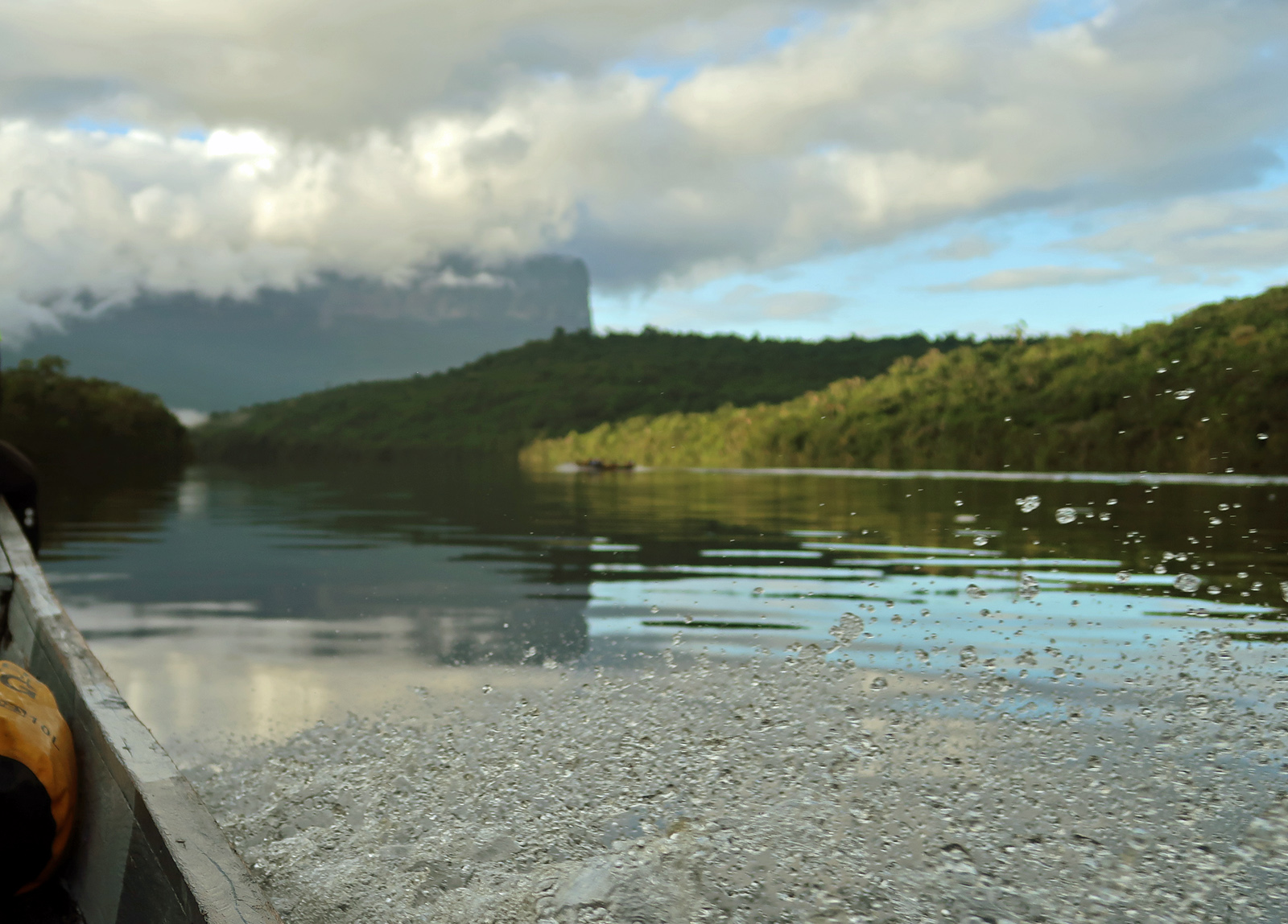 両側のジャングルとテプイが美しい。川幅の広いところは水面は穏やかで乗り心地は悪くない。 |