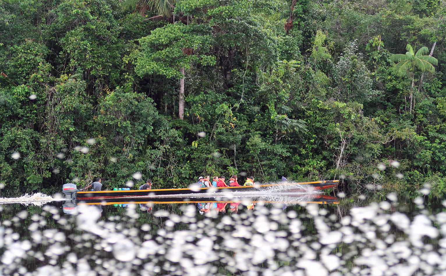 カナイマからボートで、アウンヤンテプイを見ながら、カラオ川、チュルン川を遡り、エンジェルフォールの入口であるラトンシート島まで行く、距離:70km、所要:4時間。